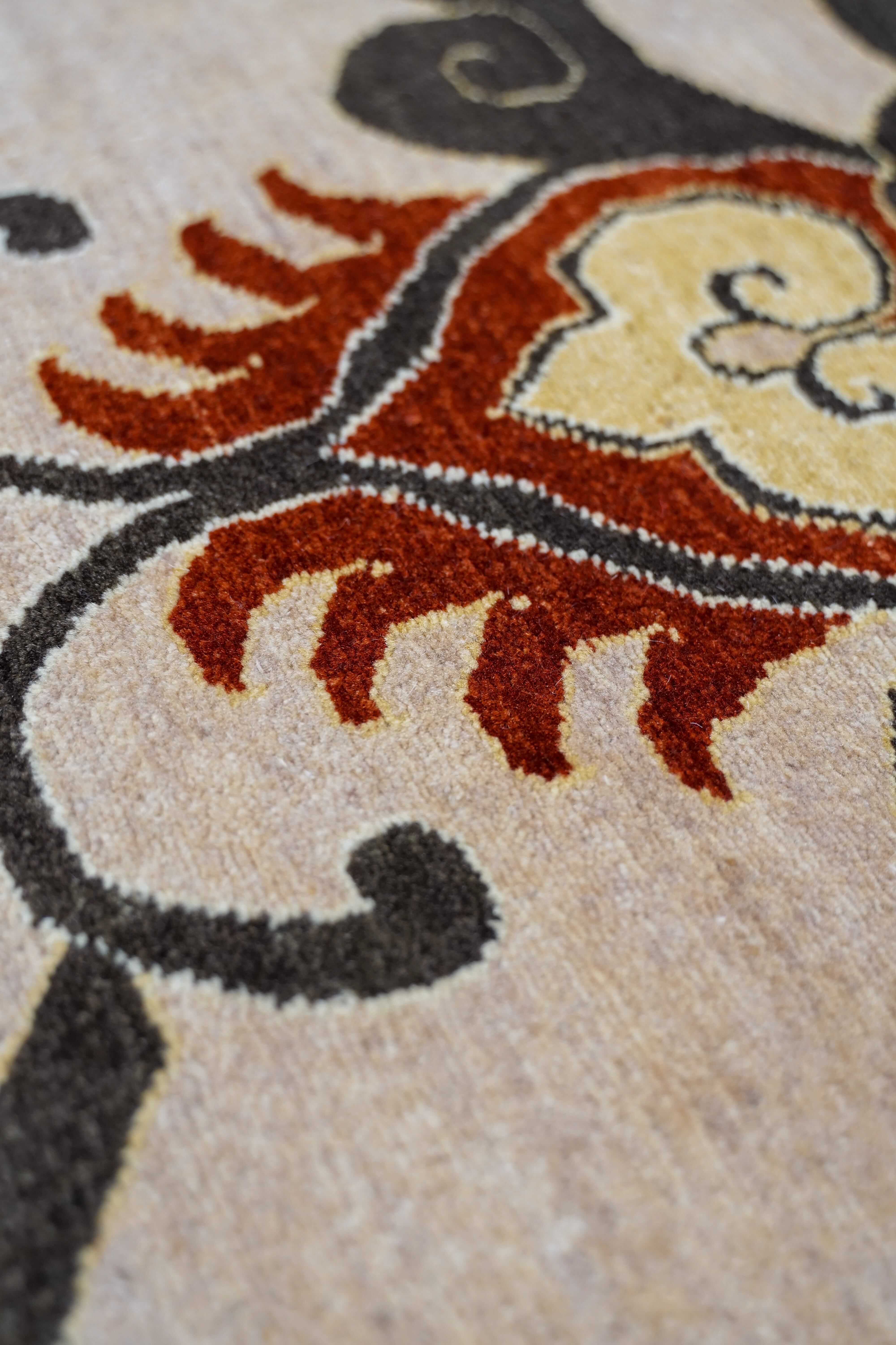 職人が一結び一結び真心こめて織った手織り絨毯は、耐久性に優れていてホームケアが可能です。実用性が高く、長く使用できるためプレゼントにも人気があります。ウールは、熱伝導率が低いため、夏涼しく冬あたたかな天然素材です。通気性に優れていて熱がこもらないので、床暖房や畳の上でも安心してお使いいただけます。