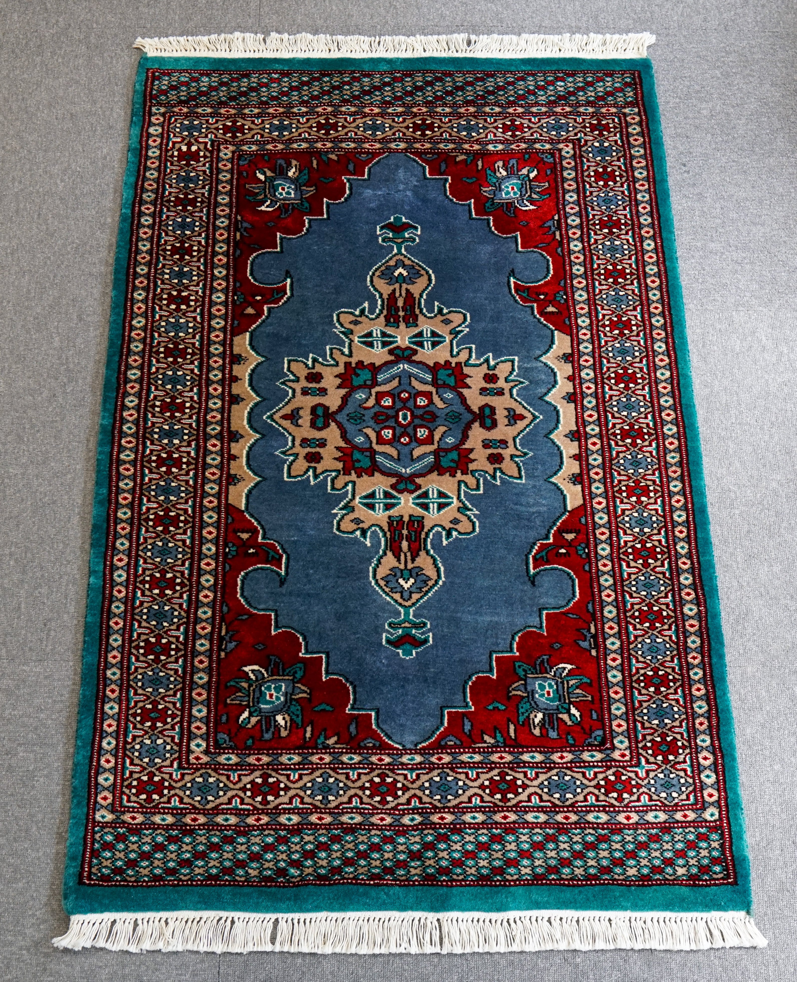 ニュージーランド産の上質なウールを使用し、信頼できる熟練した職人が手織りしたパキスタン絨毯です。ニュージーランド産のウールはタンパク質をたくさん含んでいるためハリ、艶に富むのが特徴です。肌触りはなめらかで柔らかく、弾力のあるパイル地が底冷えを防ぎ足元を快適にします。