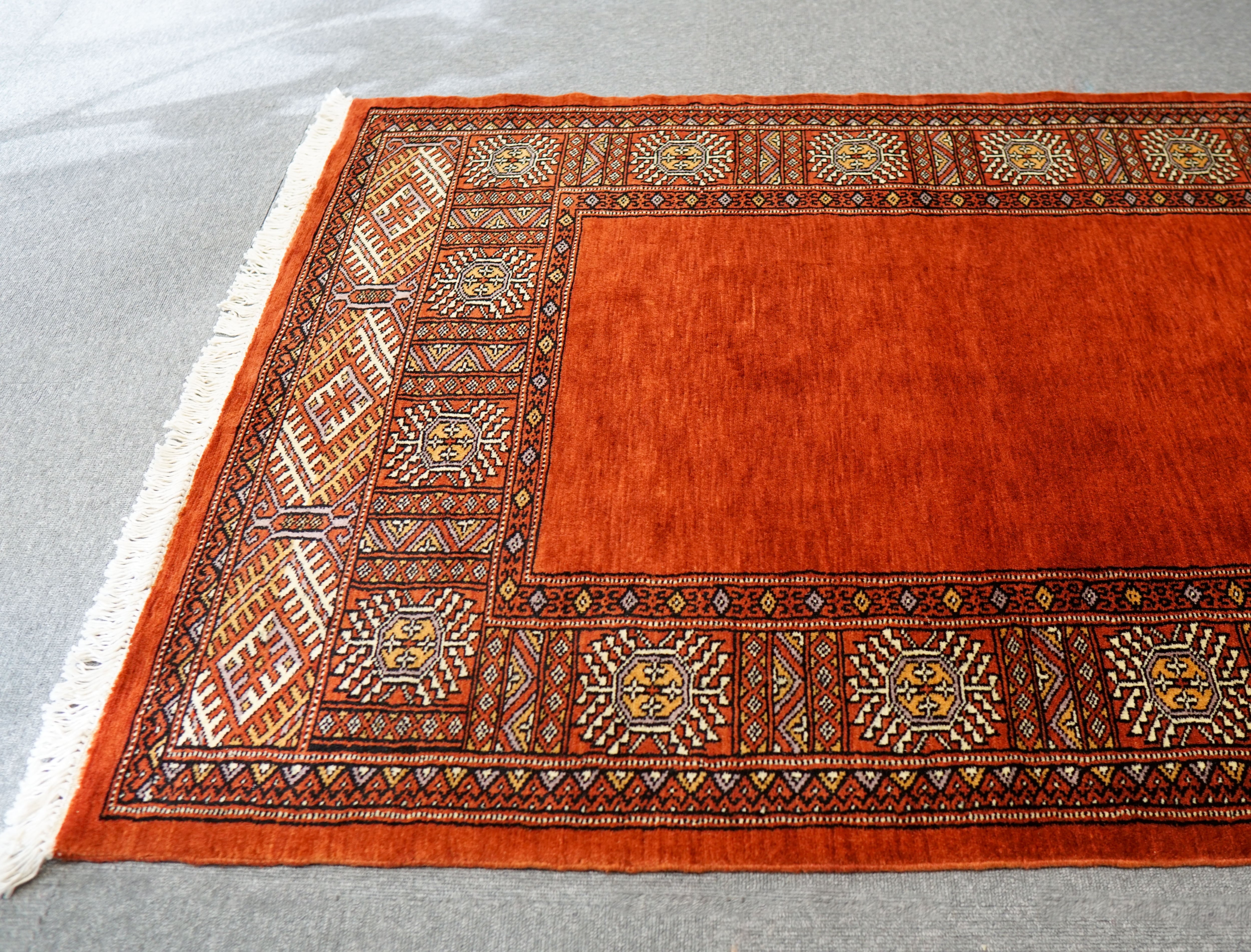 ニュージーランド産の上質なウールを使用し、信頼できる熟練した職人が手織りしたパキスタン絨毯です。ニュージーランド産のウールはタンパク質をたくさん含んでいるためハリ、艶に富むのが特徴です。肌触りはなめらかで柔らかく、弾力のあるパイル地が底冷えを防ぎ足元を快適にします。