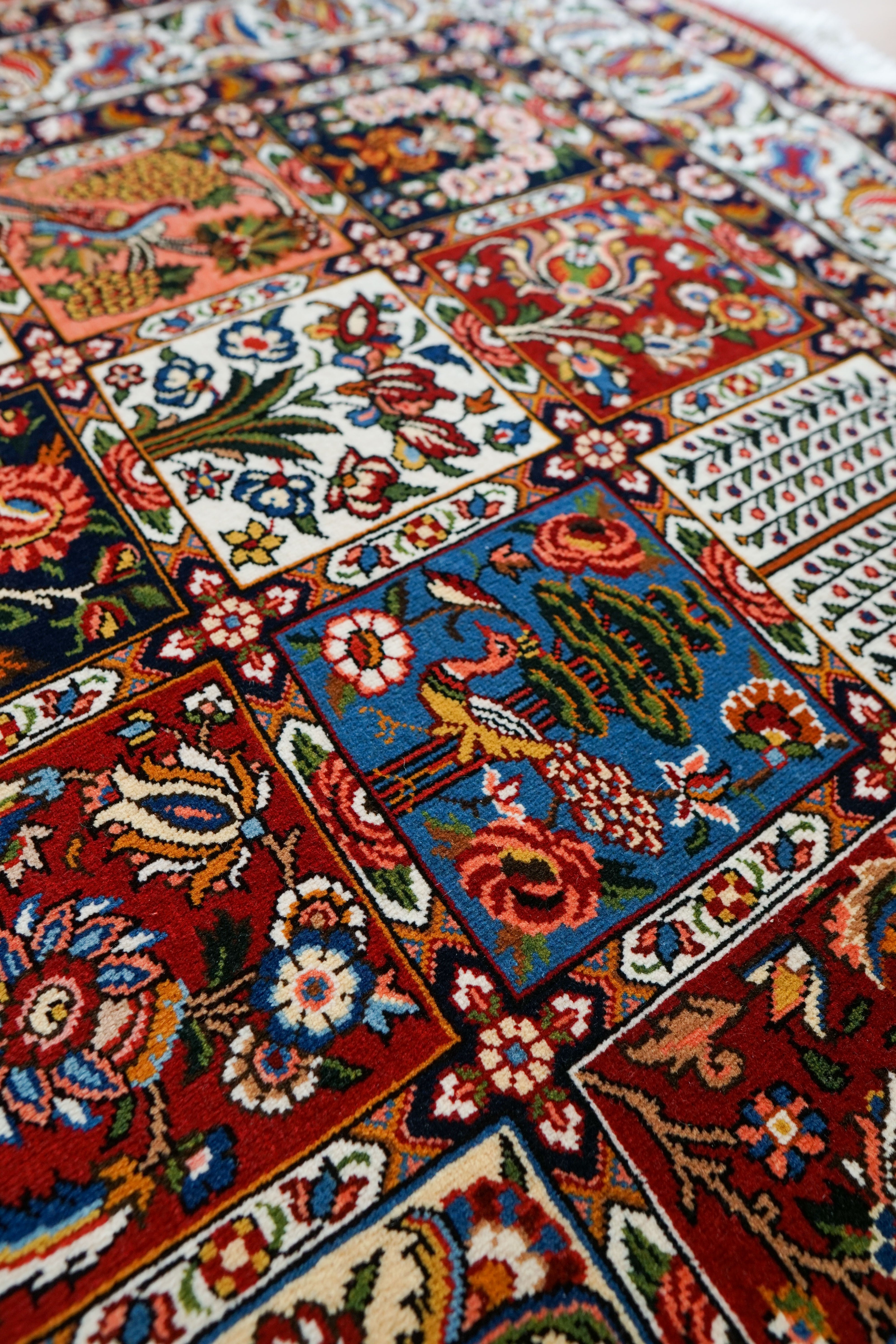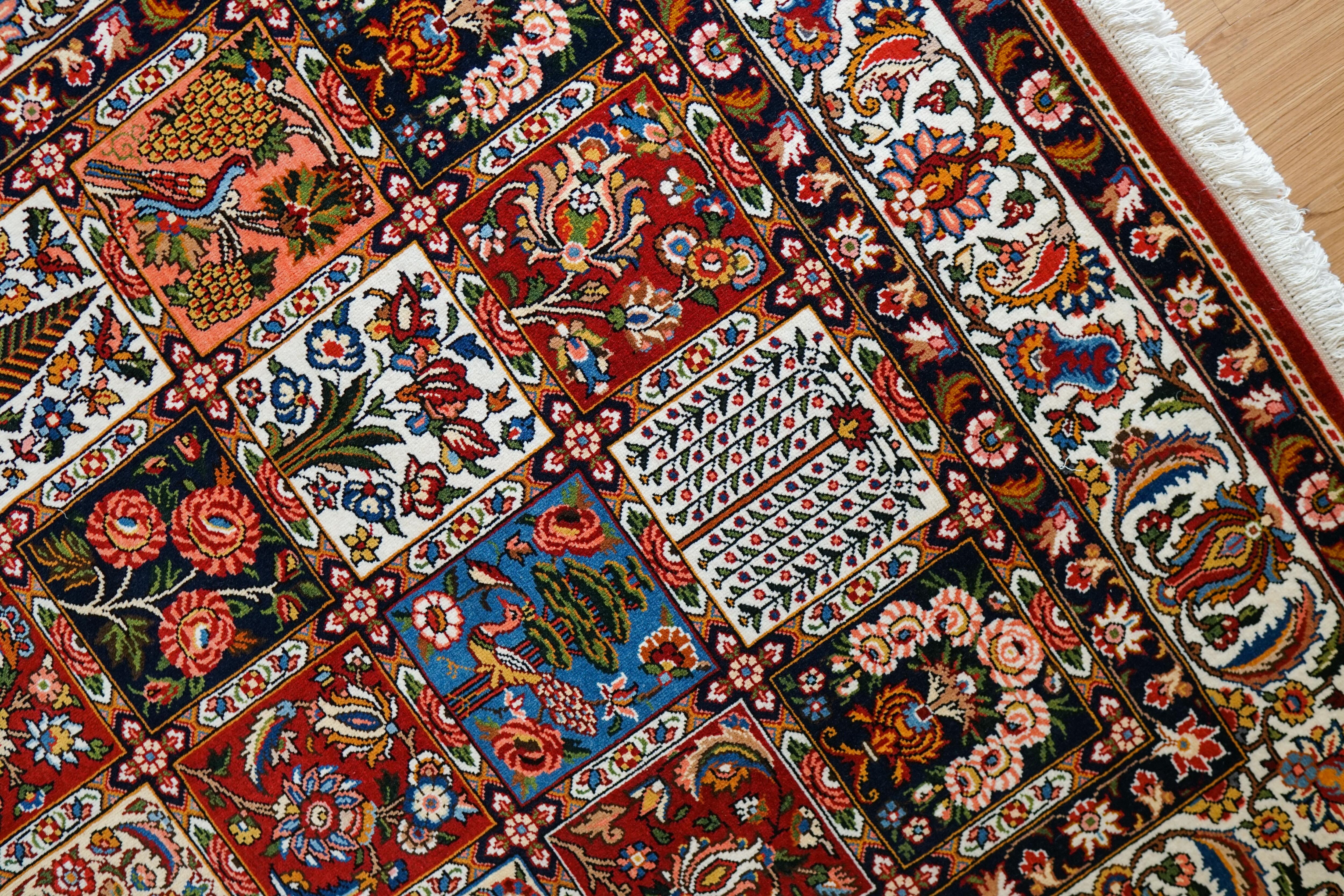 こちらは215×150cmのペルシャ絨毯、バクティアリ産の貴重な一点です。バクティアリはイラン南西部チャハールマハール・バクティアリ州を拠点とする遊牧民族で、鮮やかな色彩と大胆な幾何学的パターン、植物や動物をモチーフにした力強いデザインで知られています。本作品は、伝統的な「ガルシャーン(庭園)」デザインを思わせる区画分けと豊かな色使いが特徴で、見る角度や光の加減によって異なる表情を見せます。