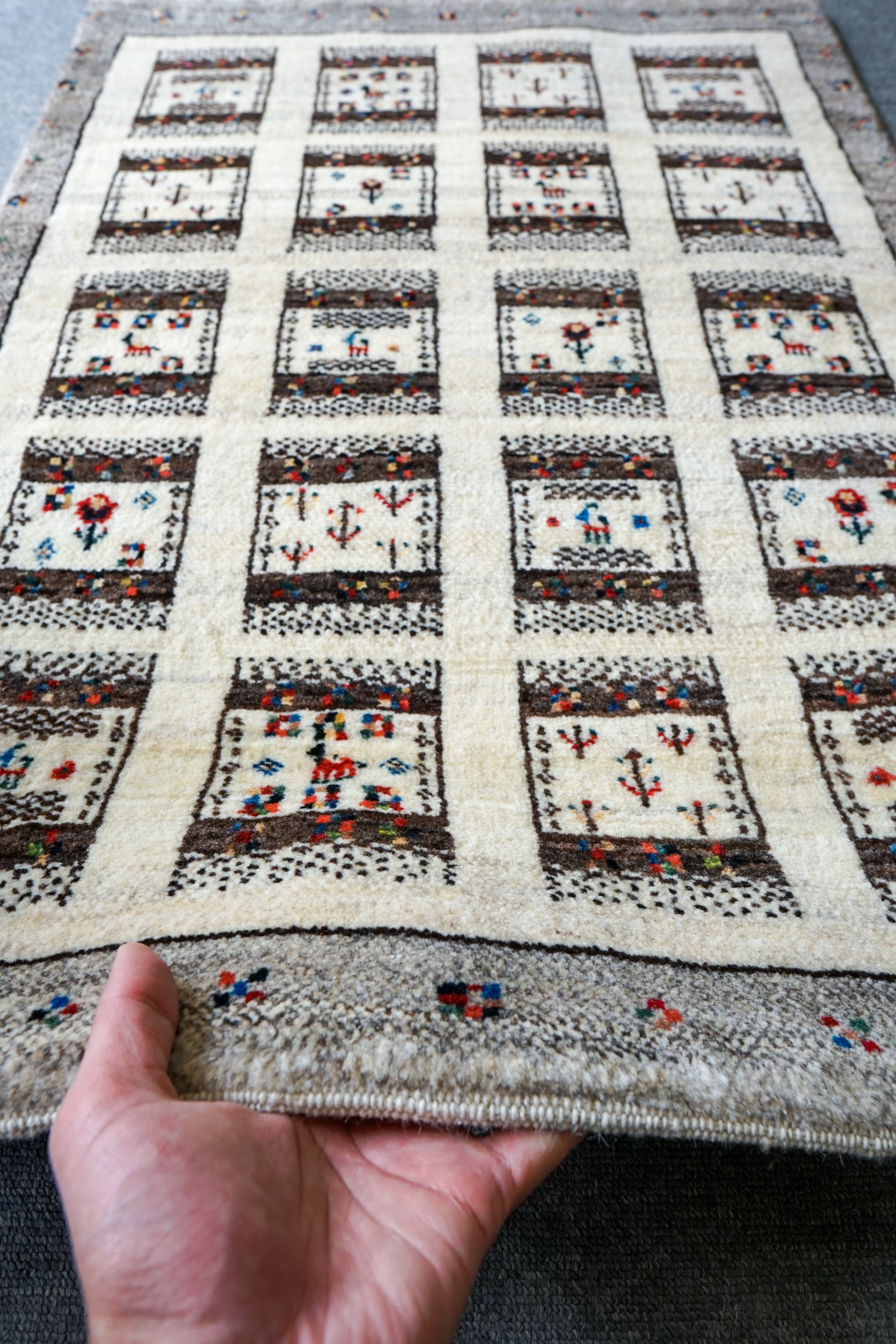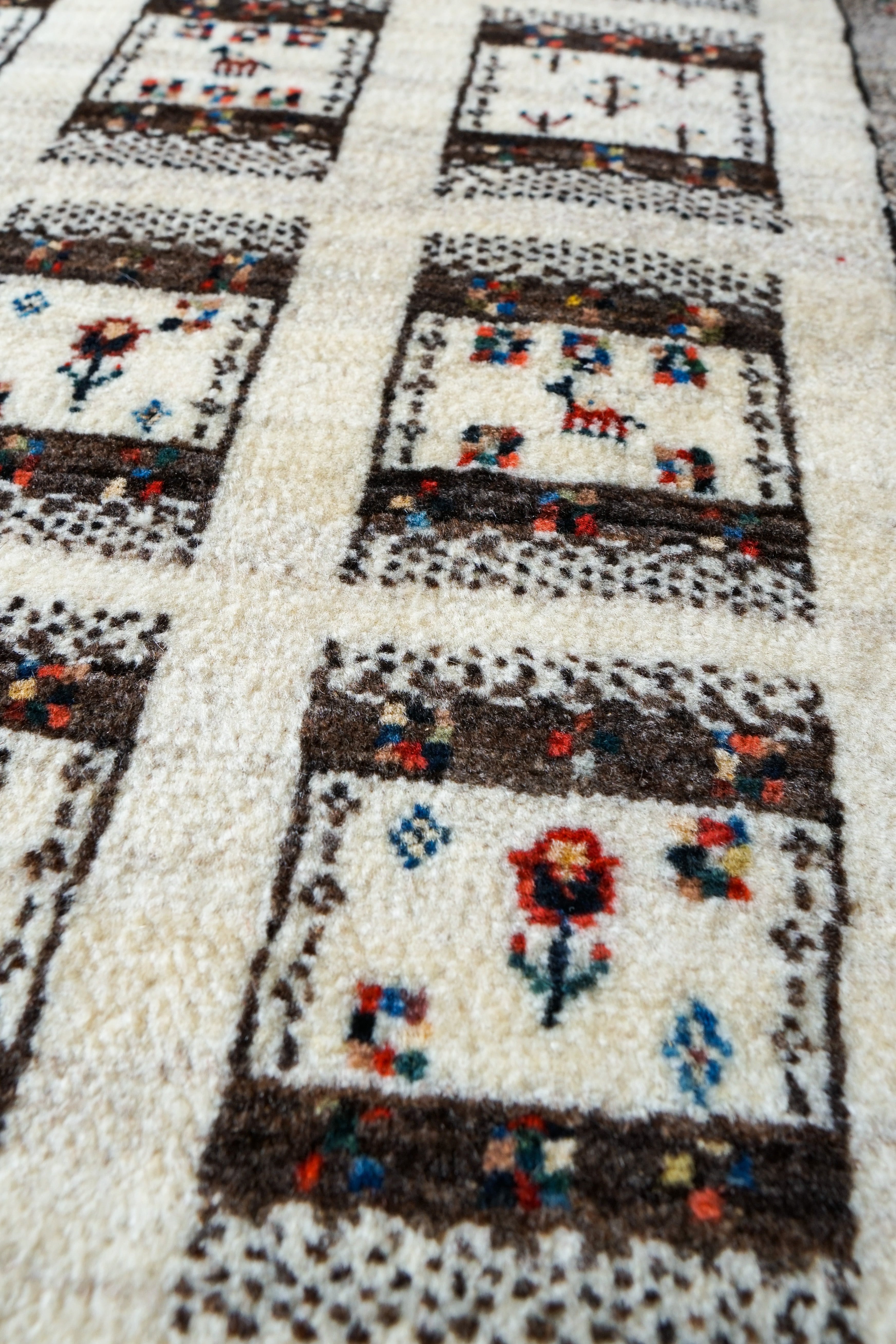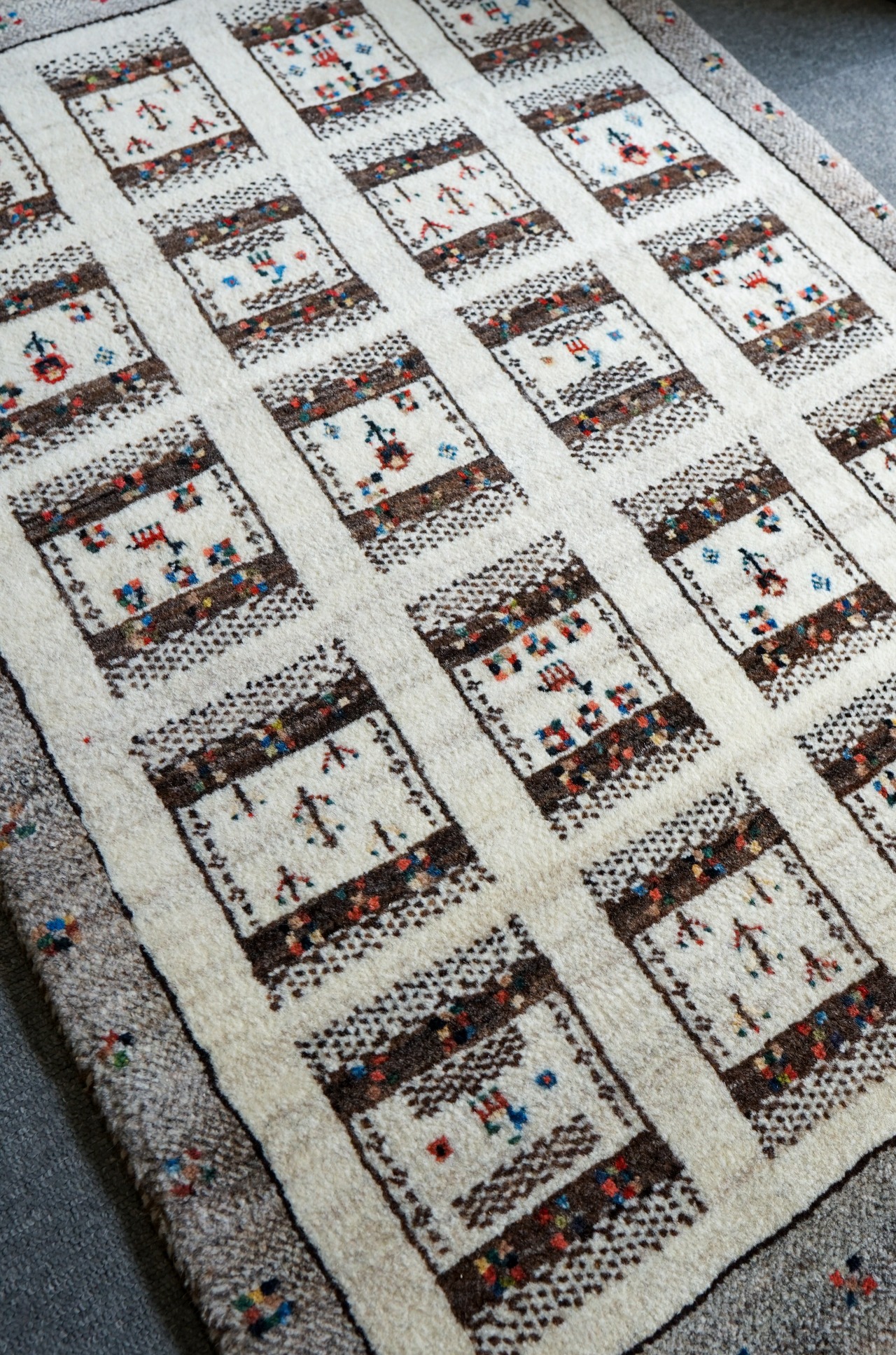 イラン シラーズ地方で遊牧民族によって手織りされたギャッベ。ギャッベの中でも織りが細かい『カシュクリ』と呼ばれるグレードの高いものです。結び目の密度が高いため織り上げるのに一般的なギャッベより時間を要しますが、柄は鮮明になり踏み心地も抜群です。