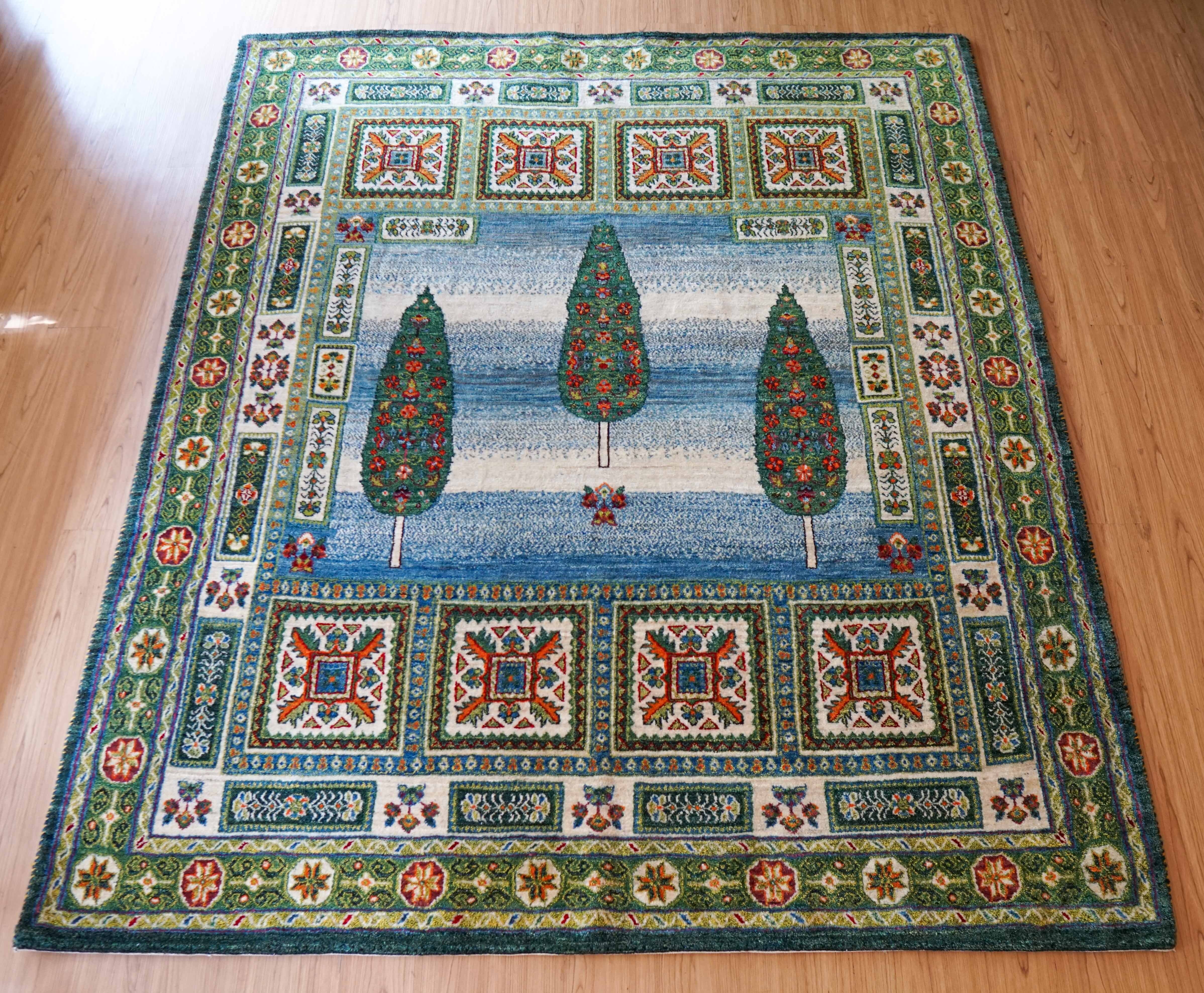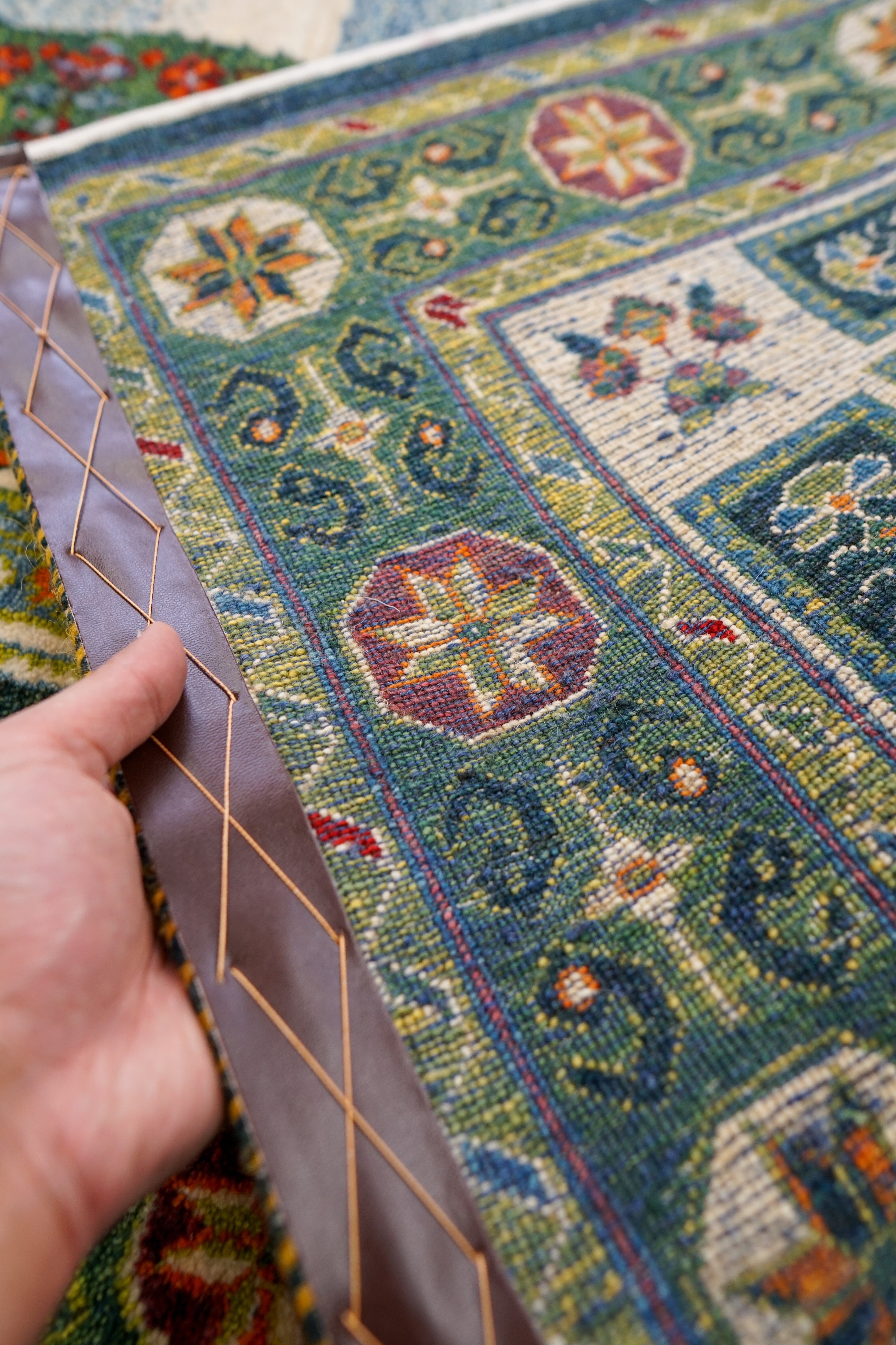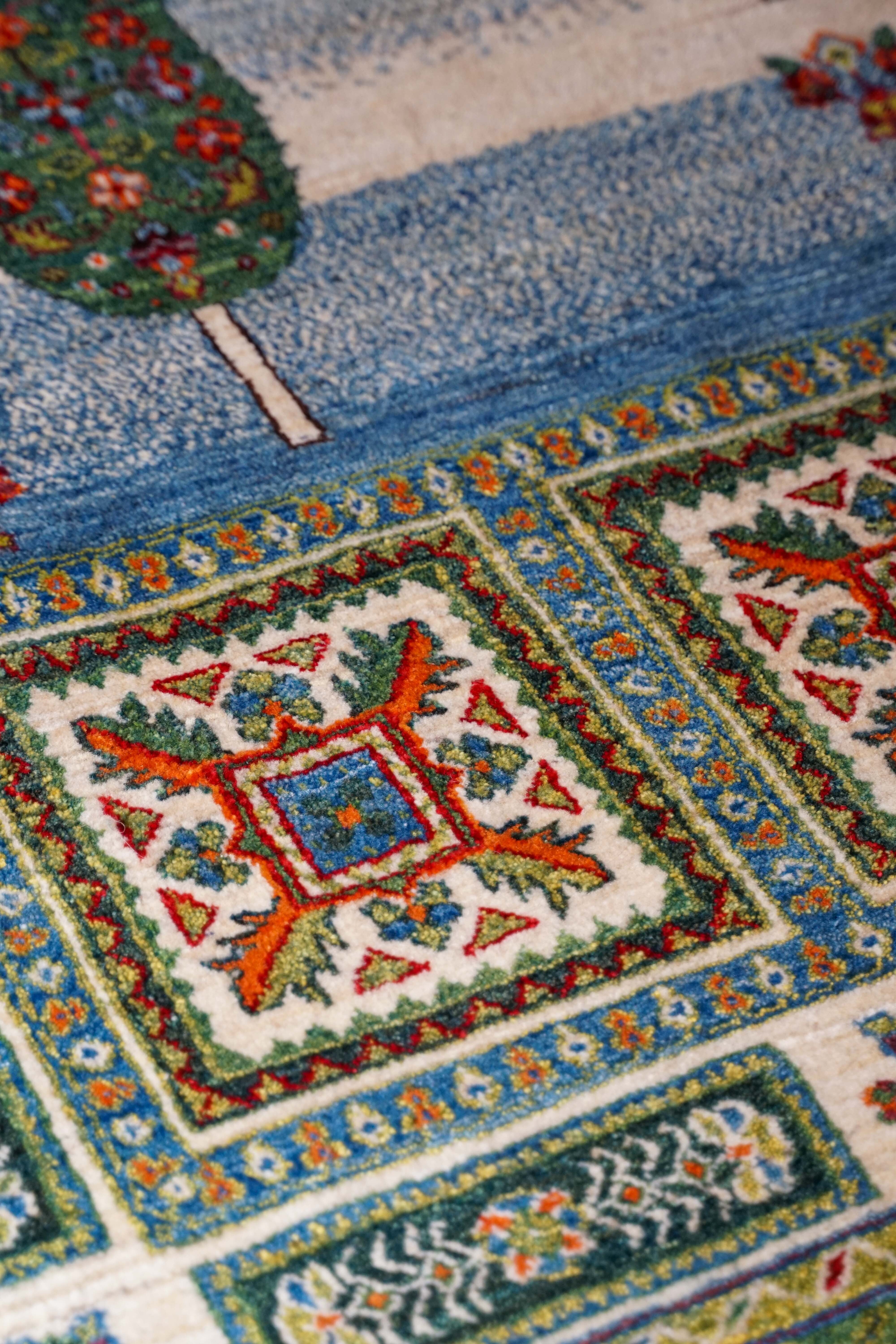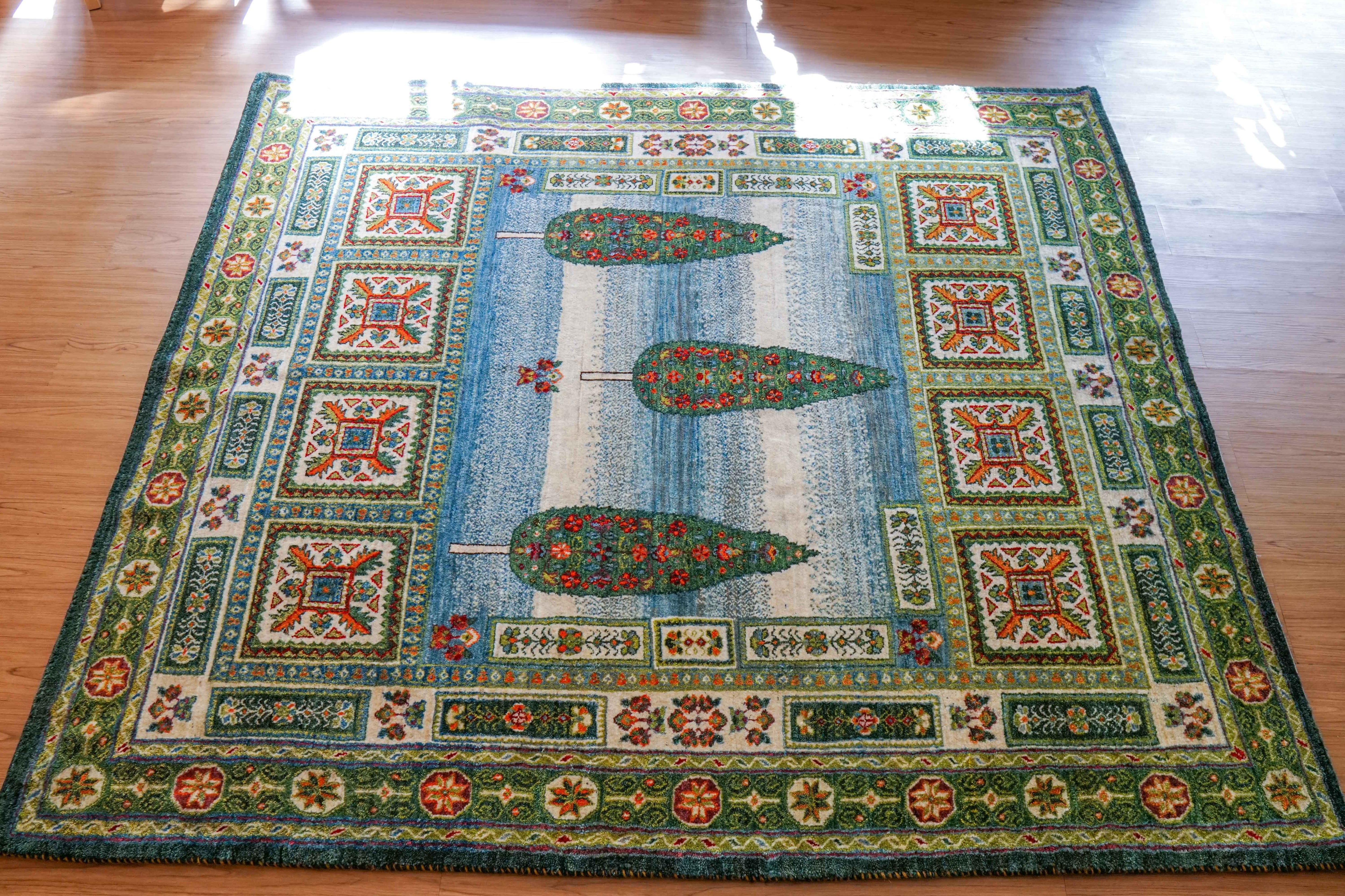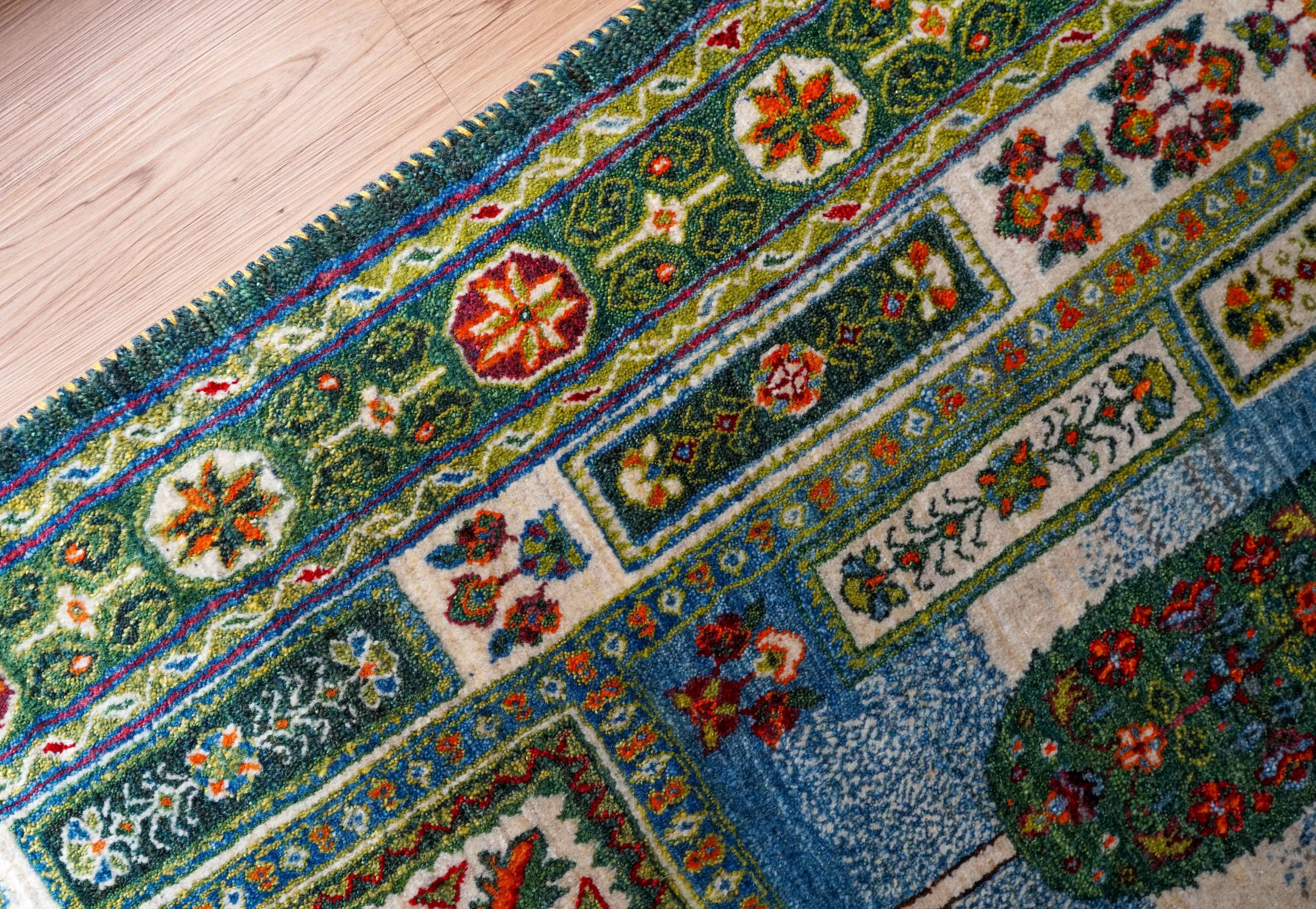 職人2人で約1年の歳月をかけて制作されたこの大きなギャッベは、リビングに華やかさと手仕事の温かみをもたらします。通気性に優れたウール100%で、夏涼しく冬あったかに年中足元を快適にお過ごしいただけます。