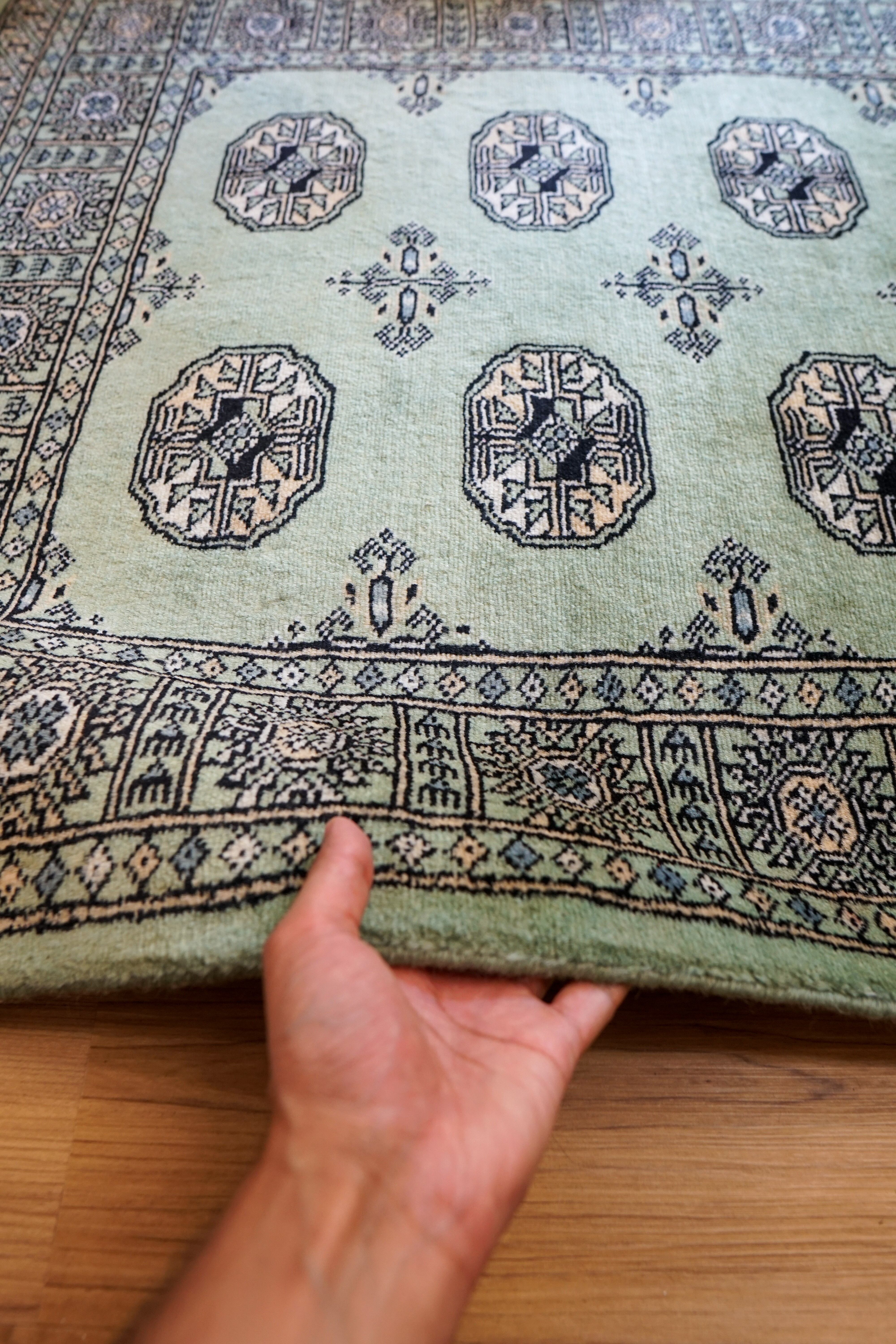 上質なウールをに草木染めを施し、パキスタンの職人が手織りで作り上げた絨毯です。弾力があり、柔らかな肌触り。