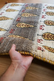 イランの遊牧民カシュガイ族が手織りする、草木染の手紡ぎウールを使ったギャッベという絨毯。太めのウールでざっくりと織られていて厚みがあり、素朴で可愛らしい柄・色遣いが特徴です。