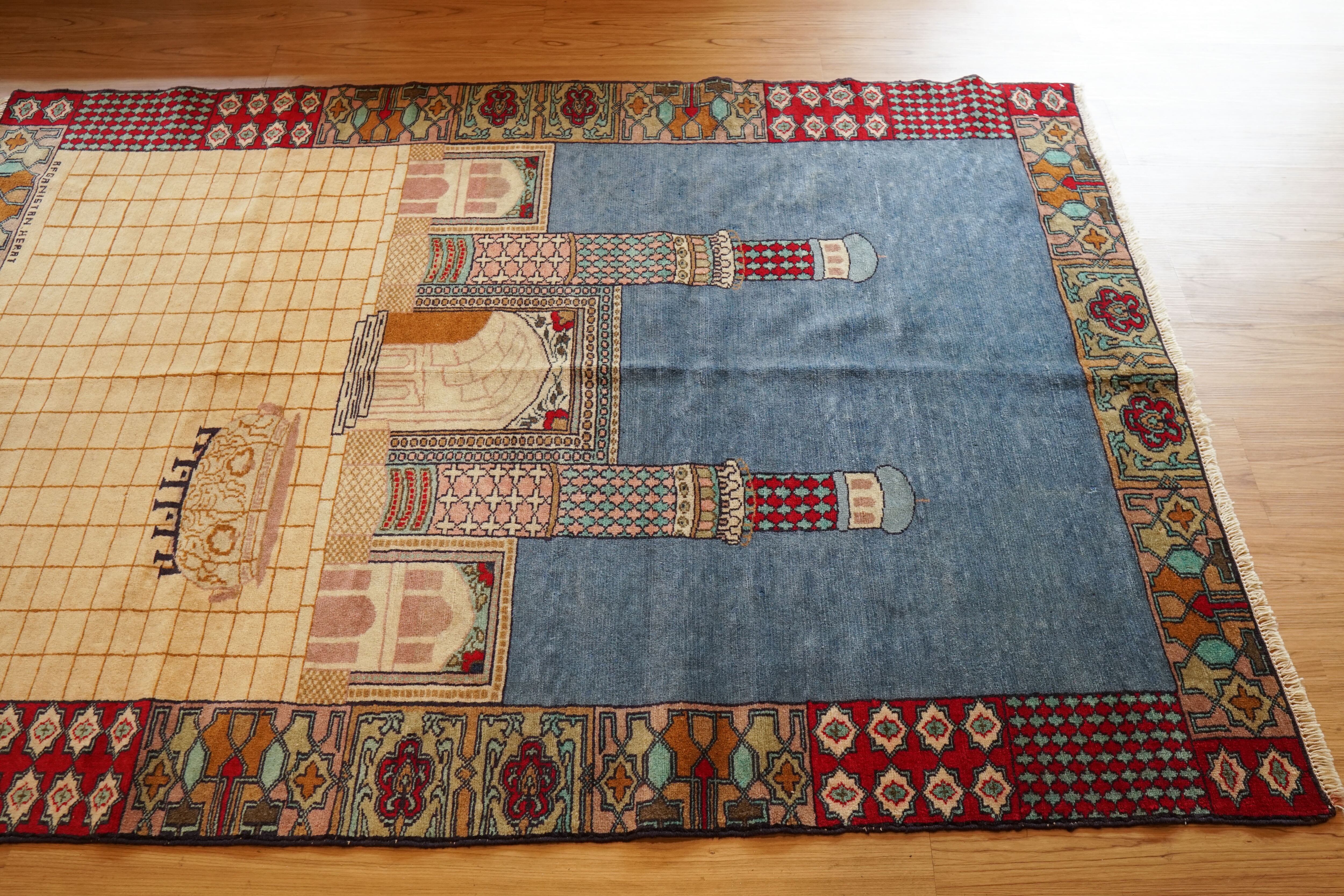 1970年代にアフガニスタン・ヘラートで製作された、希少なアンティーク手織り絨毯です。細やかな手仕事で織り上げられた上質ウールは、しっとりとした手触りと高い耐久性を誇ります。デザインはヘラートの歴史的モスクをモチーフにし、ブルーとベージュを基調にした美しい色彩が魅力。周囲には伝統的な幾何学模様と花文様の縁取りが施され、中央の建築モチーフが際立ちます。サイズは172×114cmと扱いやすく、リビング、壁掛けにも最適。アフガン織物の文化と歴史を感じられる逸品で、コレクションやインテリアのアクセントにおすすめです。時間を経ても色褪せない美しさが、空間に品格と温もりをもたらします。