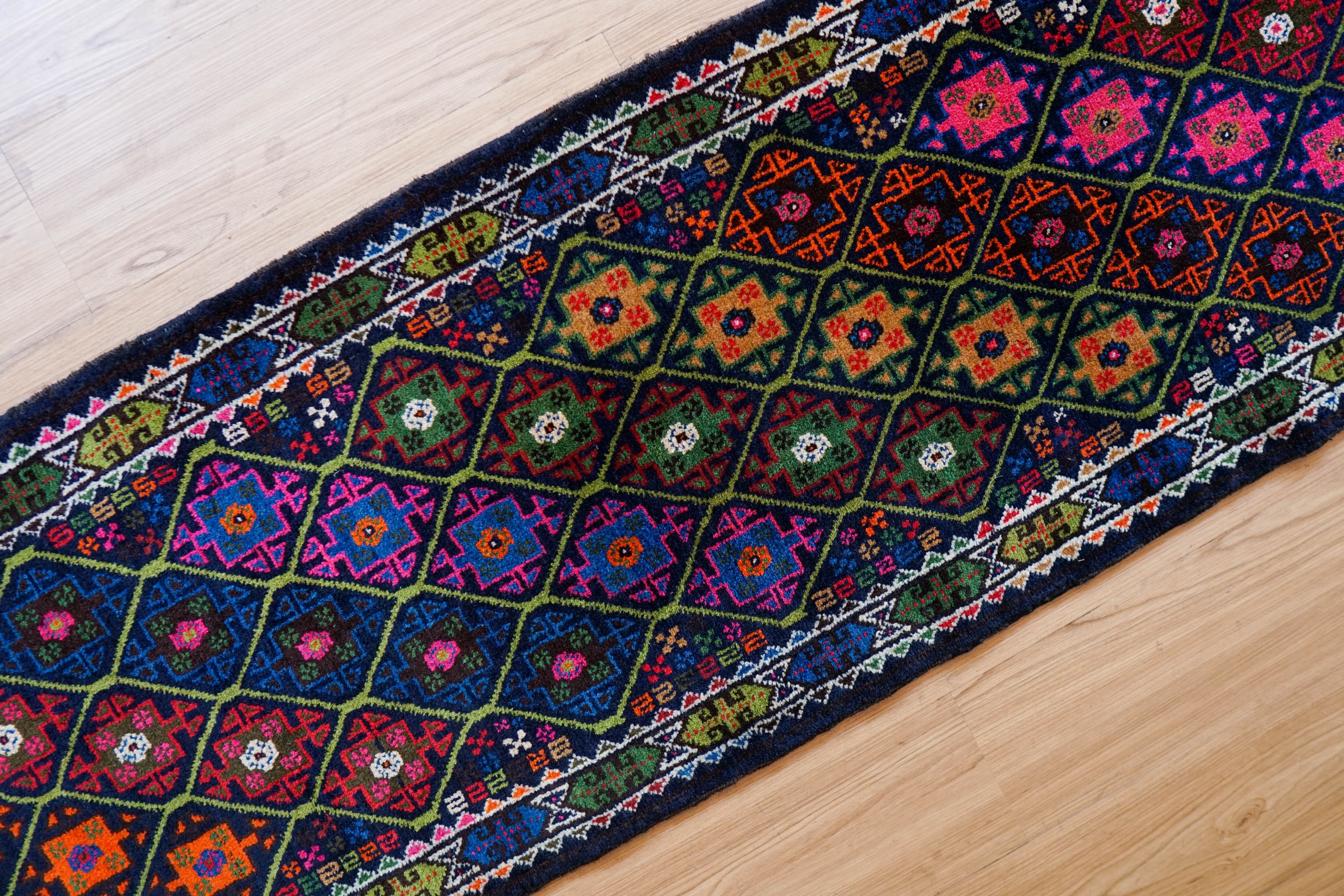 このアフガニスタン手織りランナーラグ(231×55cm)は、鮮やかな色彩と力強い幾何学文様が特徴的なトライバルデザインです。部族ごとに受け継がれてきた伝統的な織り技法を用い、ひと結びごとに職人の手作業で丁寧に織り上げられています。