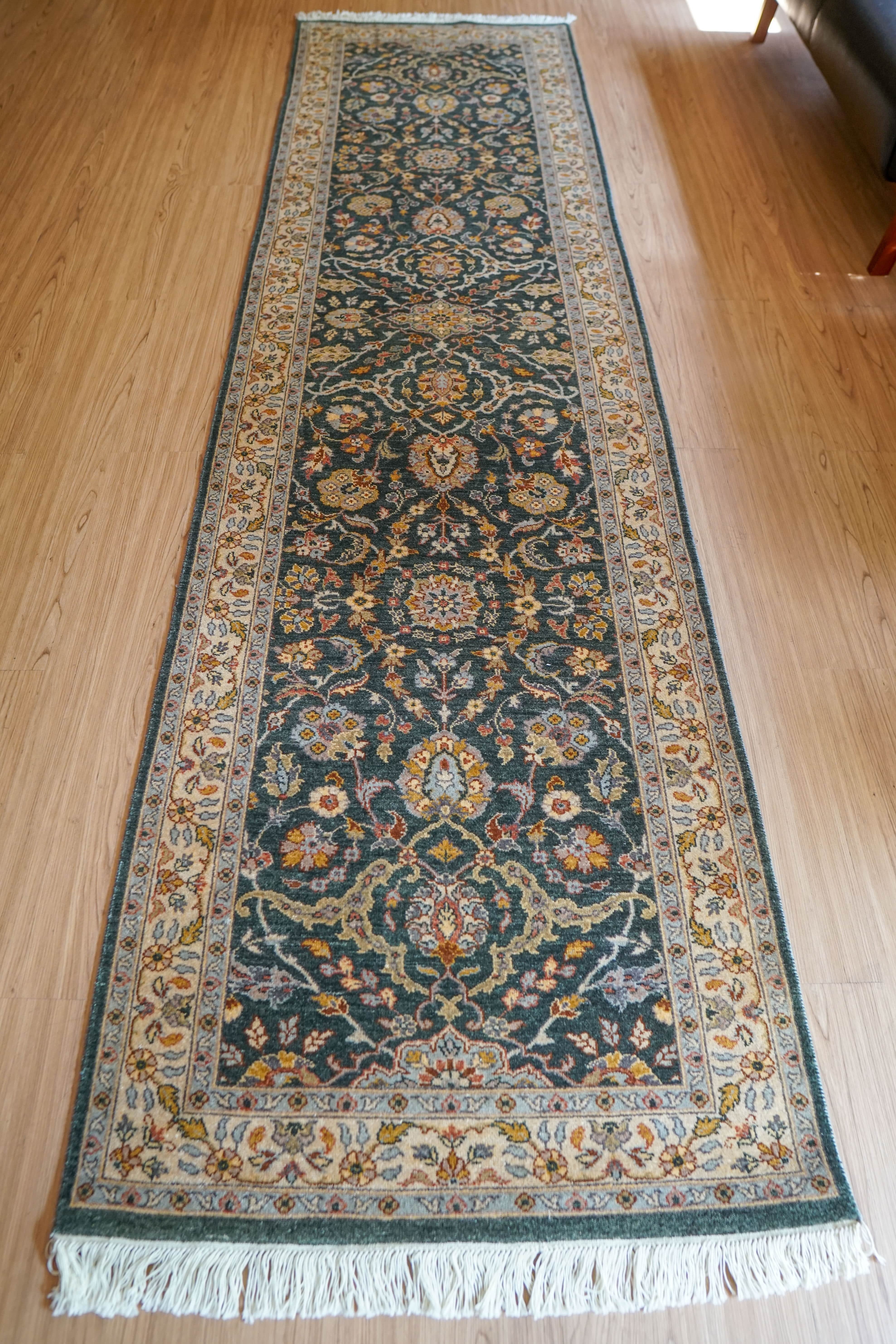 この絨毯は高密度ノットで織られており、緻密な花柄や蔓草模様が精巧に表現されています。深みのあるグリーンを基調に、アイボリーやゴールドが巧みに組み合わされ、洗練されたオリエンタルデザインを際立たせています。近くで見ると一本一本の結びの丁寧さが伝わり、熟練職人の技術が凝縮された仕上がりです。