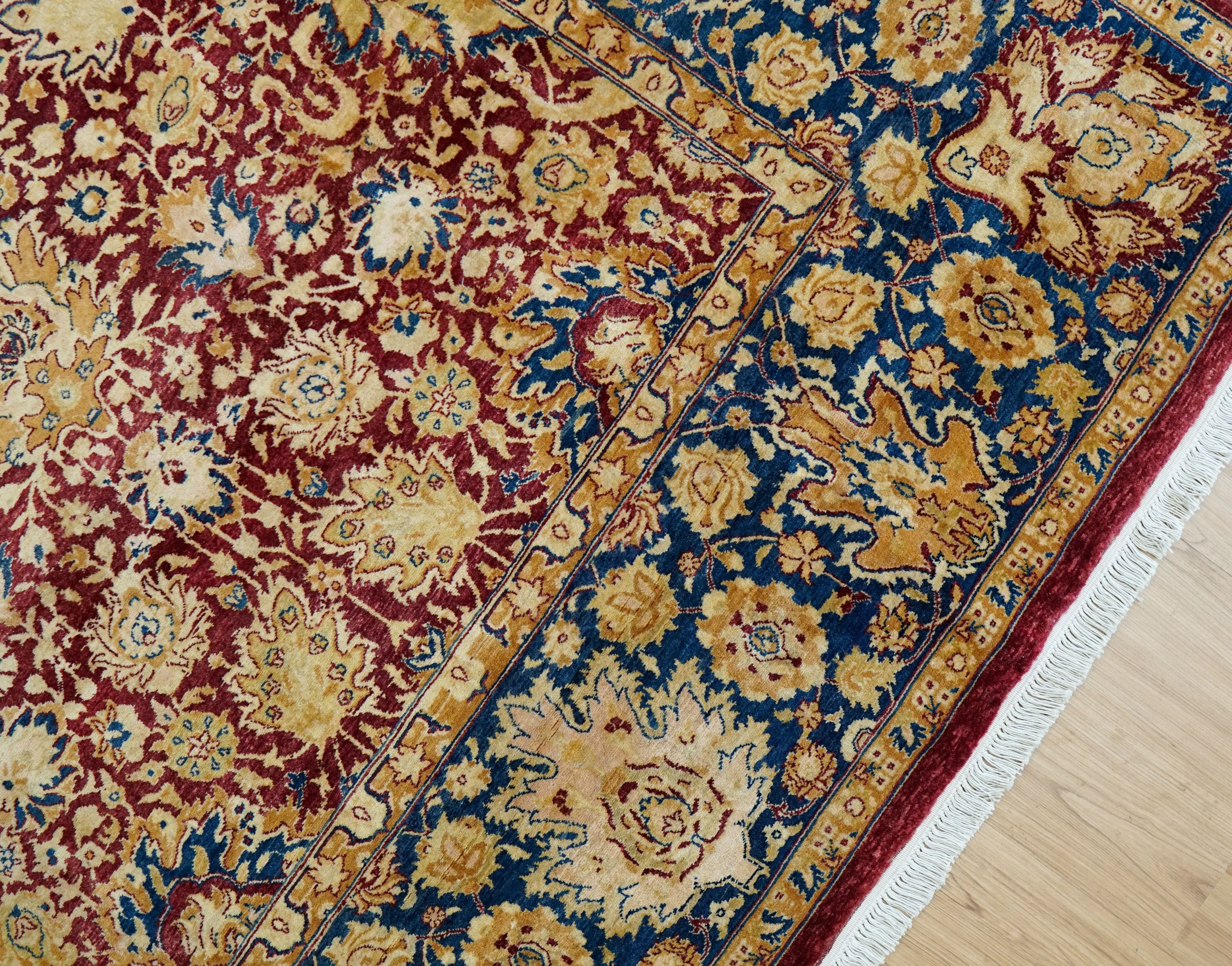 上質なウールを用いたFine Qualityクラスのラグは、赤を基調にわずかに紫がかった深みのある色合いが特徴。中央には花唐草の優雅なパターンが広がり、縁を囲むネイビーとゴールドのボーダーが全体に高級感と落ち着きを与えています。光の加減で色の表情が変わるため、時間帯や照明によって異なる雰囲気を楽しめます。