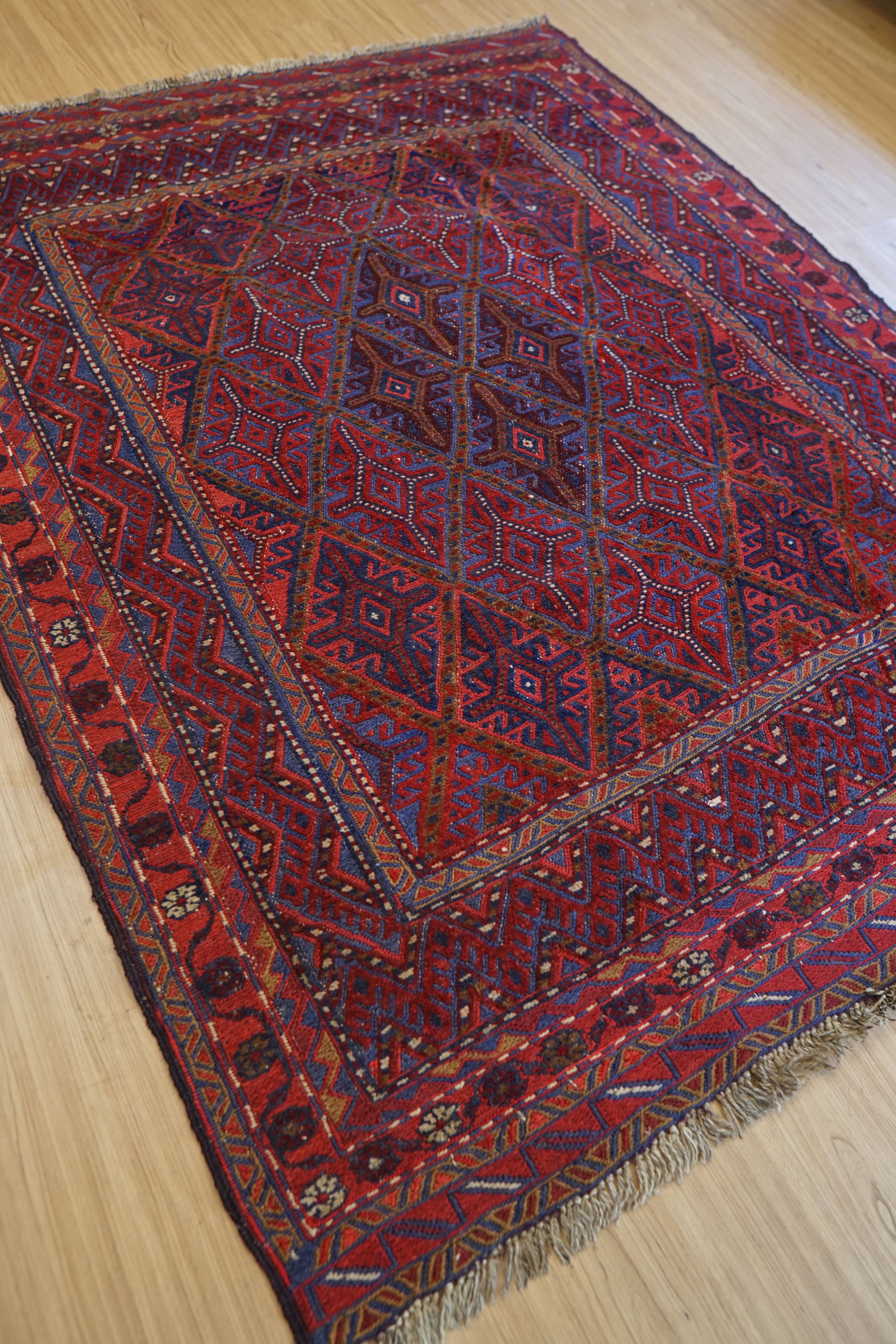 毛足のない麻のような肌触りのキリムと、パイル地の絨毯部分を合わせもった凸凹のある絨毯で、幾何学的なデザインが美しく、踏み心地も大変良いです。