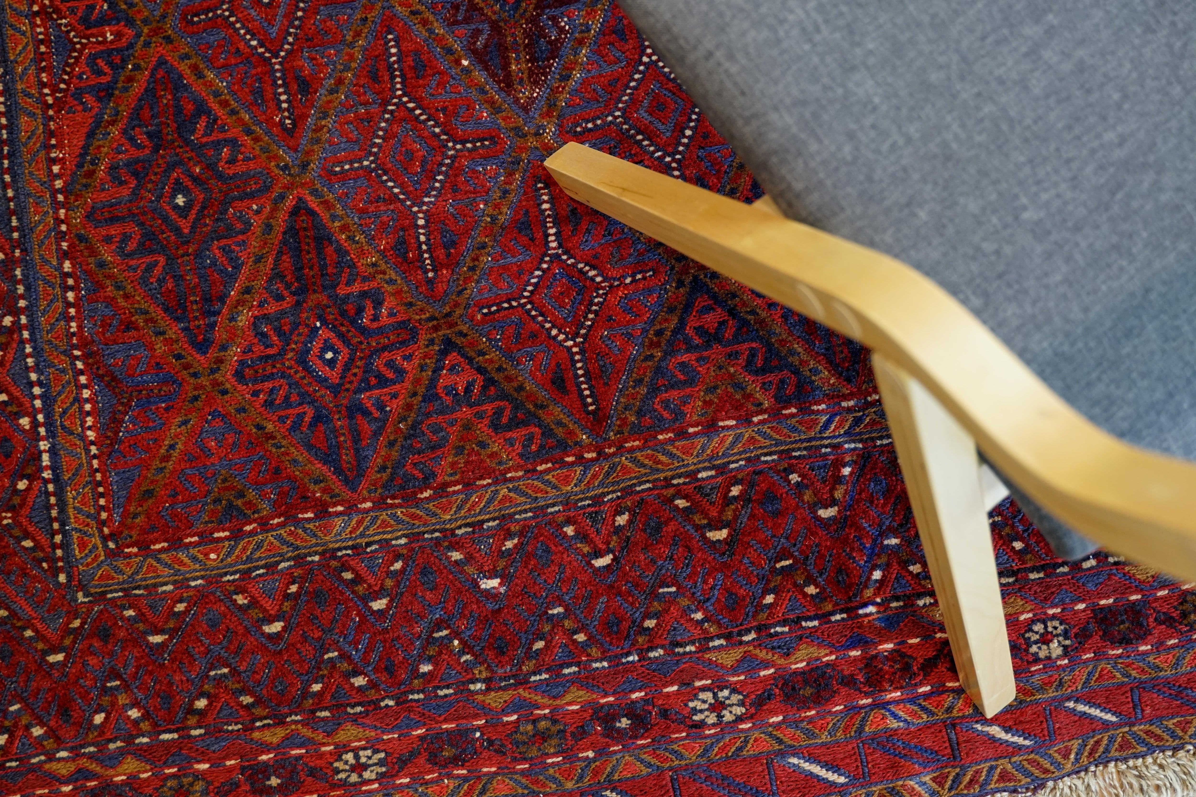 アフガニスタン ヘラート産のマシュワニキリムです。マシュワニ族という部族が手織りしています。彼らの得意とするスマック織りという技法は、複雑な織り技術を要するため難易度が高く、希少で日本ではあまり出回っていません。