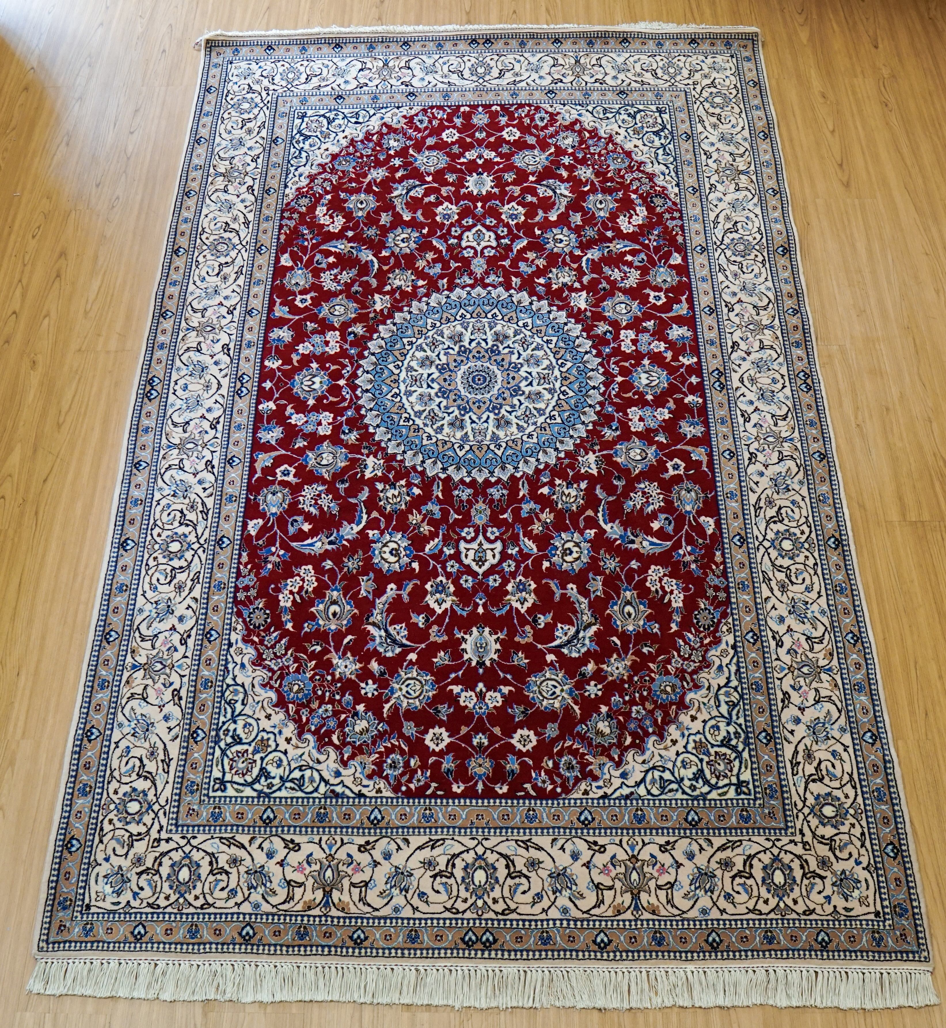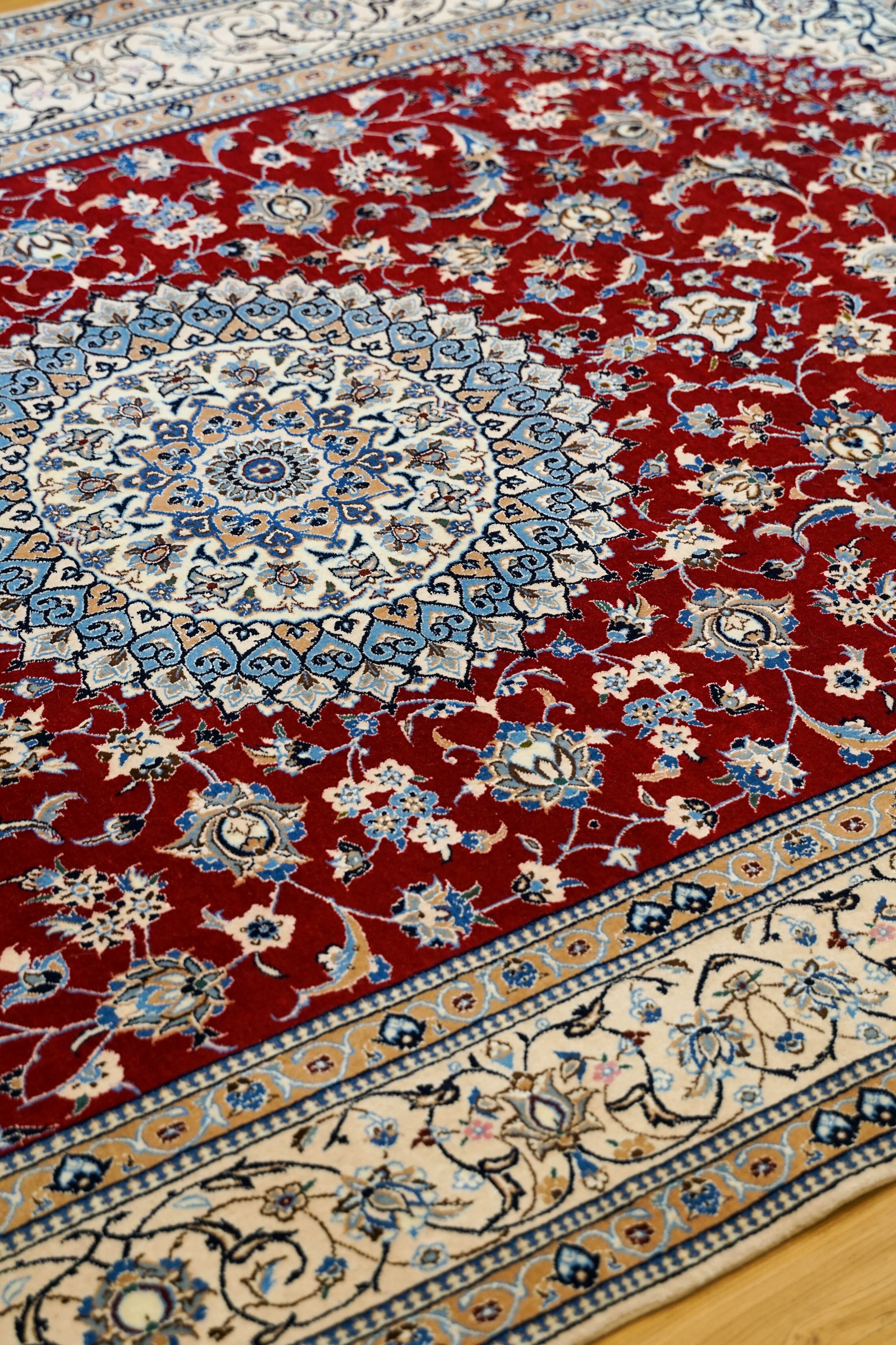 イラン中部・ナインで織られる6La(シシュラ)ランクのペルシャ絨毯は、きめ細やかな手織りとシルクの上品な艶が特徴の高級モデルです。