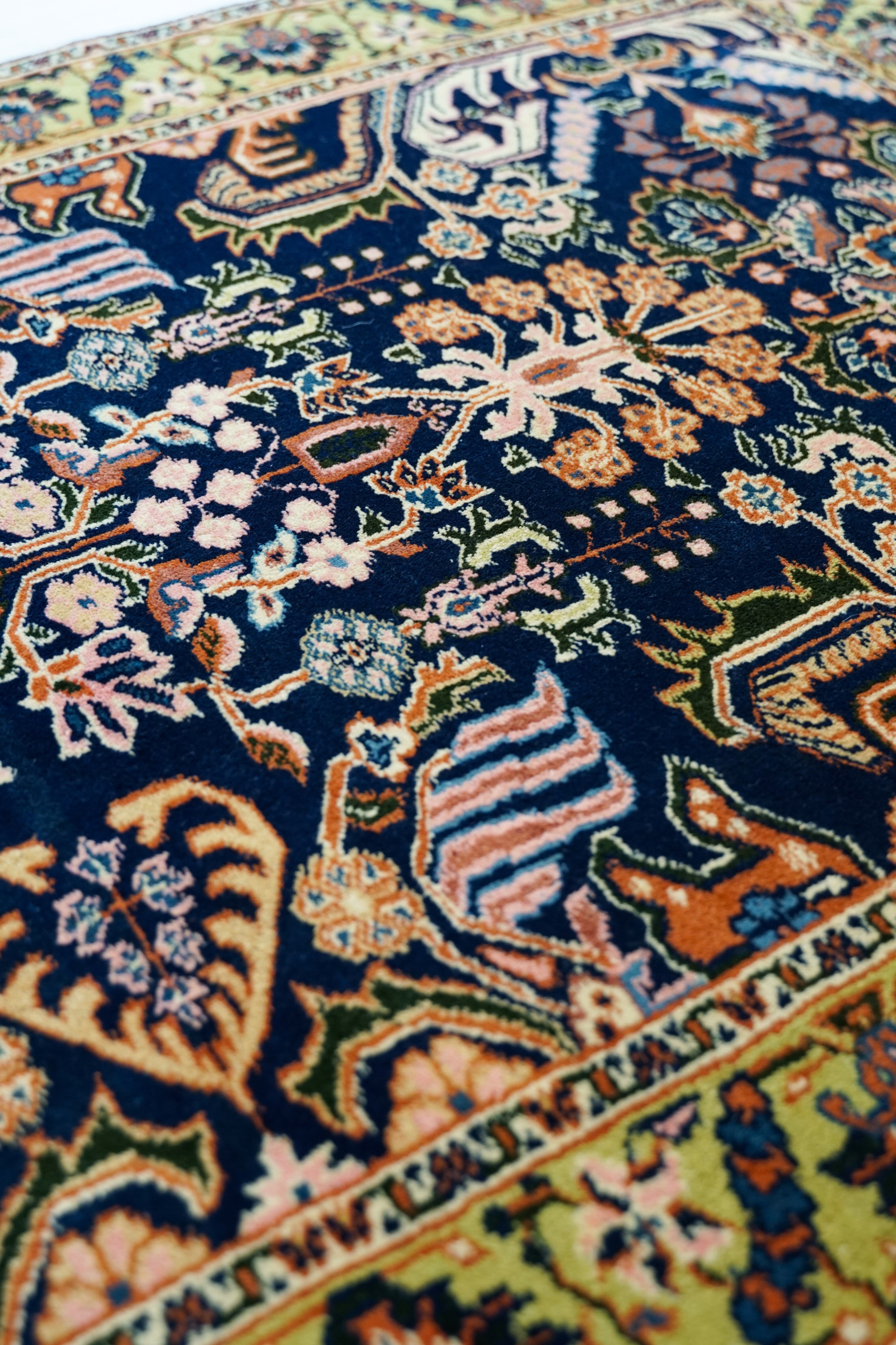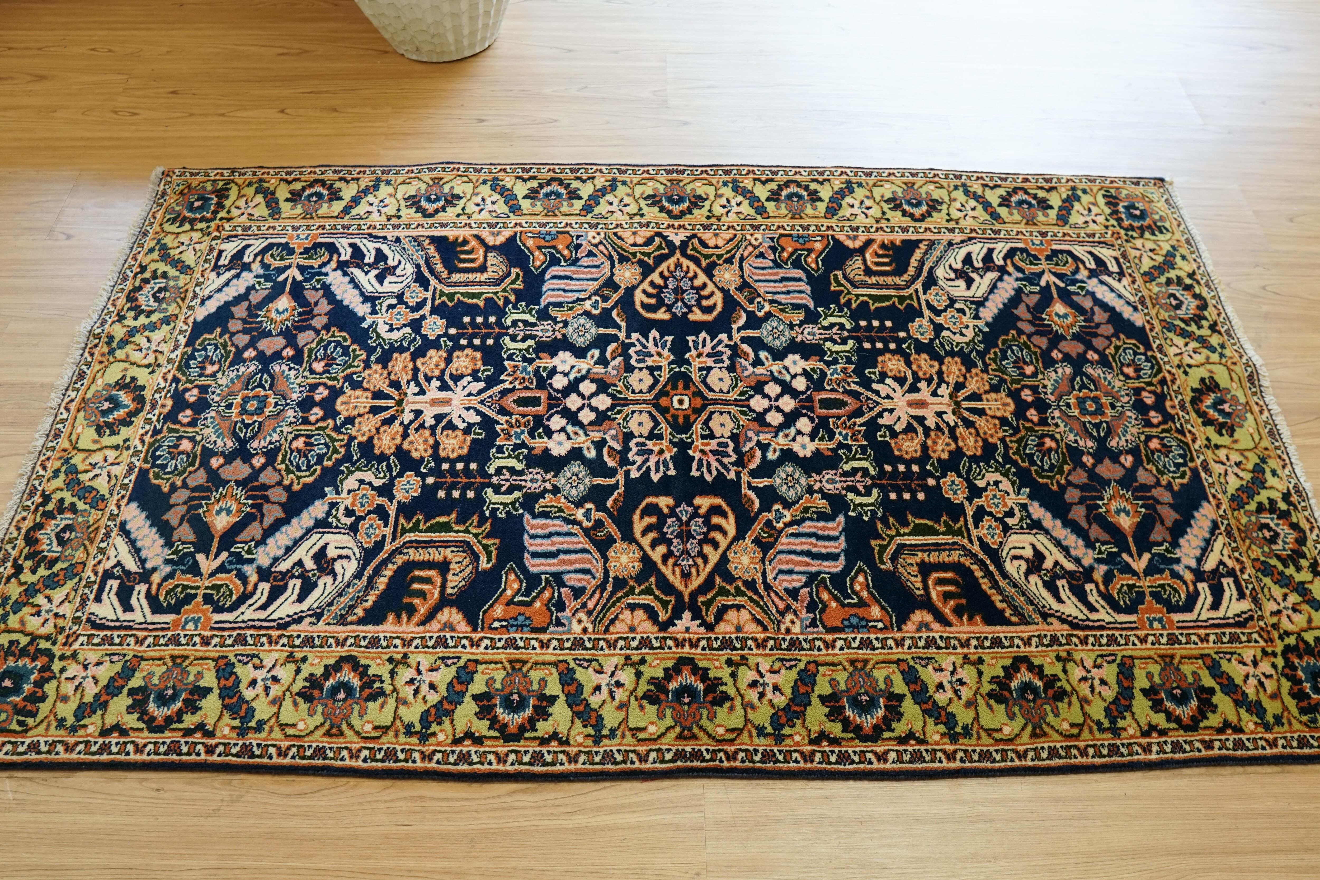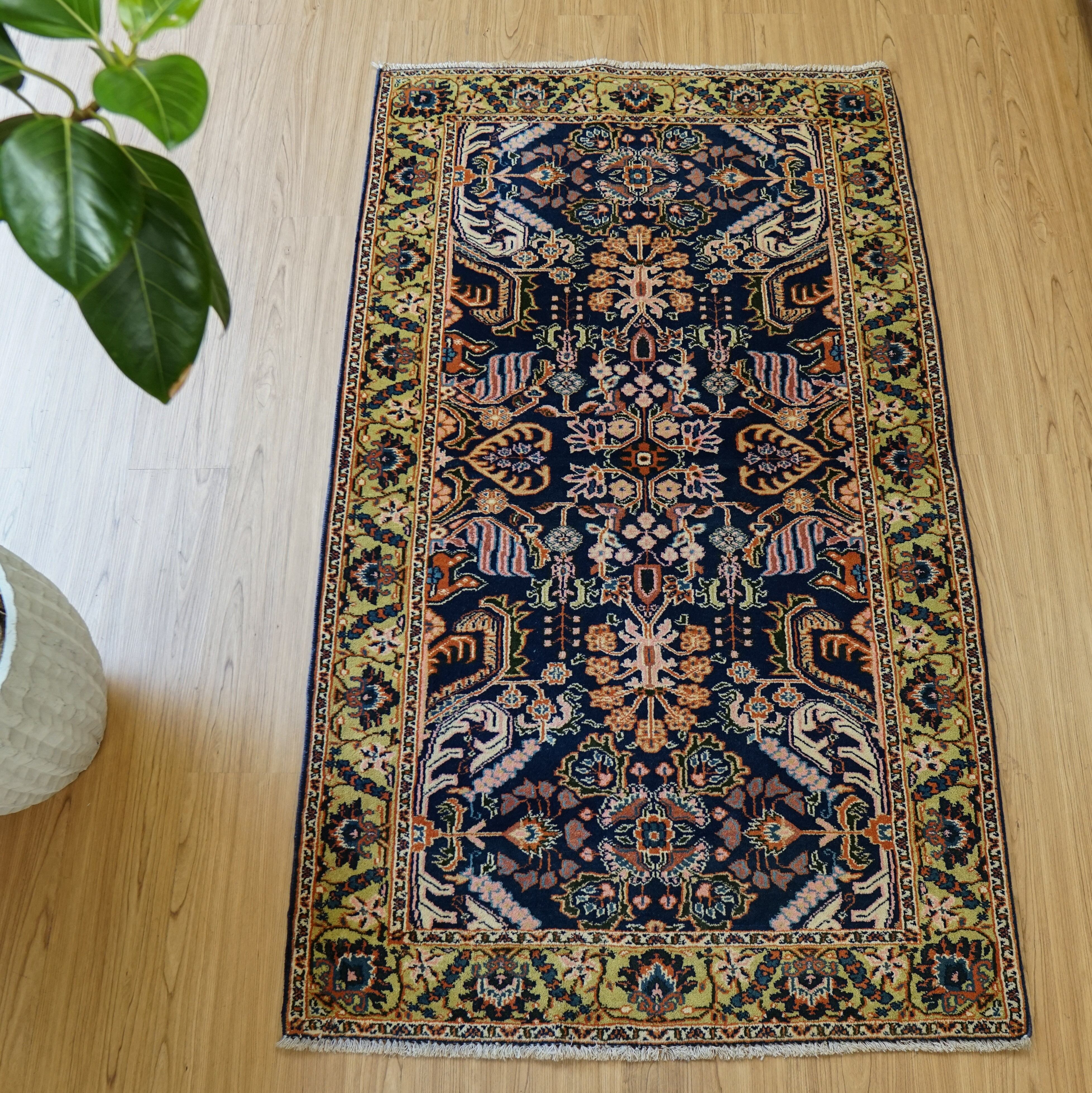 イラン東部の遊牧民によって織られるバルーチ族の手織りトライバルラグです。サイズは157×91cmで、玄関や廊下、ソファ前、ベッドサイドなど幅広い場所で使いやすいランナーサイズ。深いネイビーブルーを基調に、植物や鳥、幾何学模様が細かく描かれた伝統的なデザインが特徴で、空間に民族的な趣と個性を加えてくれます。素材は上質なウール100%。油分を含んだしなやかなウールは耐久性が高く、踏み心地も柔らかです。全て職人の手作業で織り上げられたため、機械織りにはない温かみと表情があります。裏面まで硬く詰まった丈夫な仕上がりで、年月を重ねながら風合いの変化も楽しめます。天然素材と伝統工芸にこだわる方、ヴィンテージ感のあるインテリアを好む方におすすめです。お部屋のアクセントラグとしてはもちろん、壁に飾ってタペストリーとしても映える一枚です。