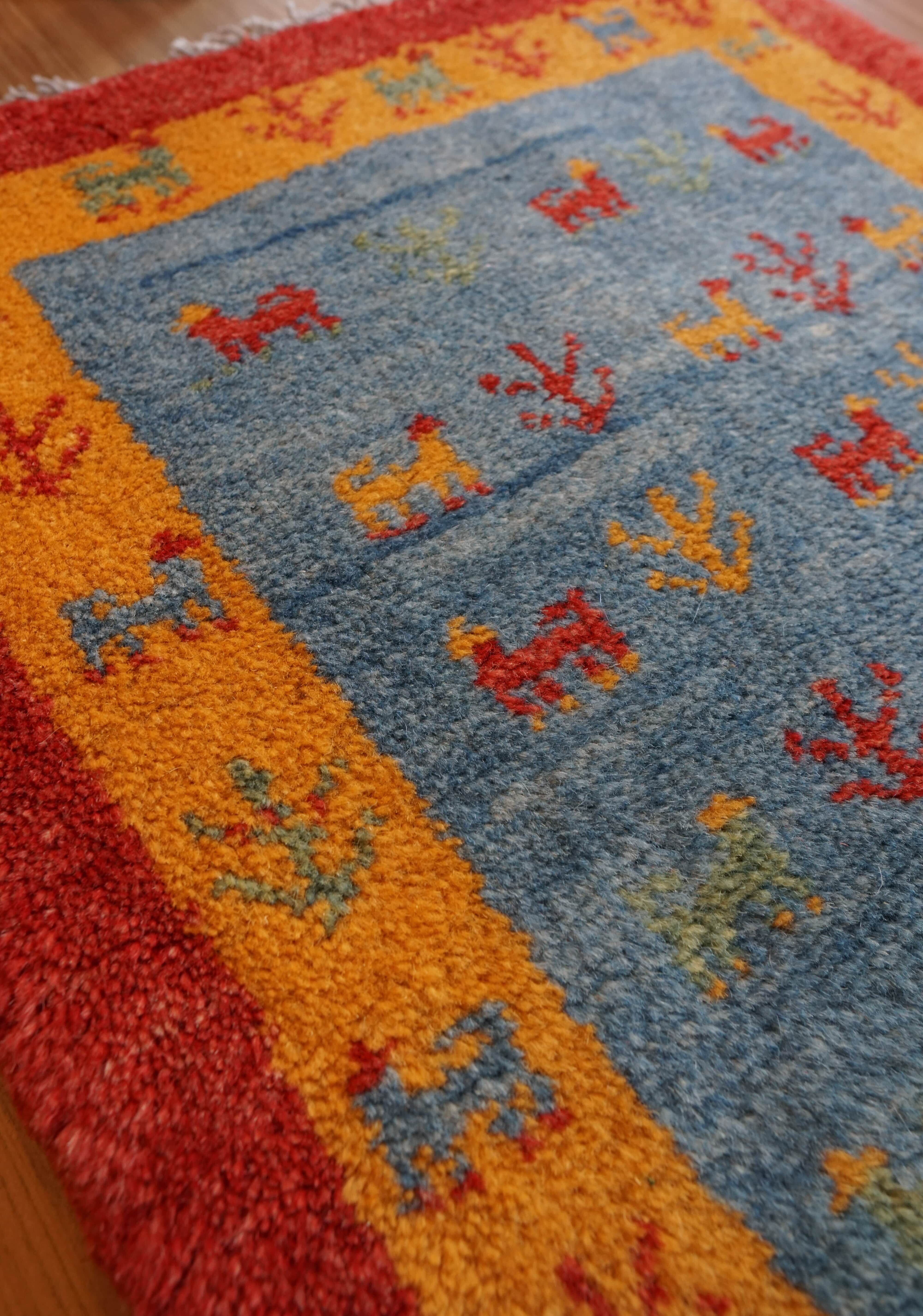 80×52cmのペルシャ手織りギャッベは、イラン南部に暮らすアマレ族の職人によって丁寧に織り上げられた温もりある一枚です。澄んだブルーを基調に、動物や植物など自然を象徴するモチーフが織り込まれ、幸せや繁栄への願いが込められています。上質な羊毛を使用し、天然染料で染められたやさしい色合いは、年月とともに味わいを増します。小ぶりながら存在感があり、玄関やデスク下、ベッドサイドなどにぴったり。