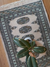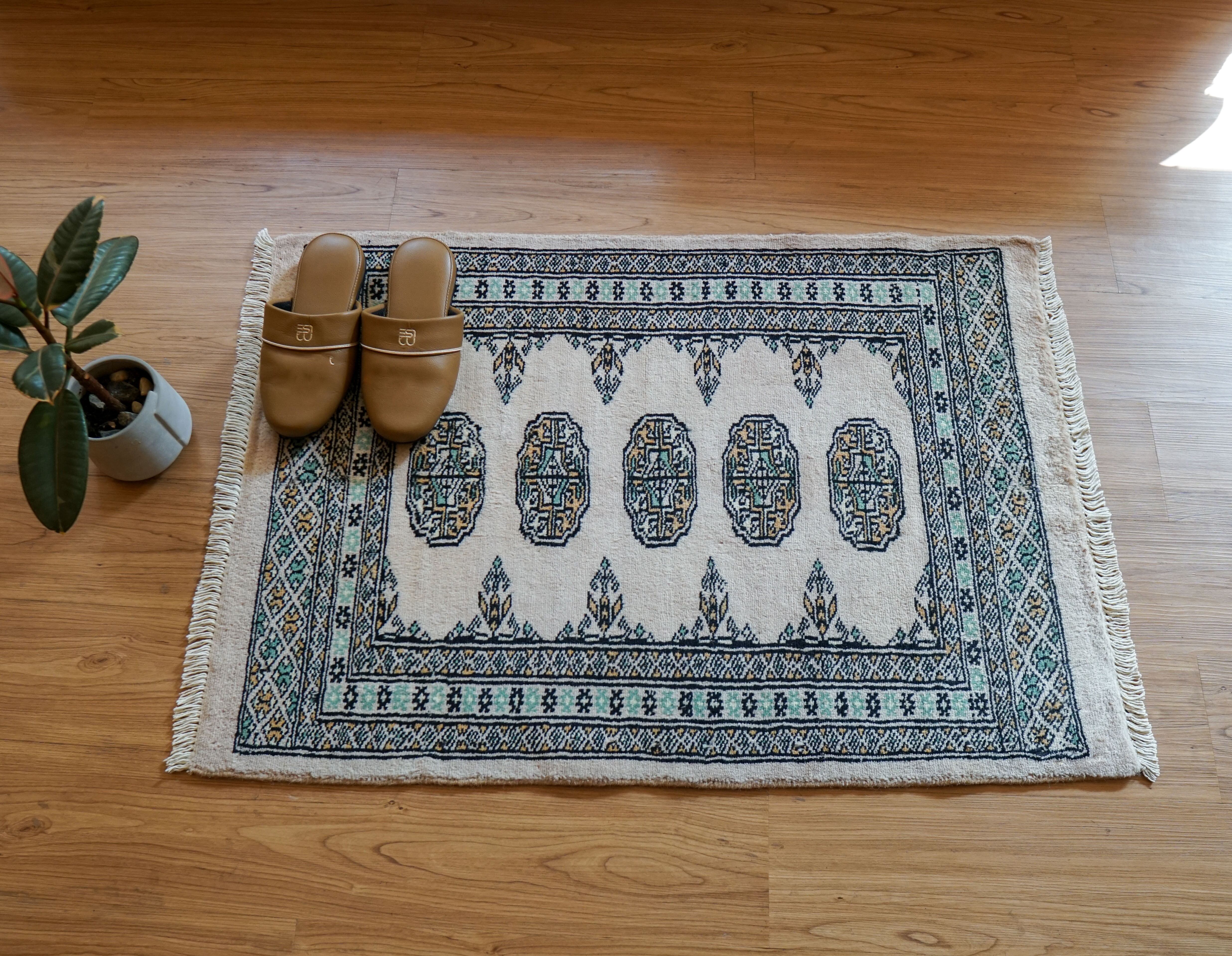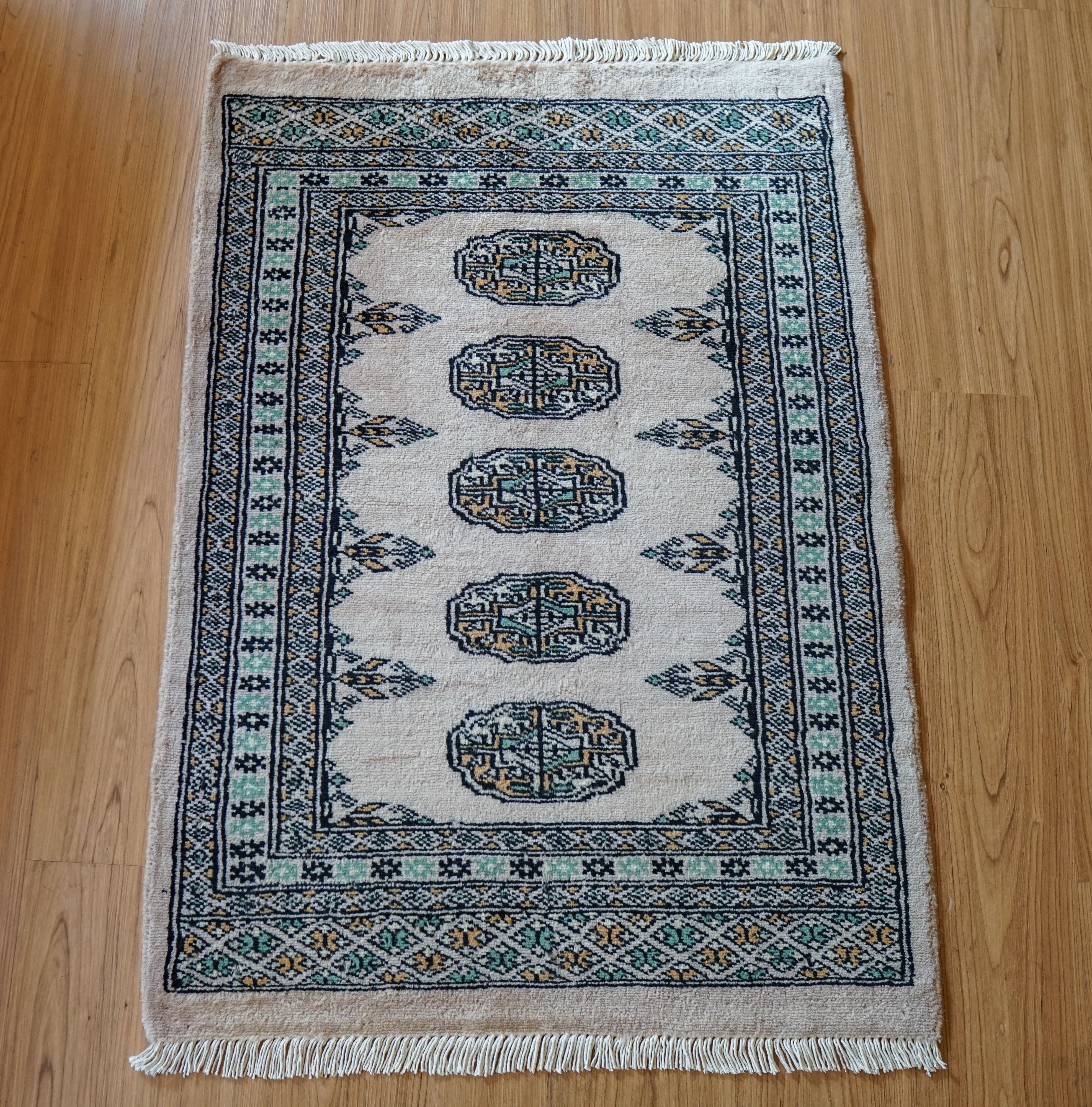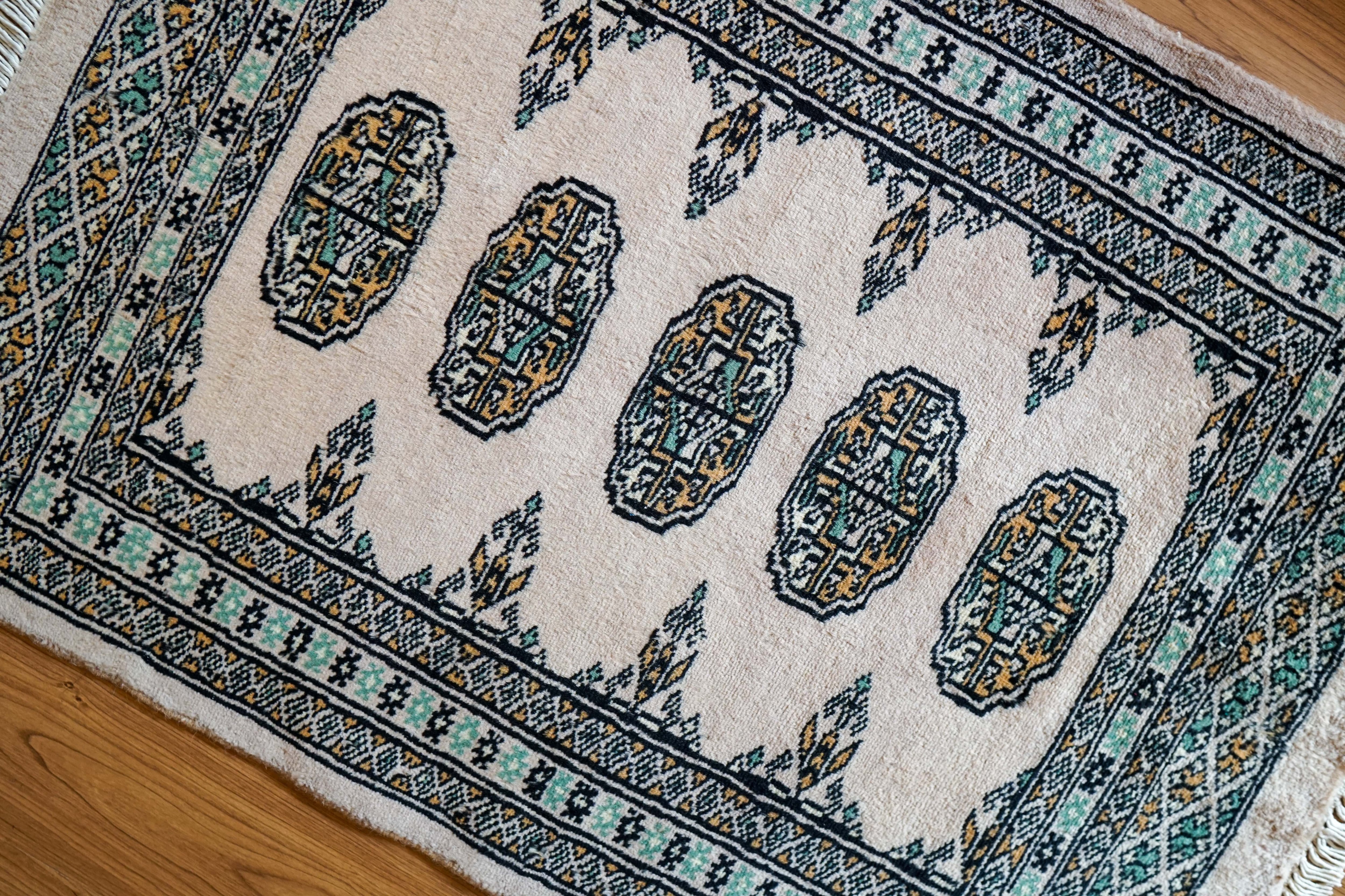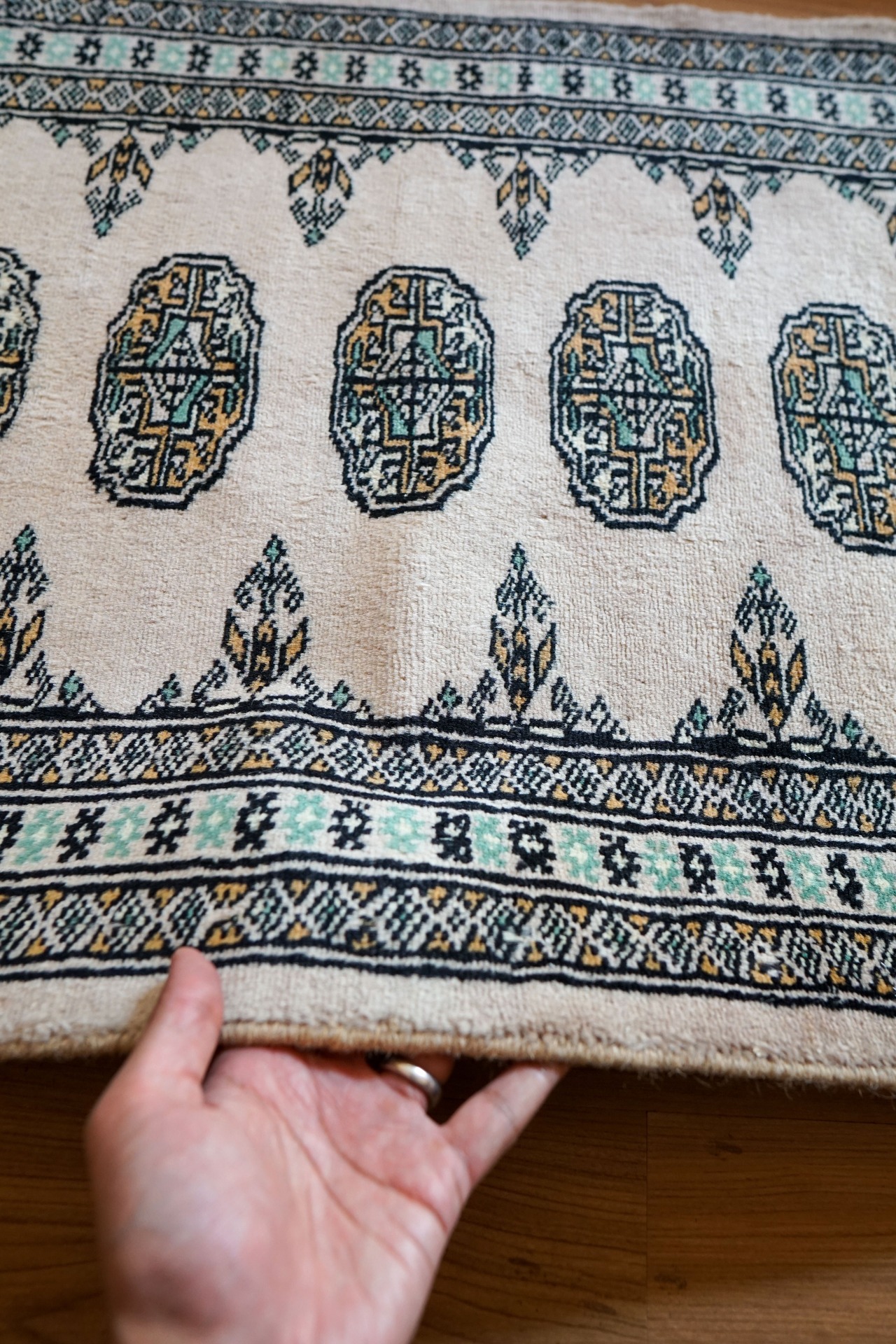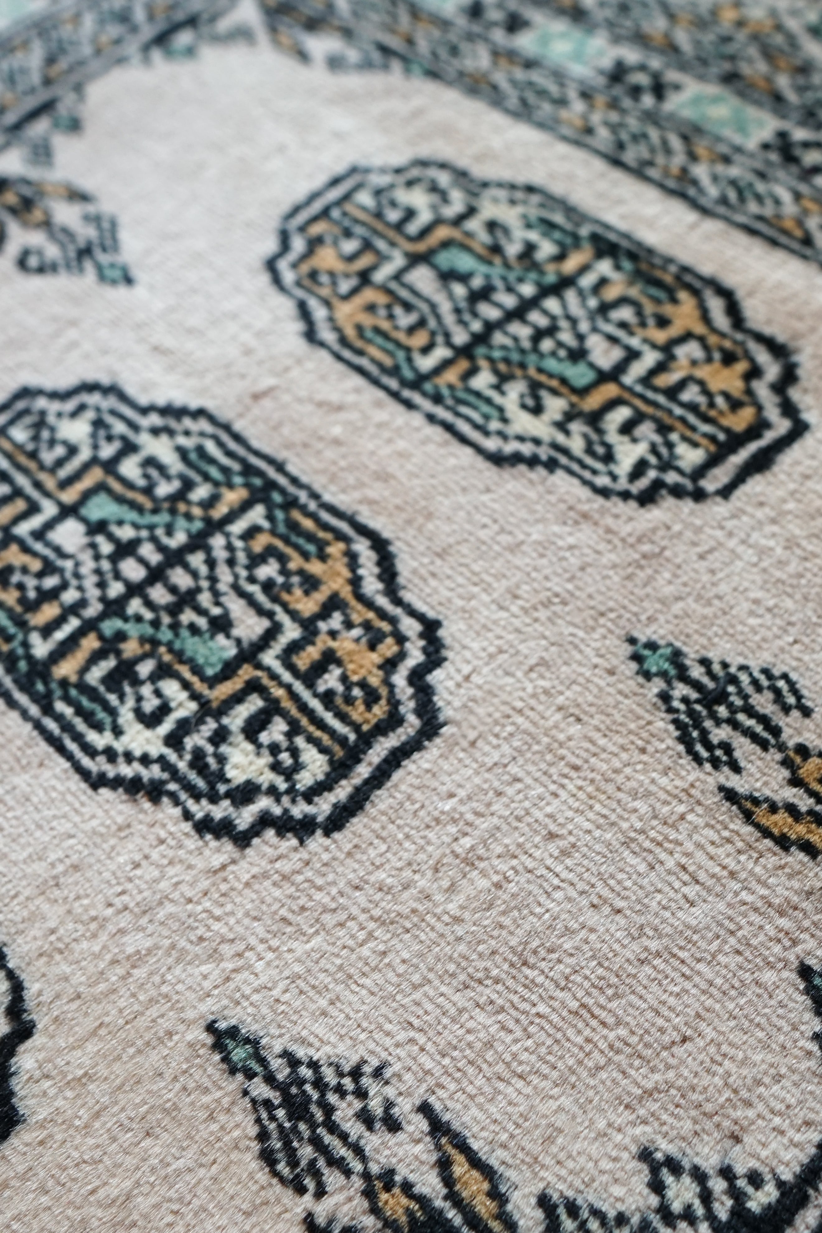 この美しい手織り絨毯は、パキスタンの伝統的な職人技を反映したボハラデザインを採用しています。サイズは94×65cmとコンパクトで、玄関などさまざまな空間に彩りを添えます。