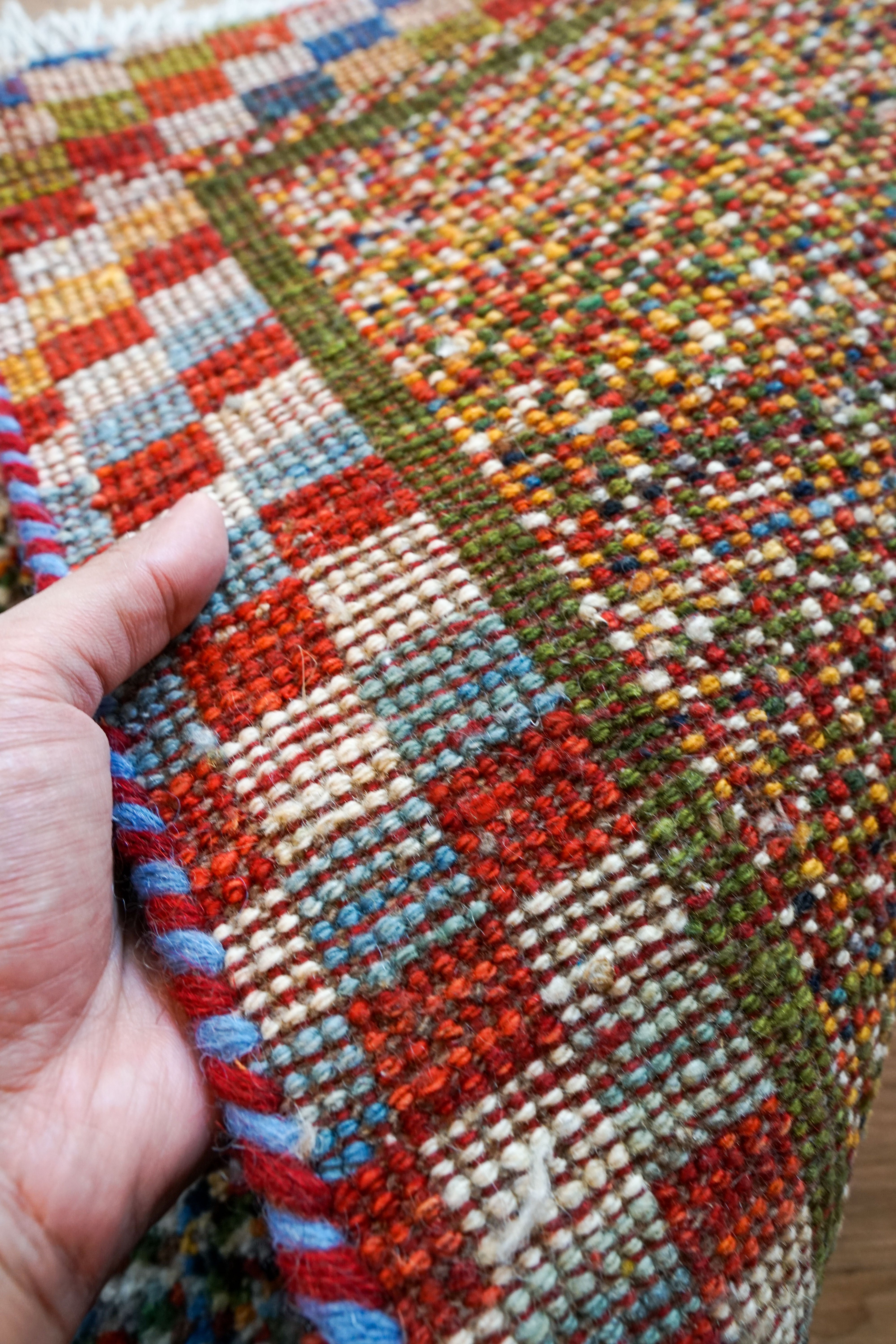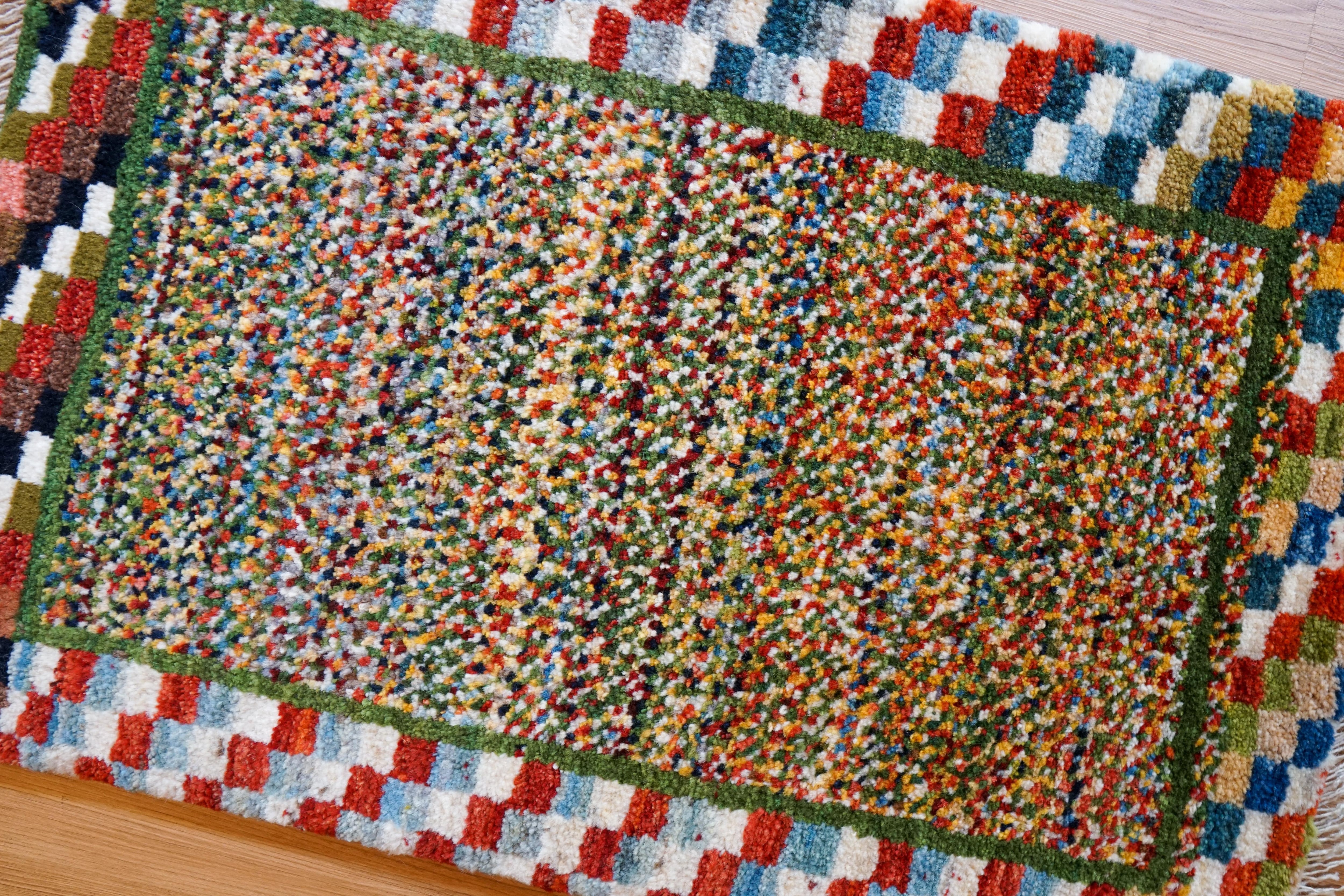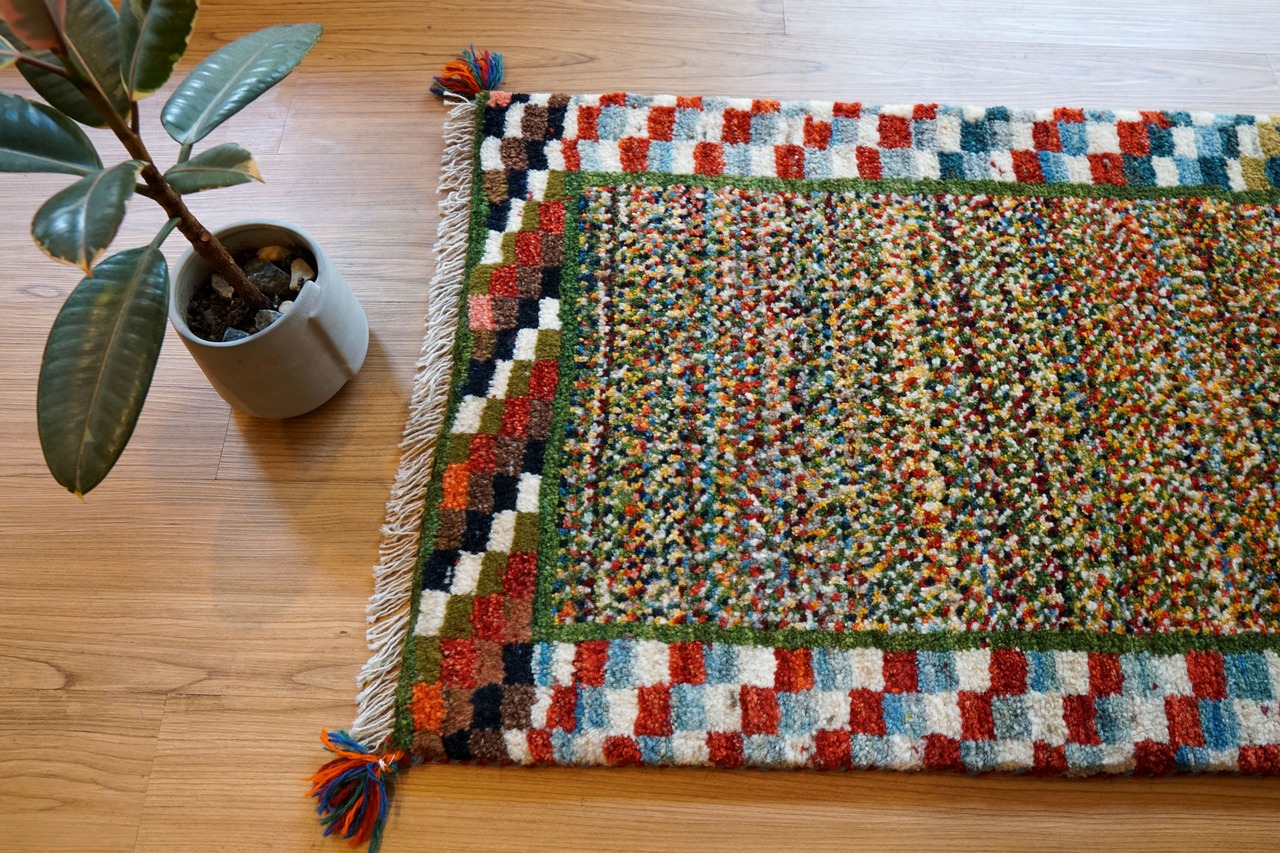 イランの遊牧民カシュガイ族が手織りする、草木染の手紡ぎウールを使ったギャッベという絨毯。太めのウールでざっくりと織られていて厚みがあり、素朴で可愛らしい柄・色遣いが特徴です。