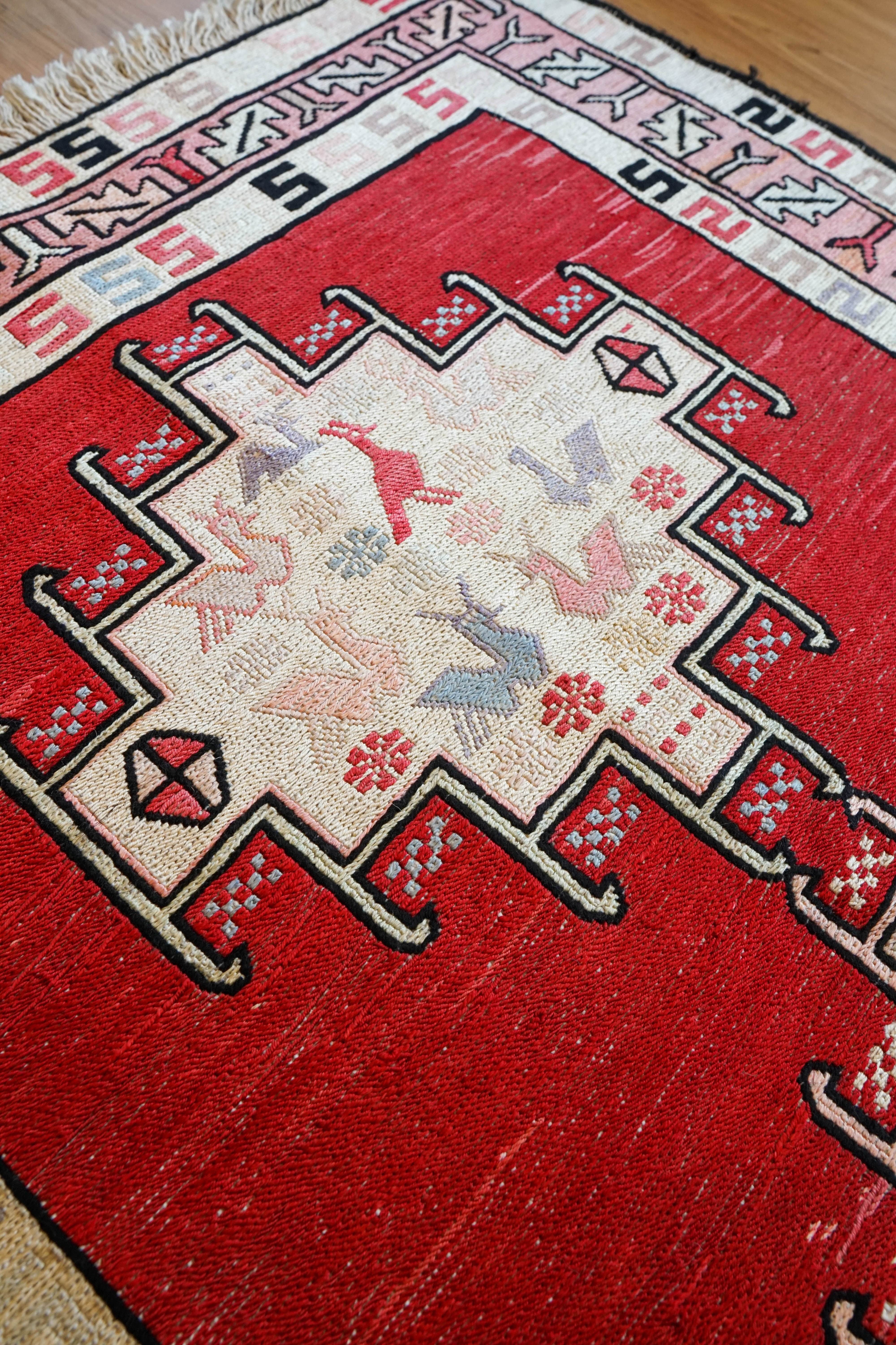 イラン北西部の伝統技法「スマック織り」で丁寧に仕上げられた、96×74cmサイズのペルシャ手織りキリム。シルクを使用した細やかな文様は、遊牧民が代々受け継いできた幾何学模様と自然のモチーフを表現しています。スマック織りはキリムの中でも特に耐久性が高く、立体的な織り目が美しい陰影を生み出します。古くから部族の歴史や信仰を紡いできたこの織物は、今も手仕事の温かさと文化の深みを感じさせる一枚です。