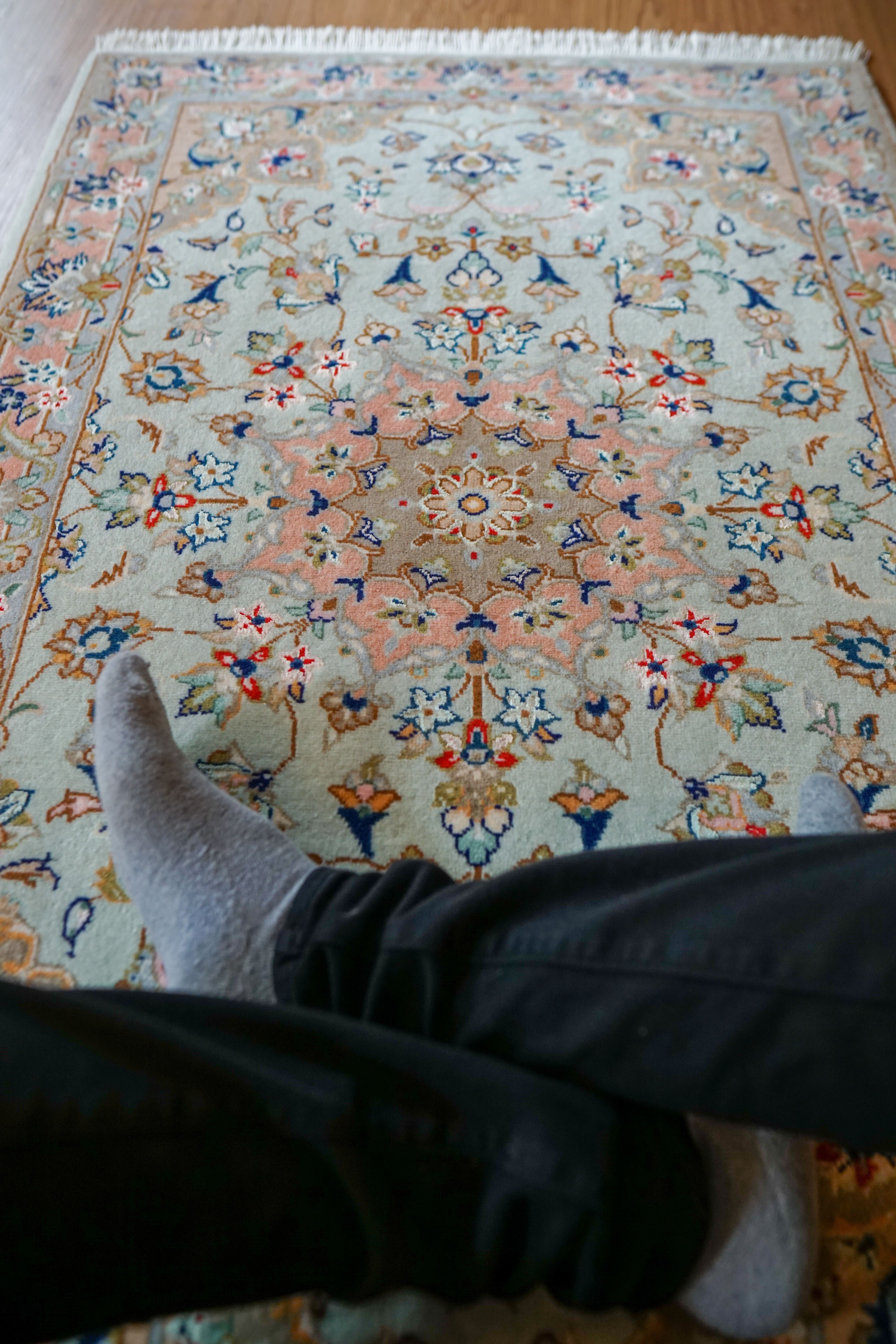 130×85cmのペルシャ絨毯、カシャーン産。ライトブルーを基調に、上品なピーチトーンのボーダーが優しく調和する一枚です。中心には花をモチーフにした繊細なメダリオンが広がり、細部まで丁寧に織り込まれた文様が空間に気品と落ち着きを添えます。ウールの温かみとシルクの艶やかさが絶妙に調和し、光の角度によって豊かな表情を見せてくれるのも魅力です。
