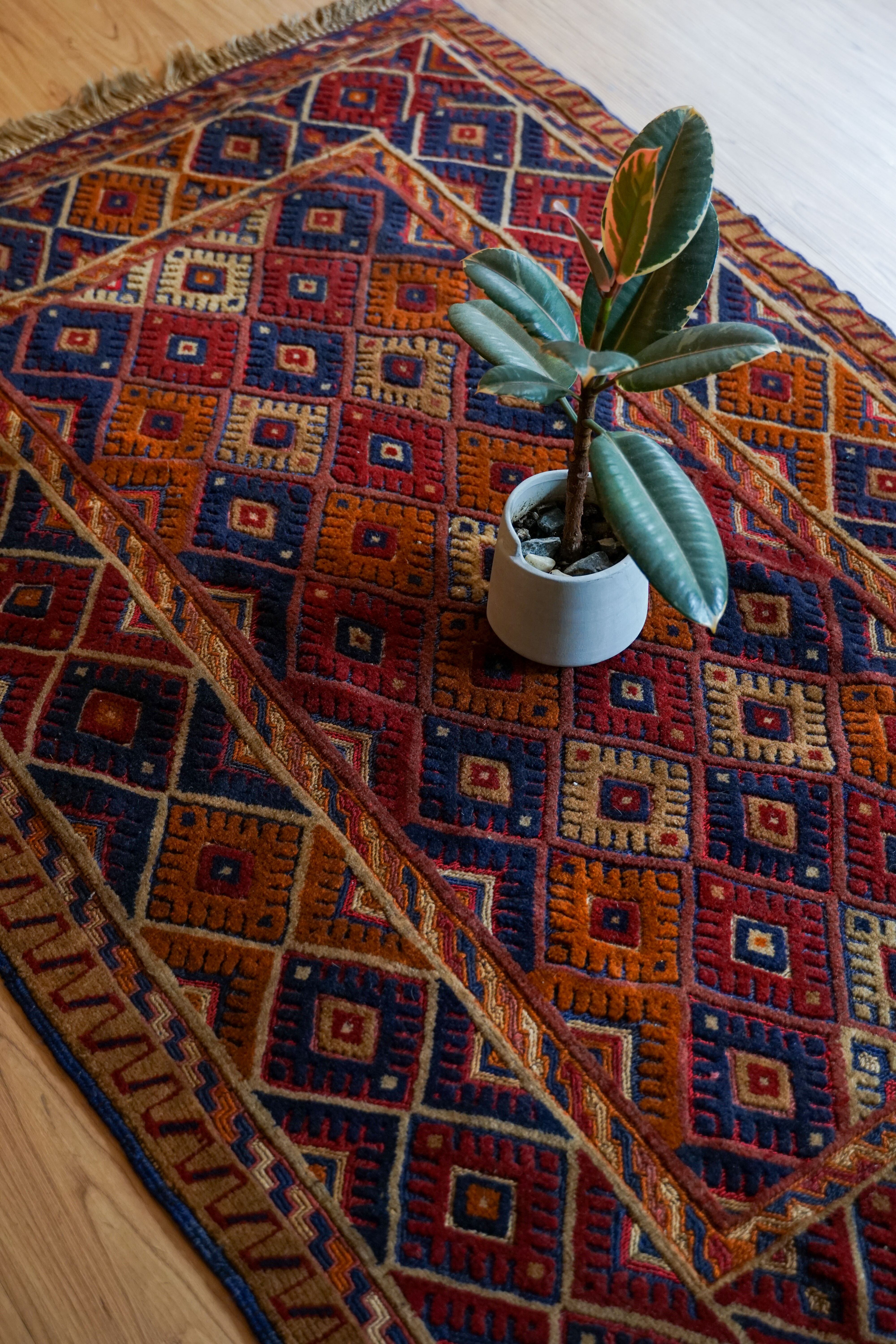 アフガニスタン東部のマシュワニ族によって織られる「マシュワニキリム」は、絨毯とキリムの技法を組み合わせた独自の織物です。本品は145×96cmのサイズで、古典的な幾何学文様が整然と並ぶオールドキリム。赤や藍、ベージュを基調とした落ち着いた色合いが特徴で、部族の生活や信仰を反映するシンボリックなデザインが施されています。マシュワニの歴史は古く、交易路シルクロードを通じて周辺文化とも交流しながら独自の織りを発展させてきました。