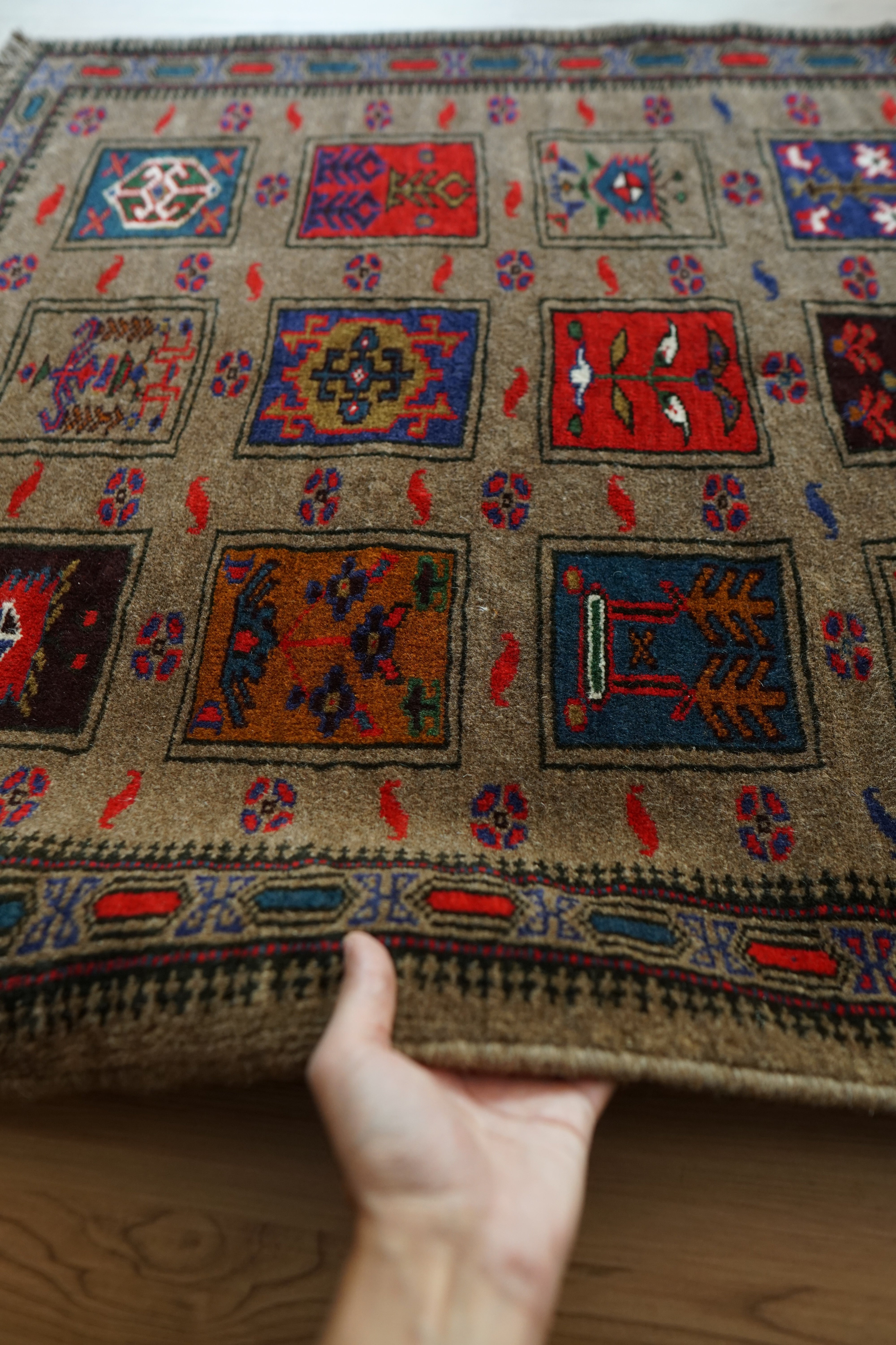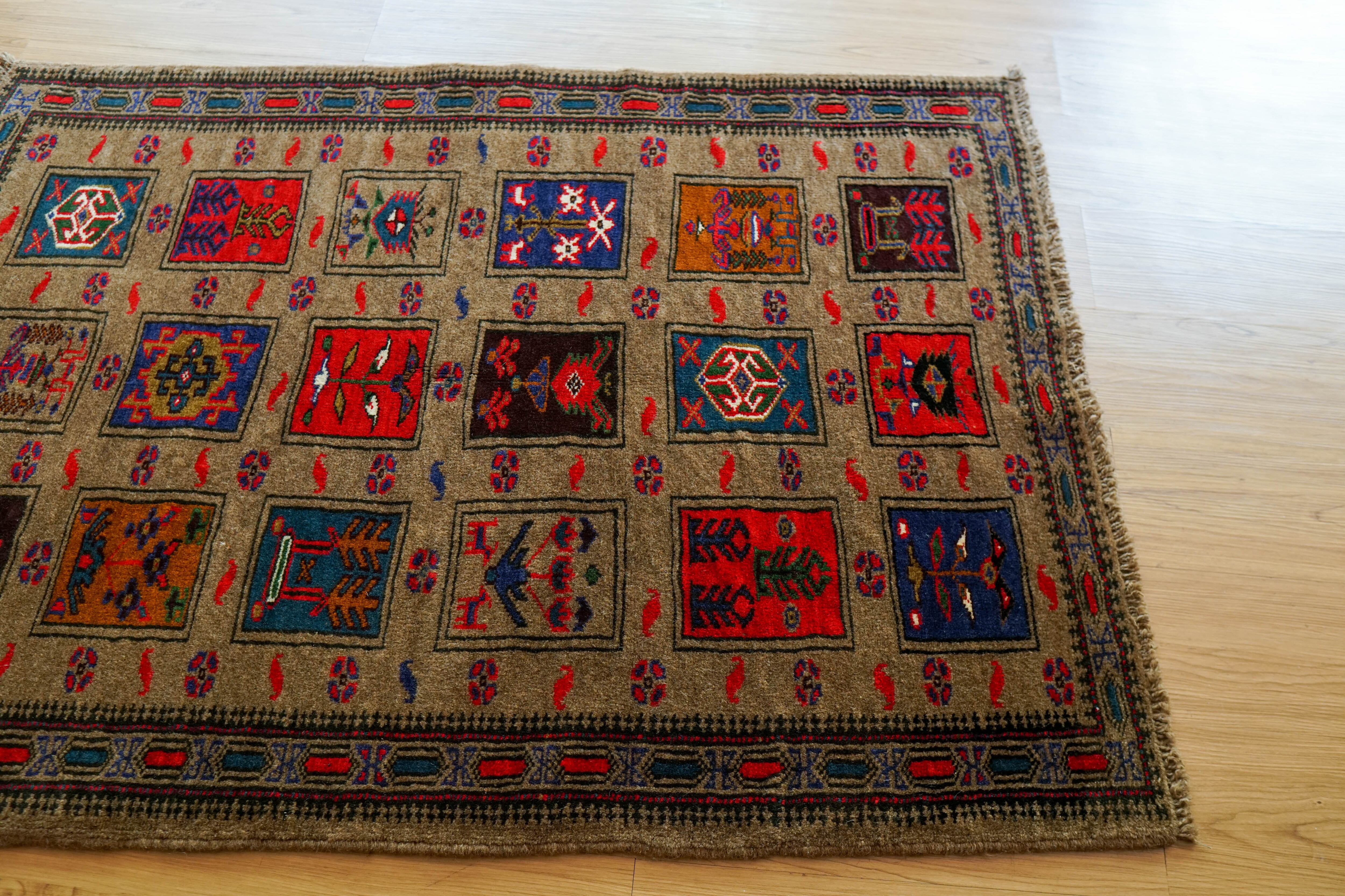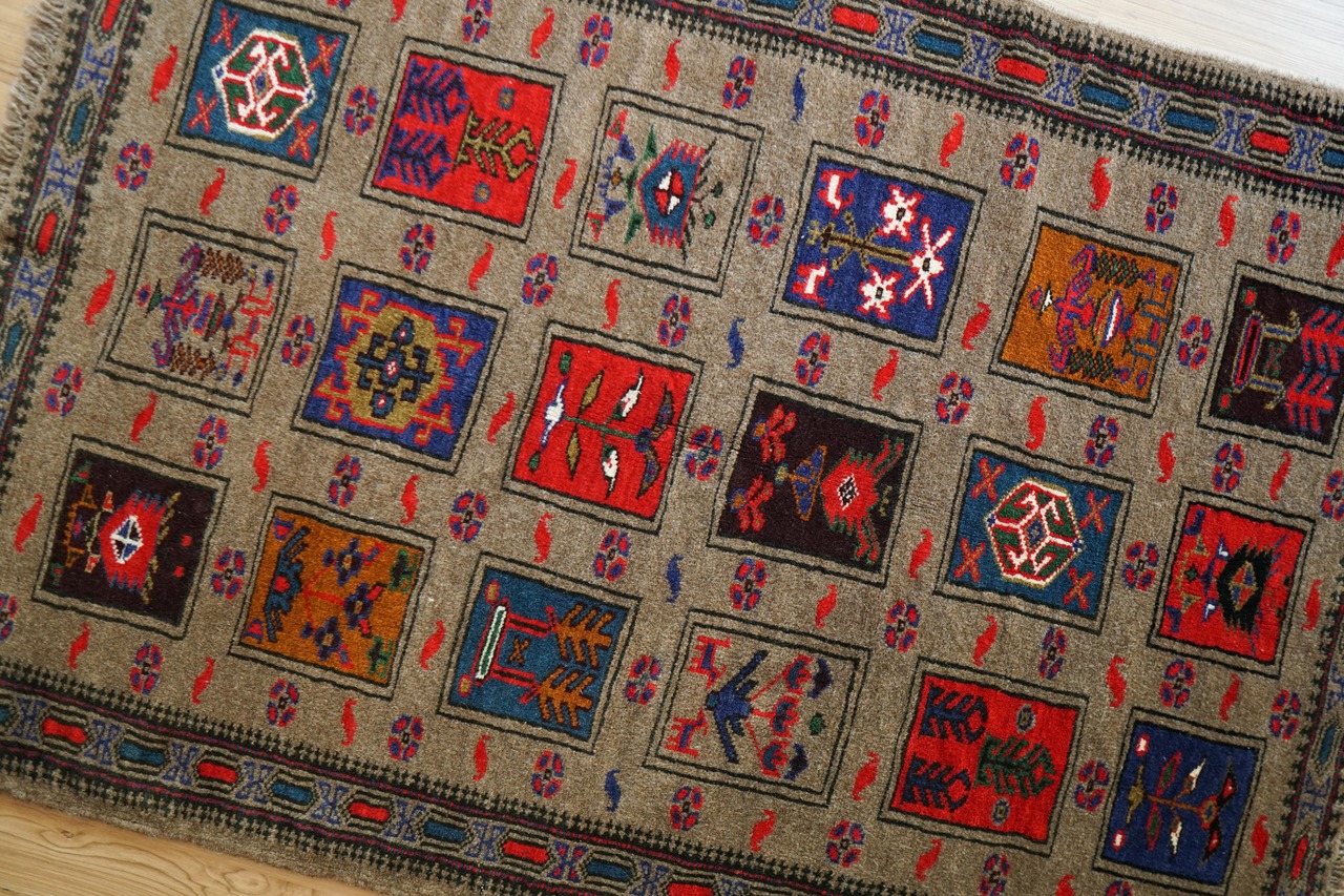 こちらは、イラン東部からアフガニスタン西部にかけて暮らすバルーチ族(Baloch)によって織られた、132×94cmの手織りヴィンテージラグです。落ち着いたグレーを基調に、深みのある赤・青・オレンジが美しく映えるデザインが特徴。幾何学模様とシンボリックなモチーフの中に、部族の祈りや自然への敬意、そして日常の物語が静かに息づいています。