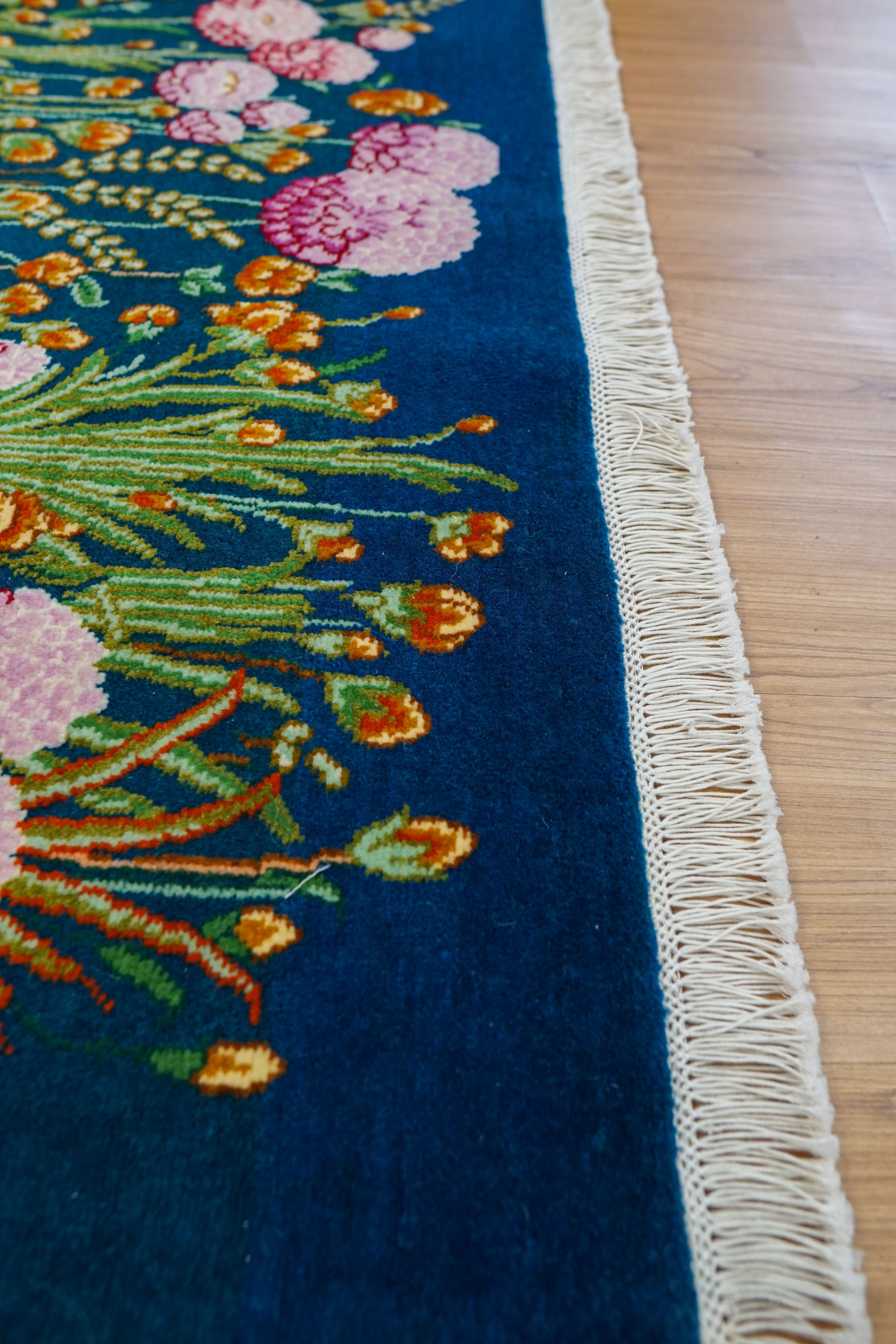 この絨毯には高品質のウールが使われており、触れたときに感じるやわらかさと、しっとりとした風合いが魅力です。結び目は非常に細かく、密度の高い織りによって図案がくっきりと表現され、長く愛用しても型崩れしにくいしっかりした作りになっています。