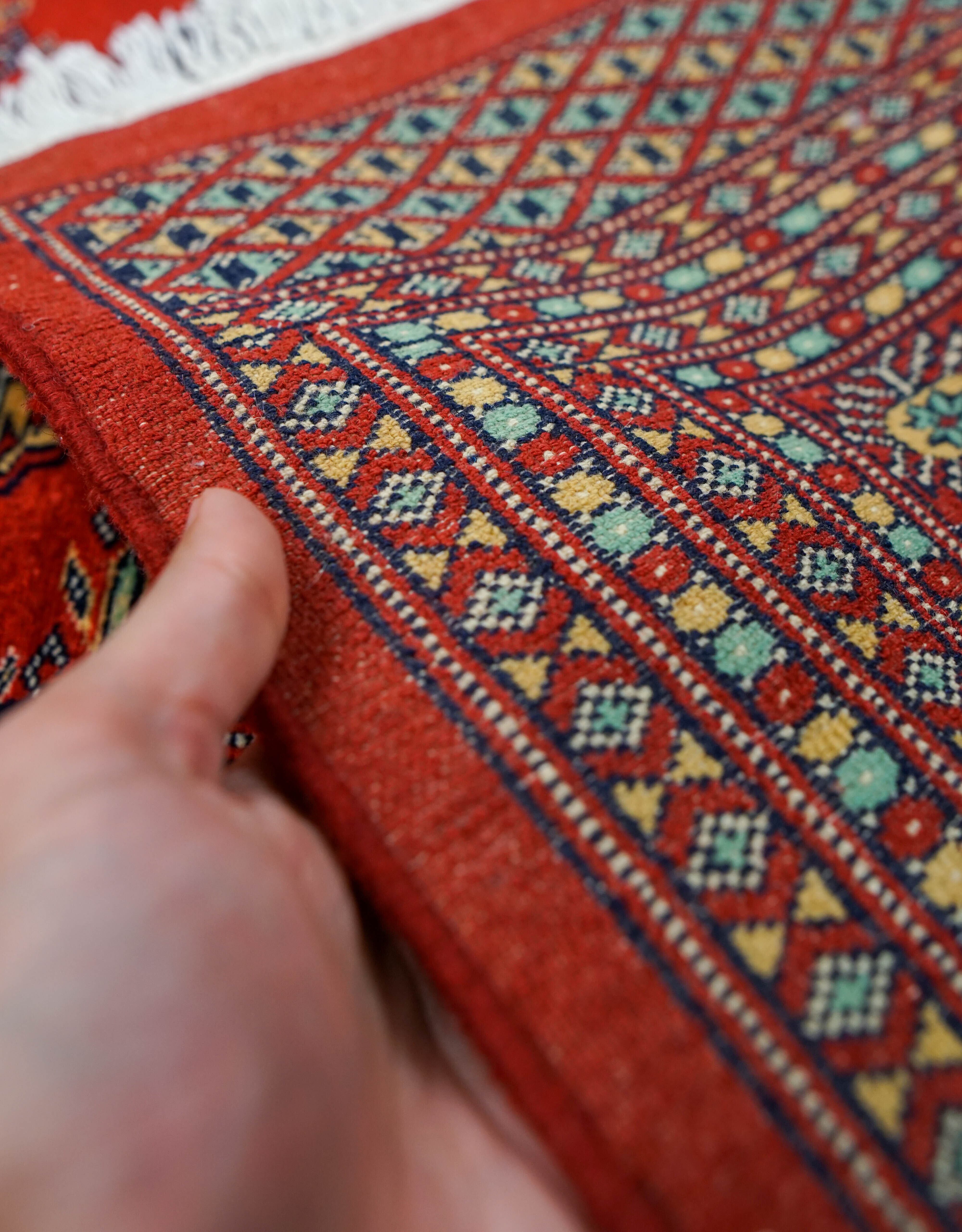 パキスタン絨毯で人気の『Bokhara(ボハラ)』は、トルクメニスタンの国旗にも使われている由緒ある柄で、象の足跡をモチーフにしています。