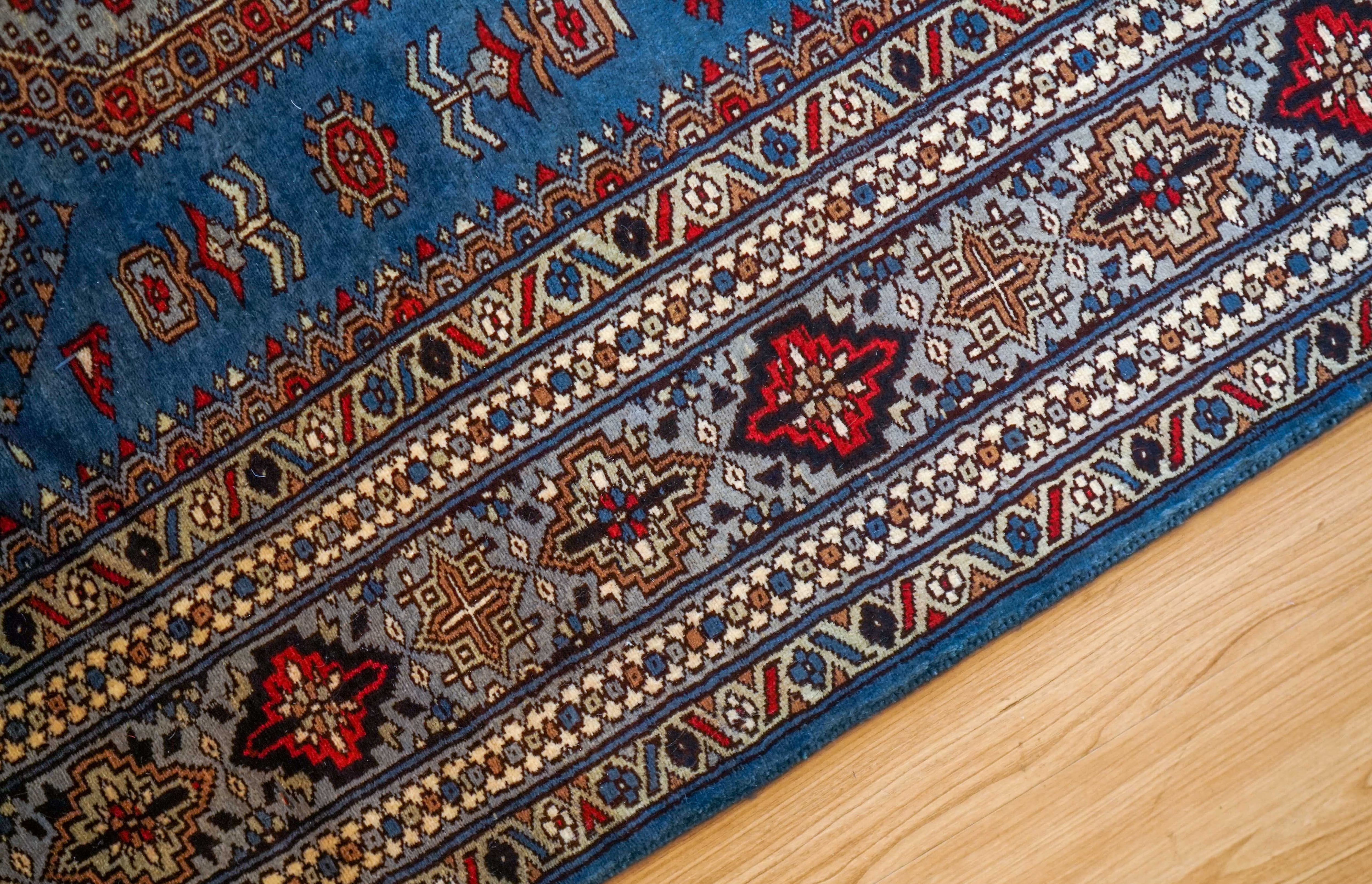 こちらはパキスタンの名産品として高く評価される、ファインクオリティの手織りラグです。素材にはニュージーランド産のメリノウールが贅沢に使用され、しっとりとした手触りとシルクのような上品な光沢が特徴です。細い糸を高密度で織り上げることで、複雑な文様を鮮明に表現できるのもメリノウールならではの魅力です。