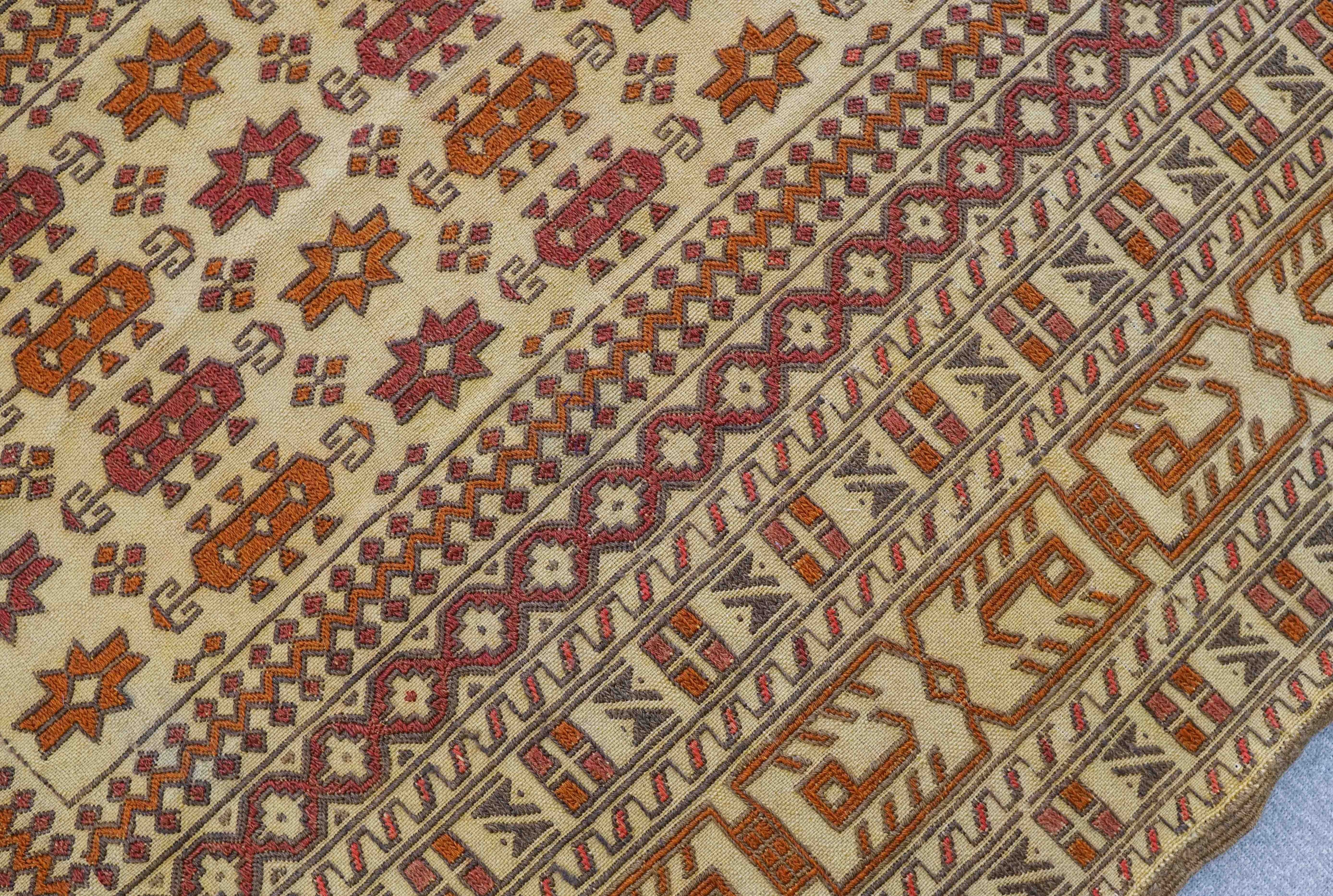 イランの遊牧民によって手織りされたスザニキリム。毛足のない平織りのトライバルラグ『キリム』に刺繍をプラスしたものを『スザニキリム』と呼びます。ウズベキスタンをはじめとする中央アジアの布刺繍が良く知られていますが、その名前はぺルシャ語の「スザン(針)」に由来します。