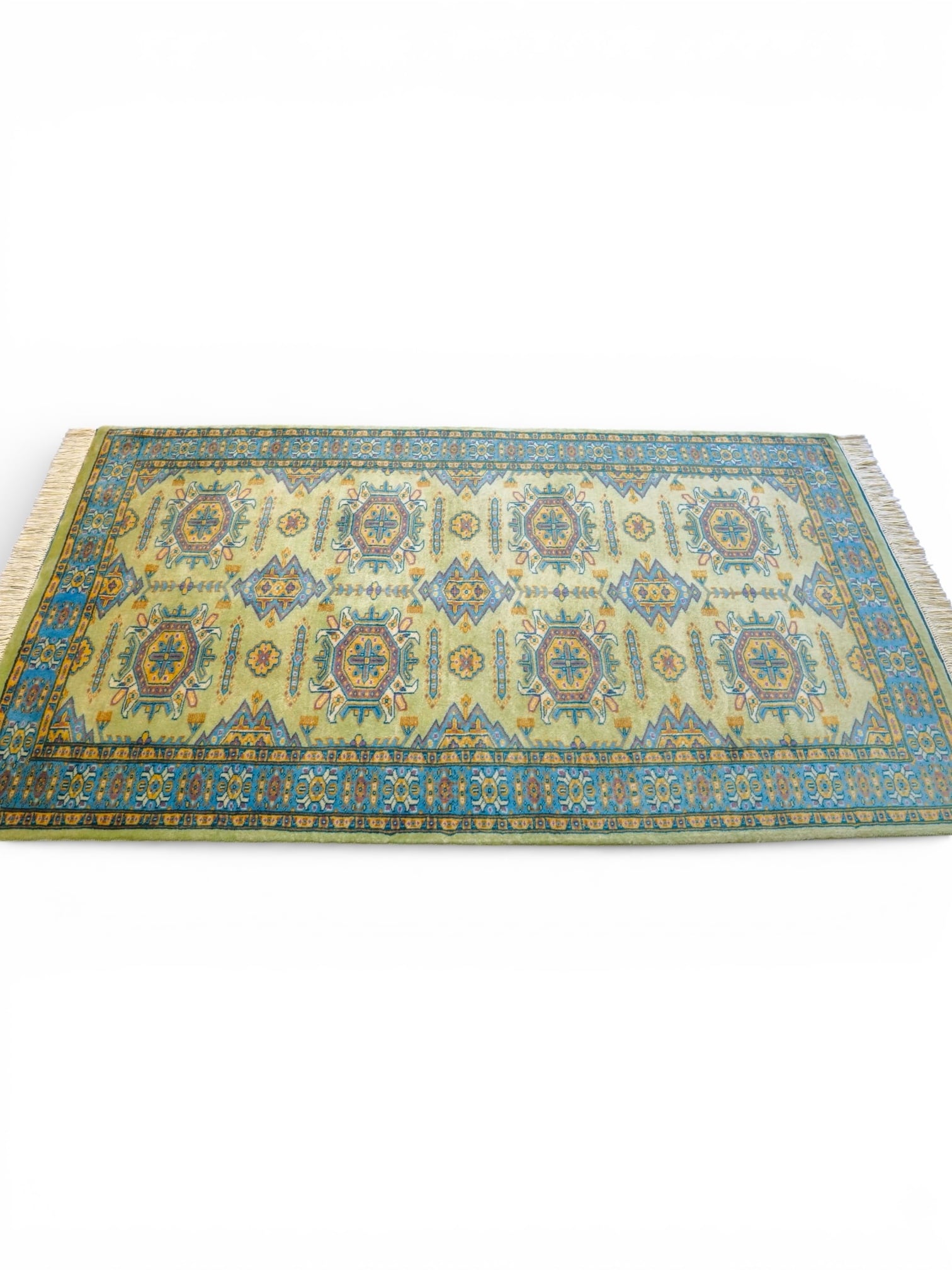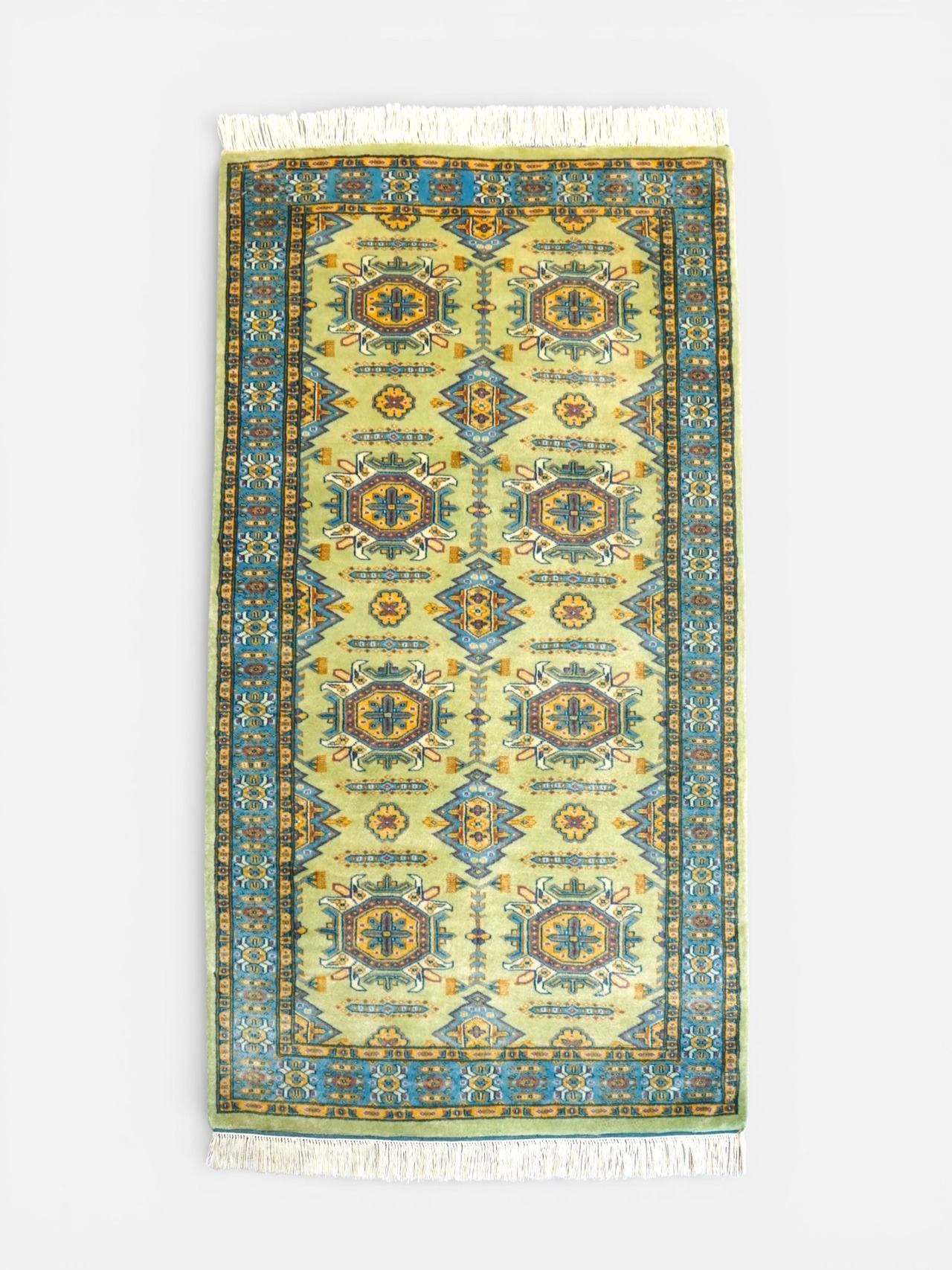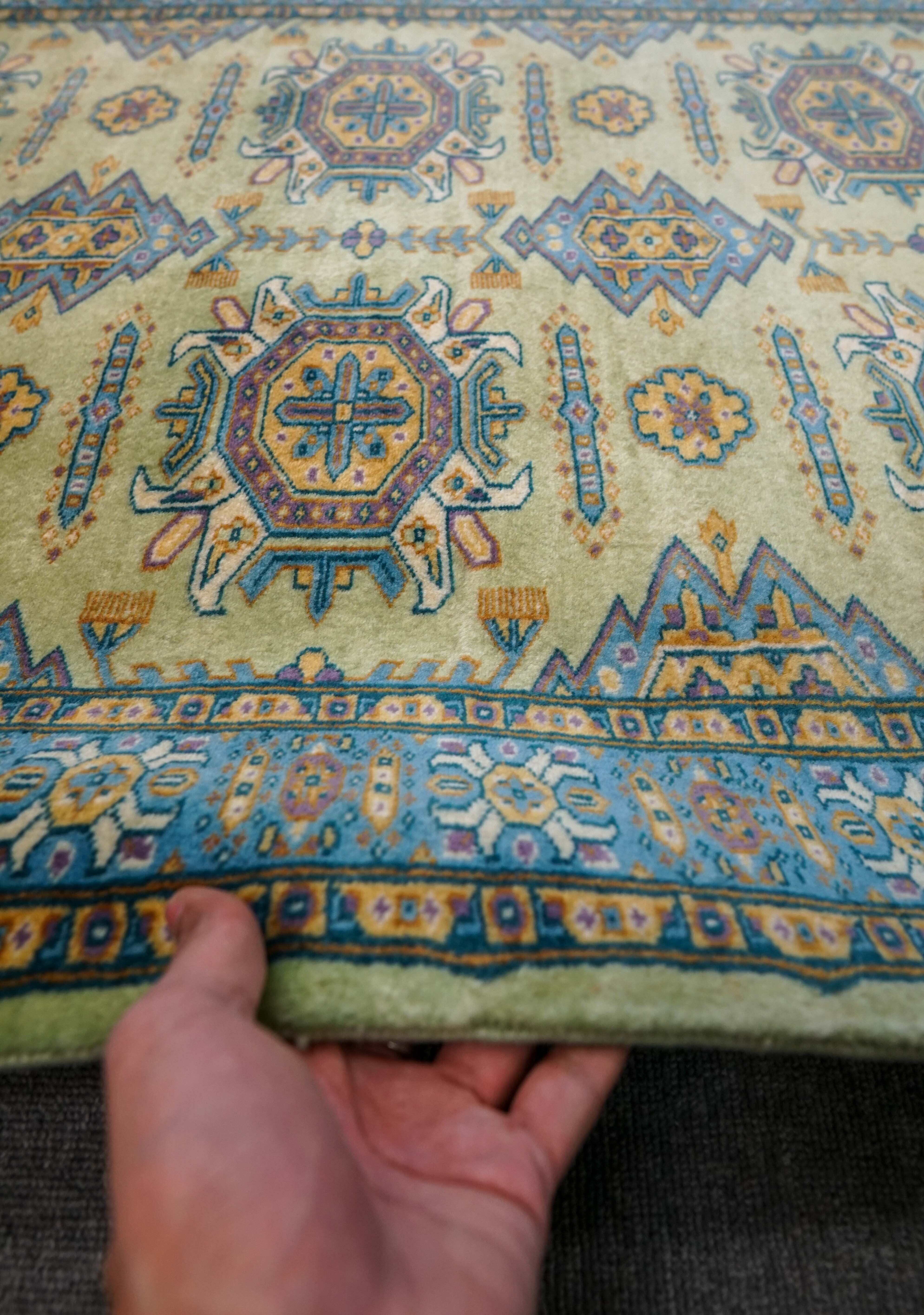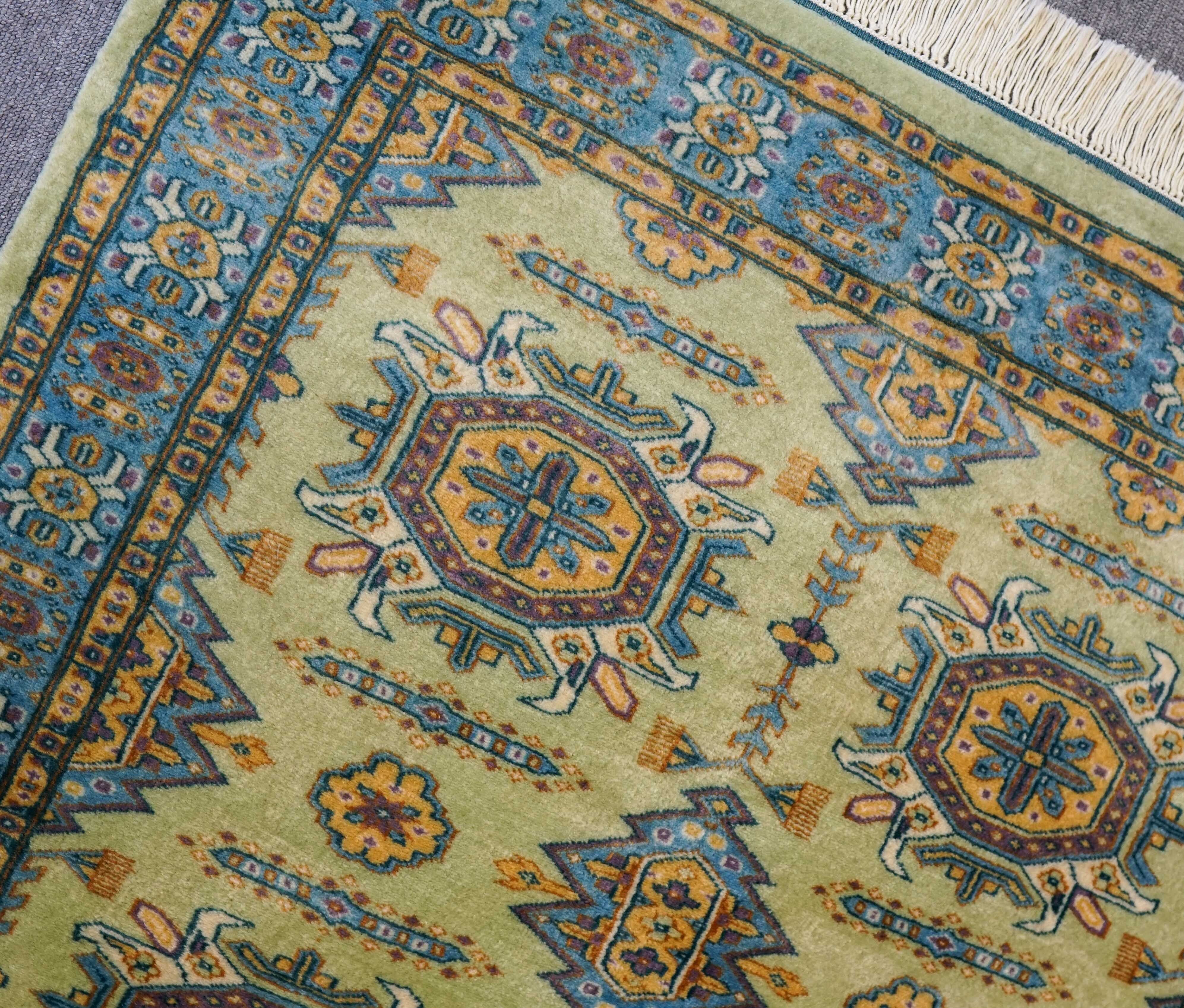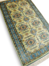 ニュージーランド産の上質なウールを使用し、信頼できる熟練した職人が手織りしたパキスタン絨毯です。ウールはタンパク質をたくさん含んでいるためハリ、艶に富んでいます。肌触りはなめらかで柔らかく、弾力のあるパイル地が底冷えを防ぎ足元を快適にします。