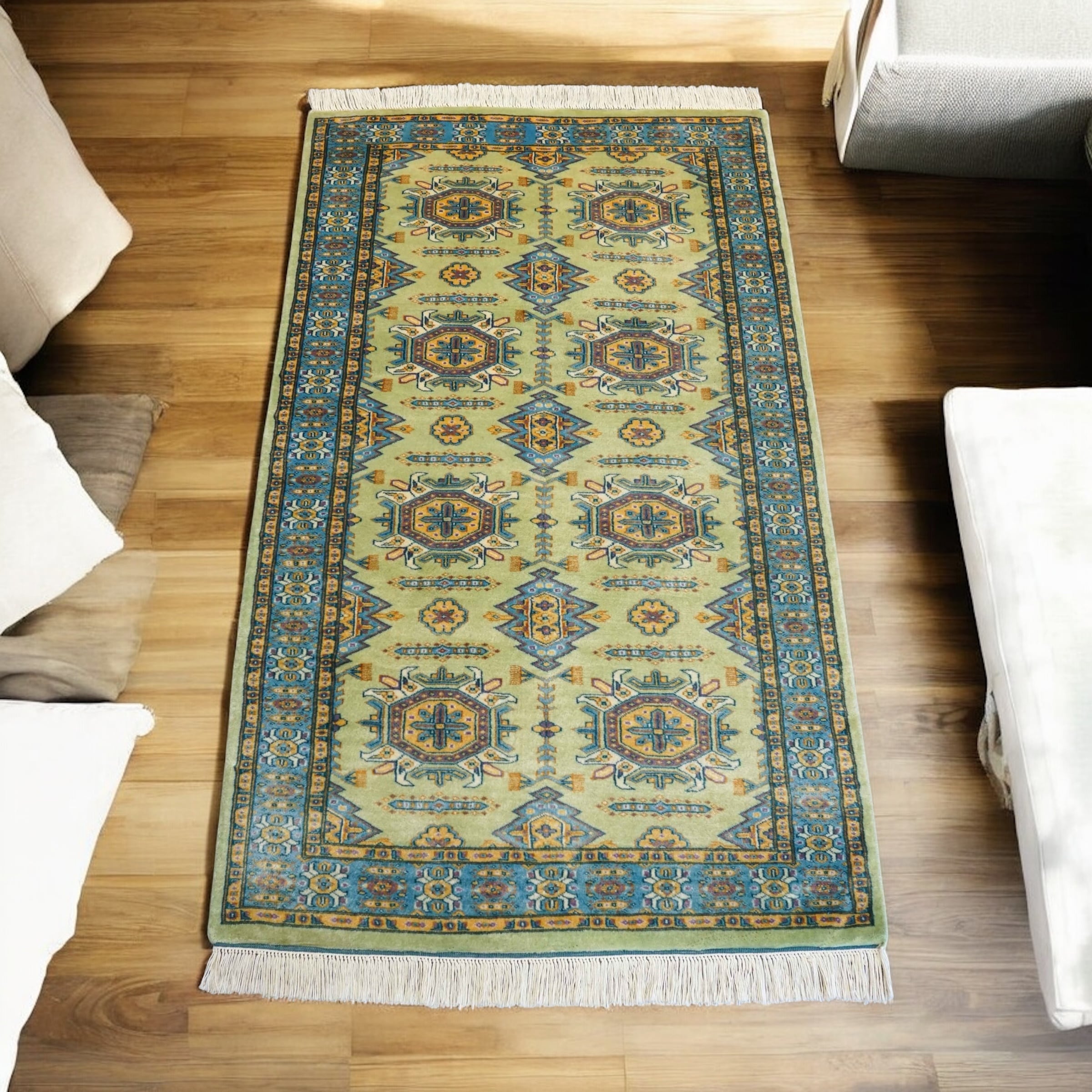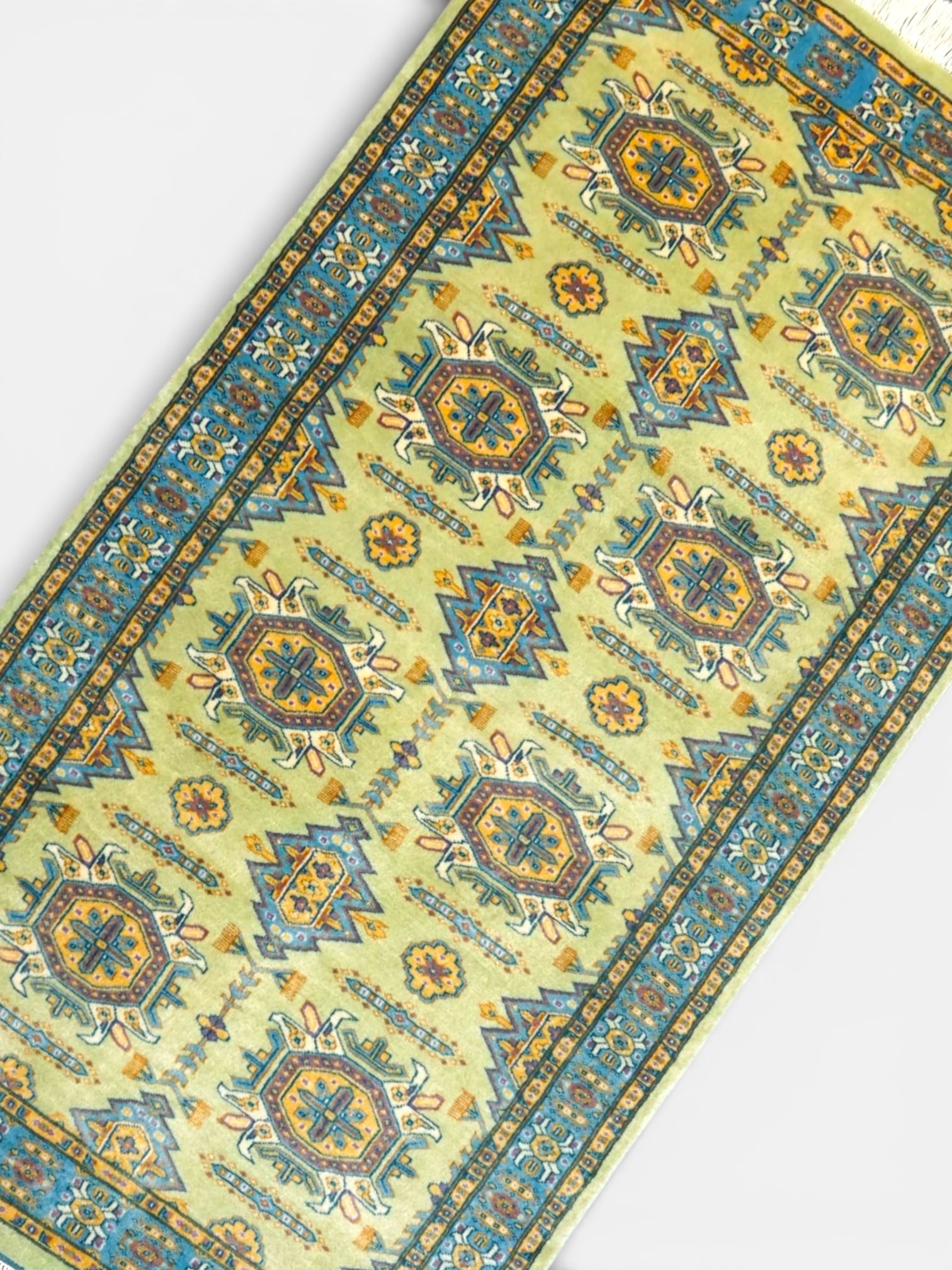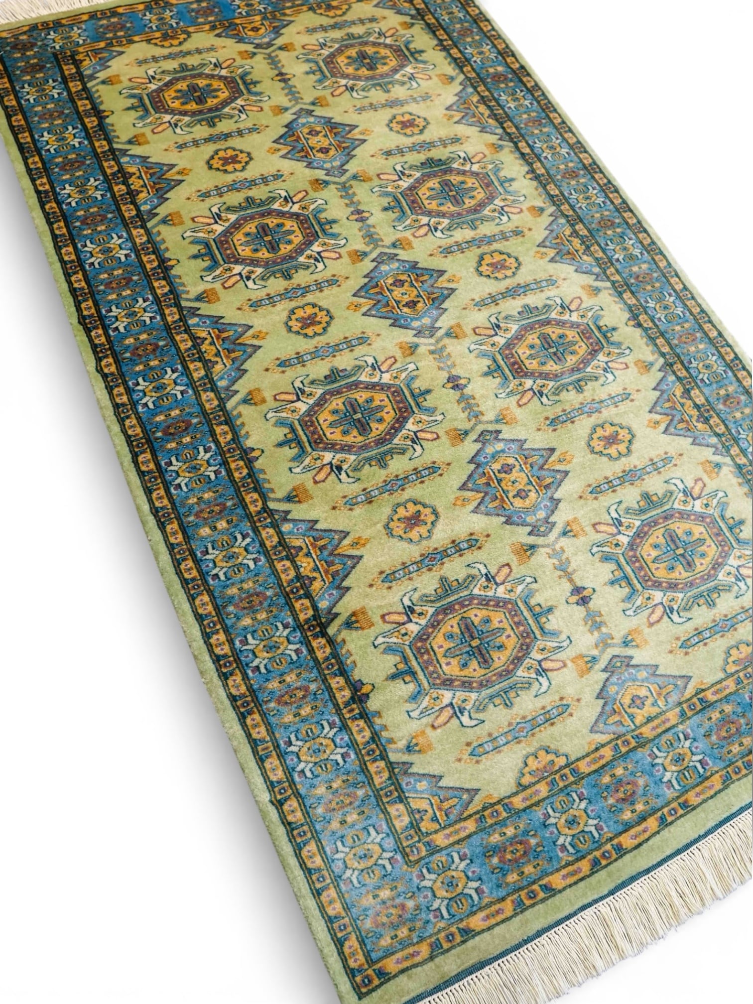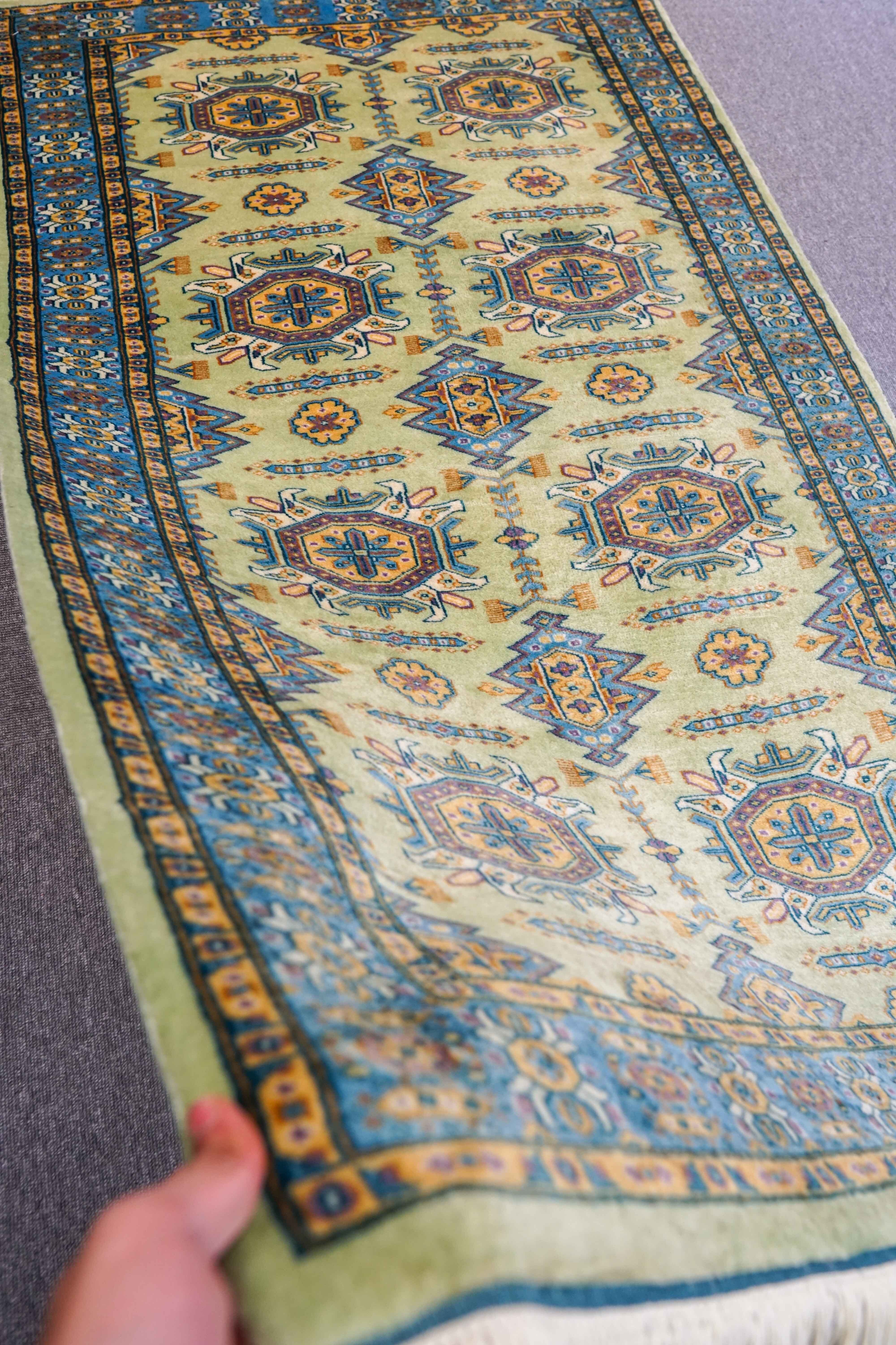 ニュージーランド産の上質なウールを使用し、信頼できる熟練した職人が手織りしたパキスタン絨毯です。ウールはタンパク質をたくさん含んでいるためハリ、艶に富んでいます。肌触りはなめらかで柔らかく、弾力のあるパイル地が底冷えを防ぎ足元を快適にします。