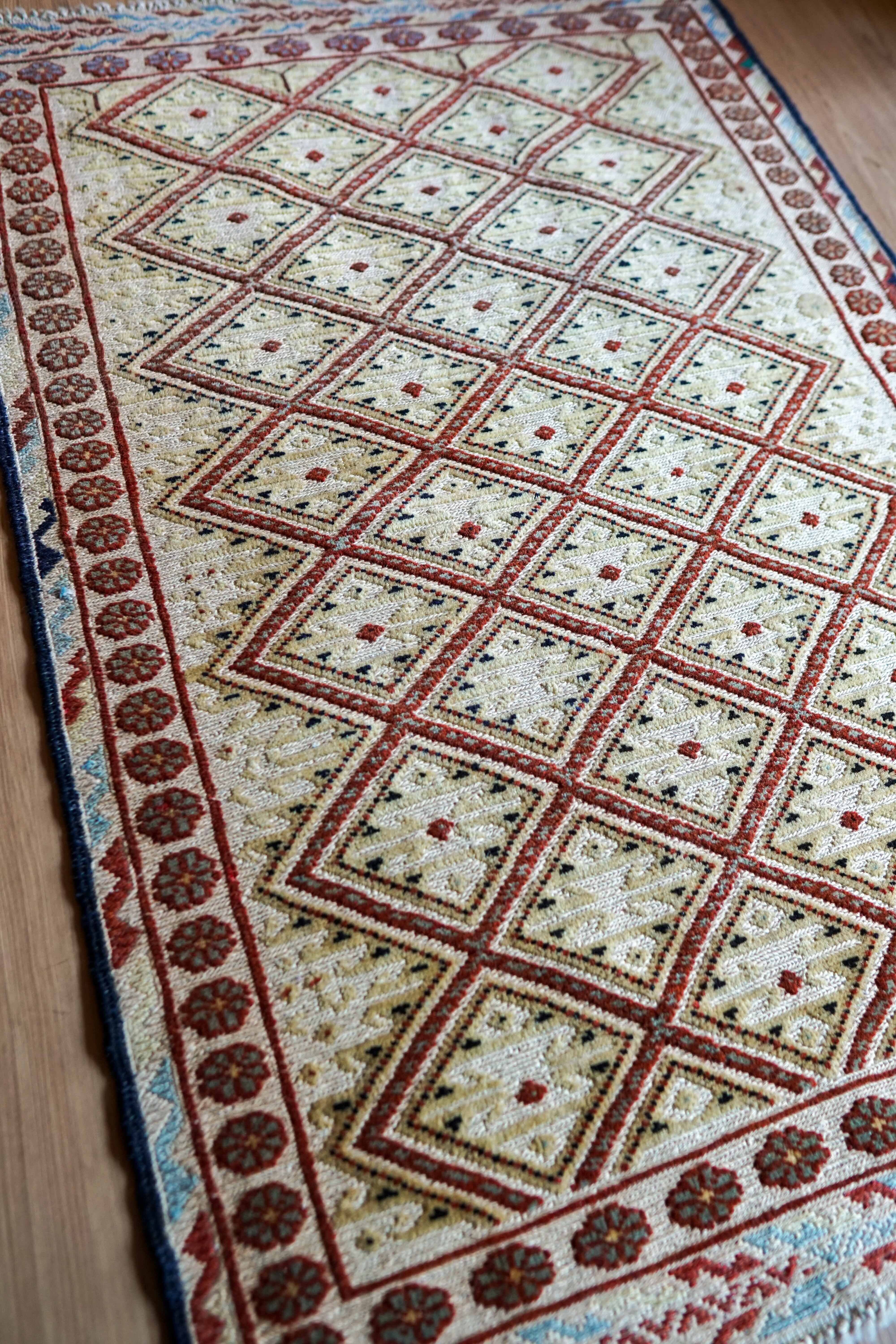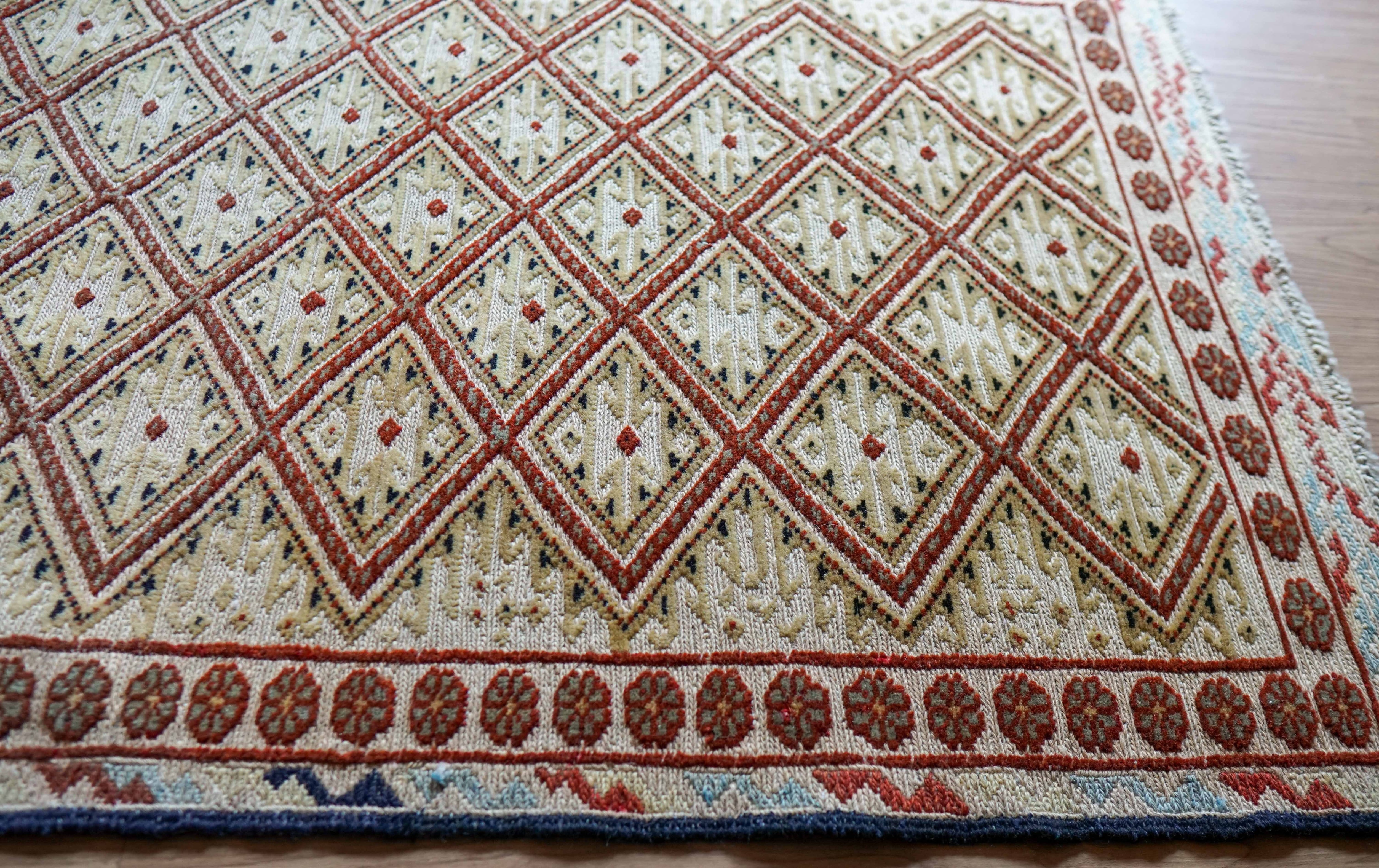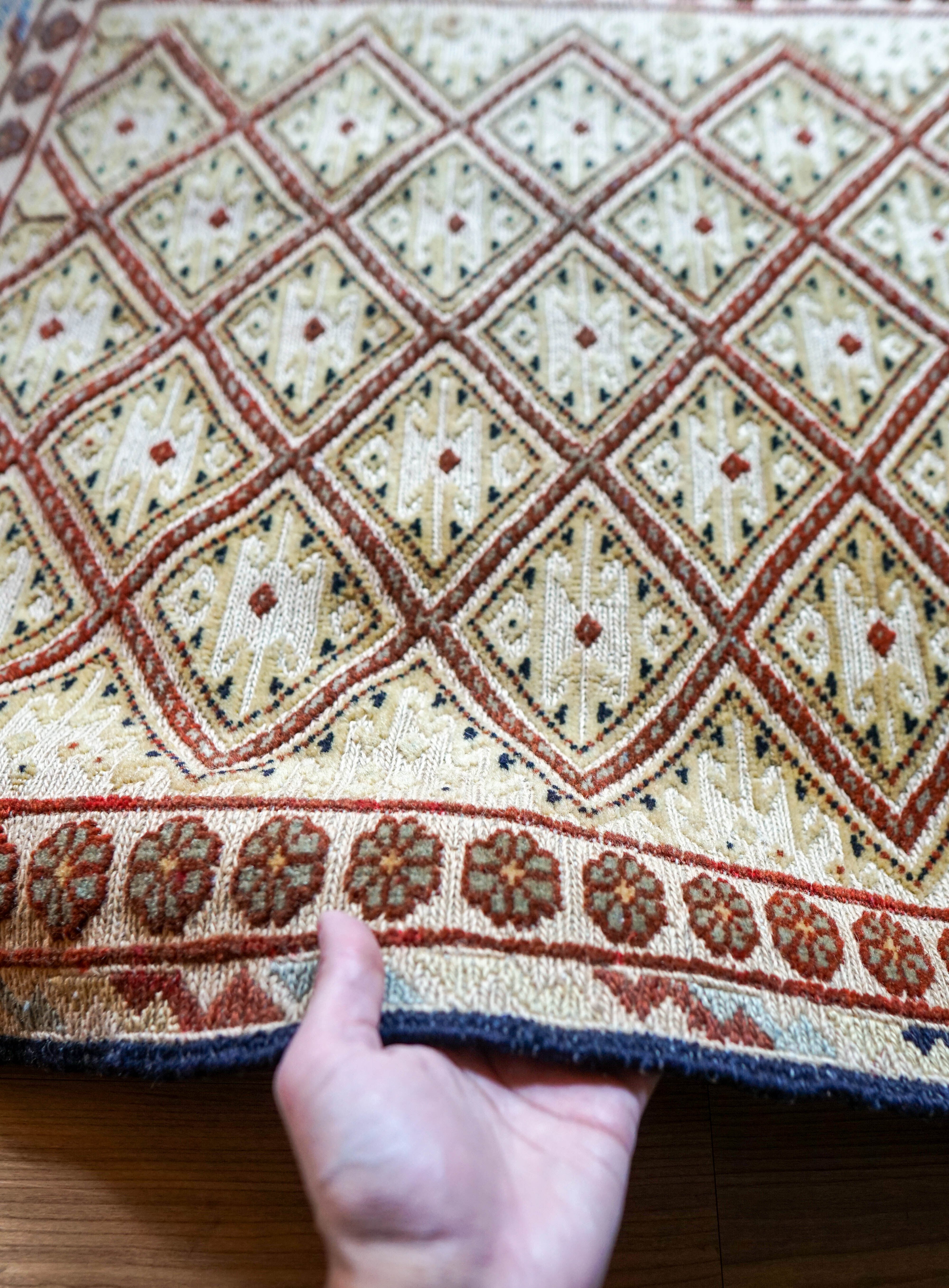 毛足のない麻のような肌触りのキリムと、パイル地の絨毯部分を合わせもった凸凹のある絨毯で、幾何学的なデザインが美しく、踏み心地も大変良いです。