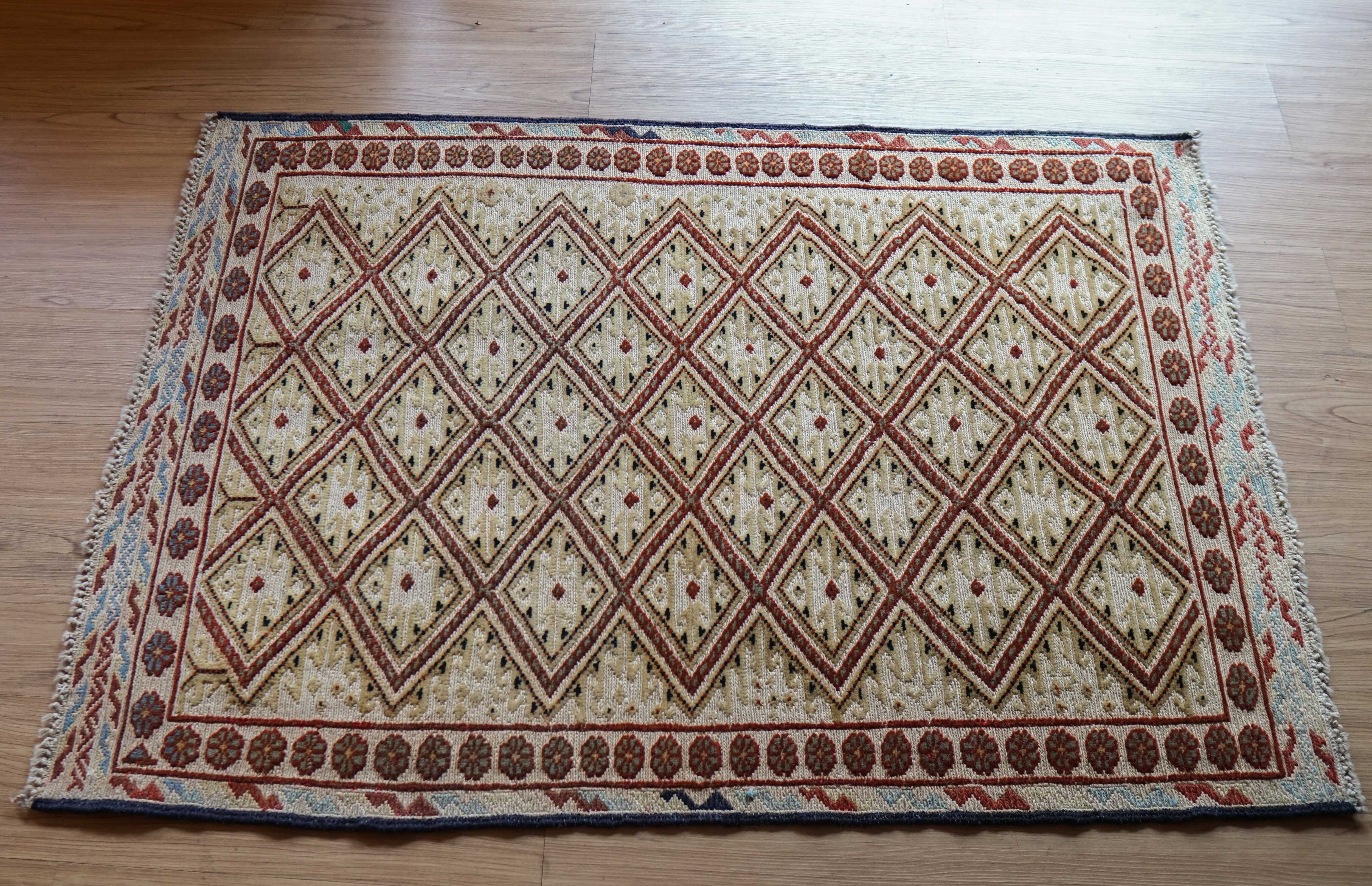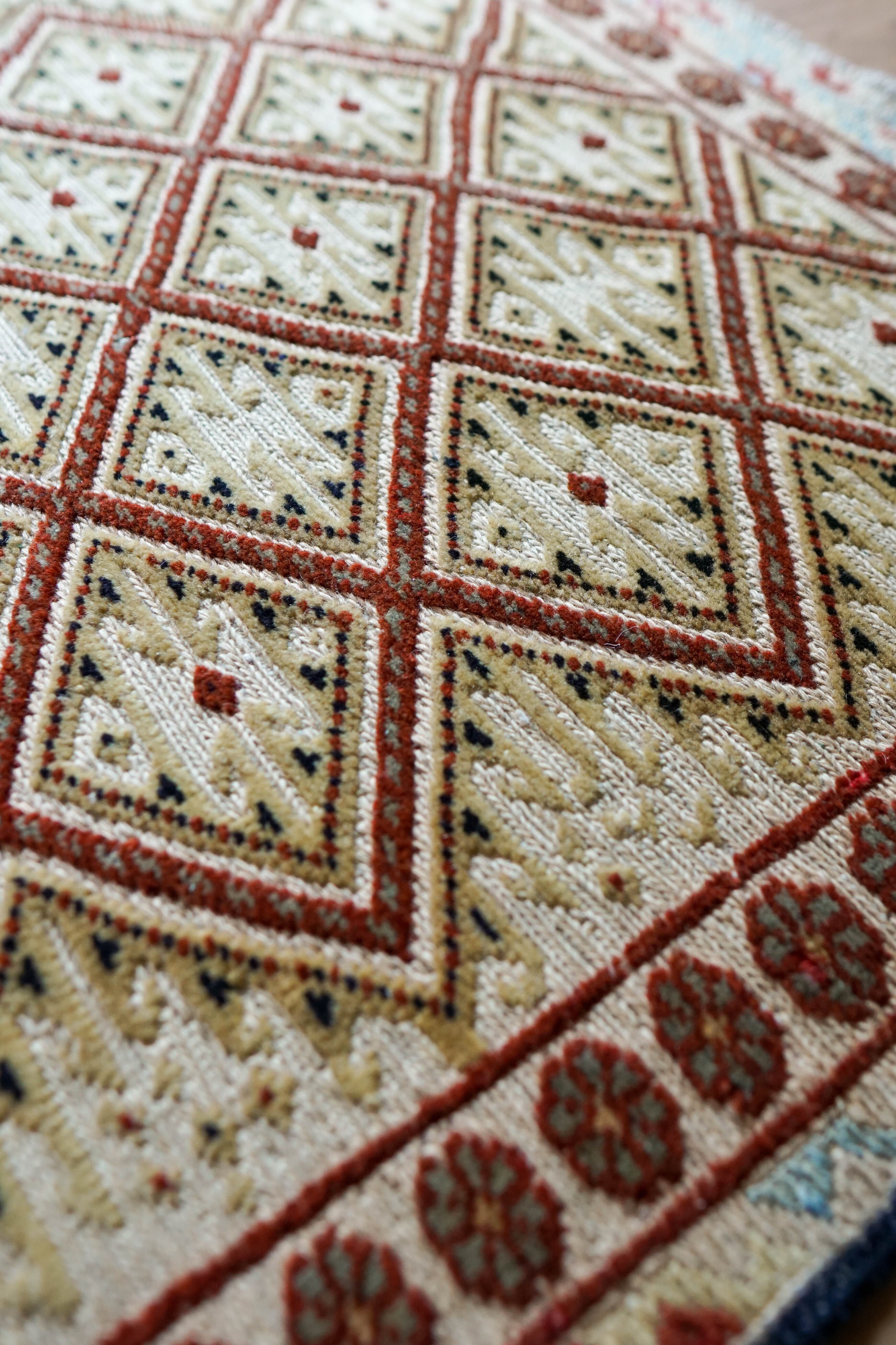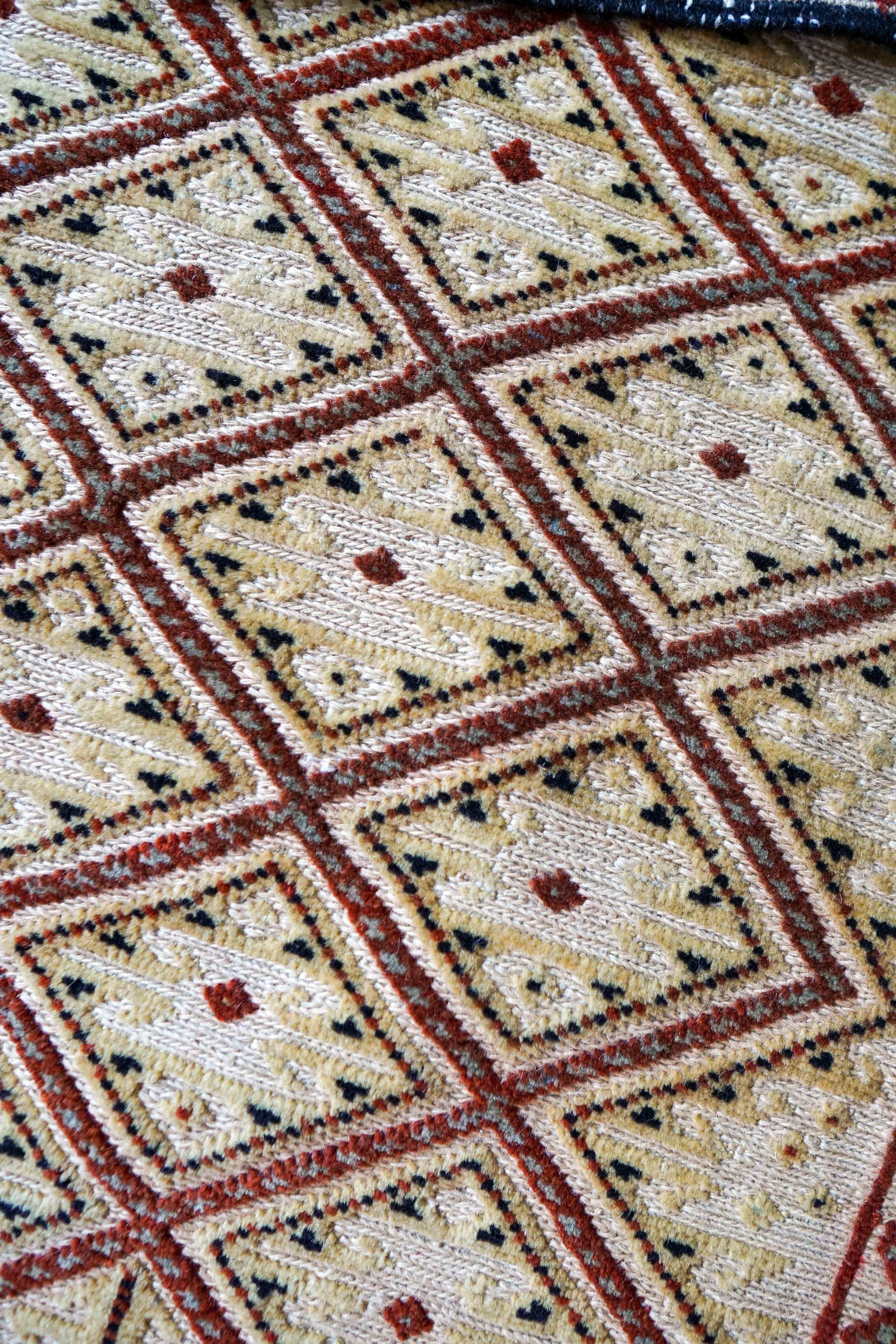 毛足のない麻のような肌触りのキリムと、パイル地の絨毯部分を合わせもった凸凹のある絨毯で、幾何学的なデザインが美しく、踏み心地も大変良いです。