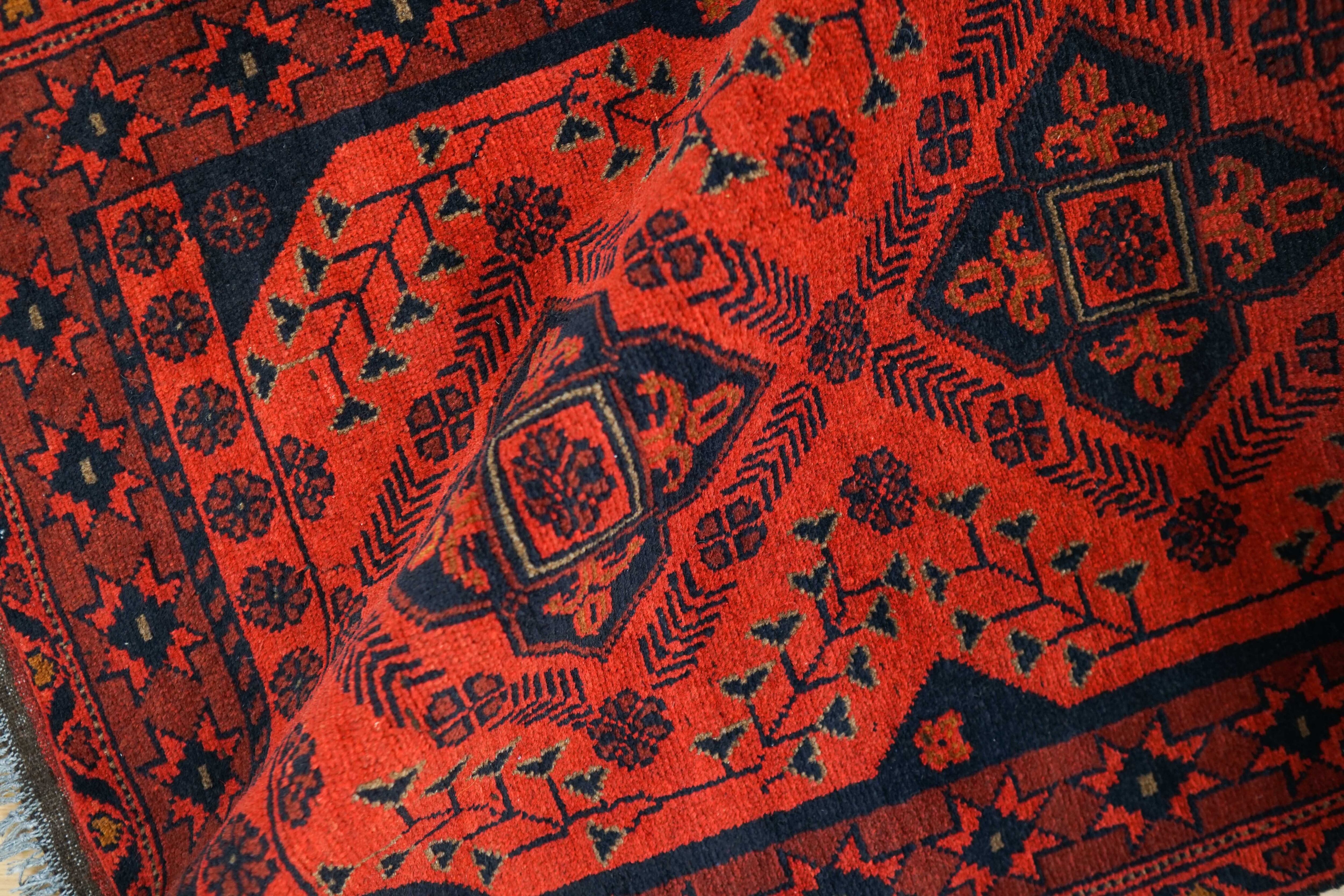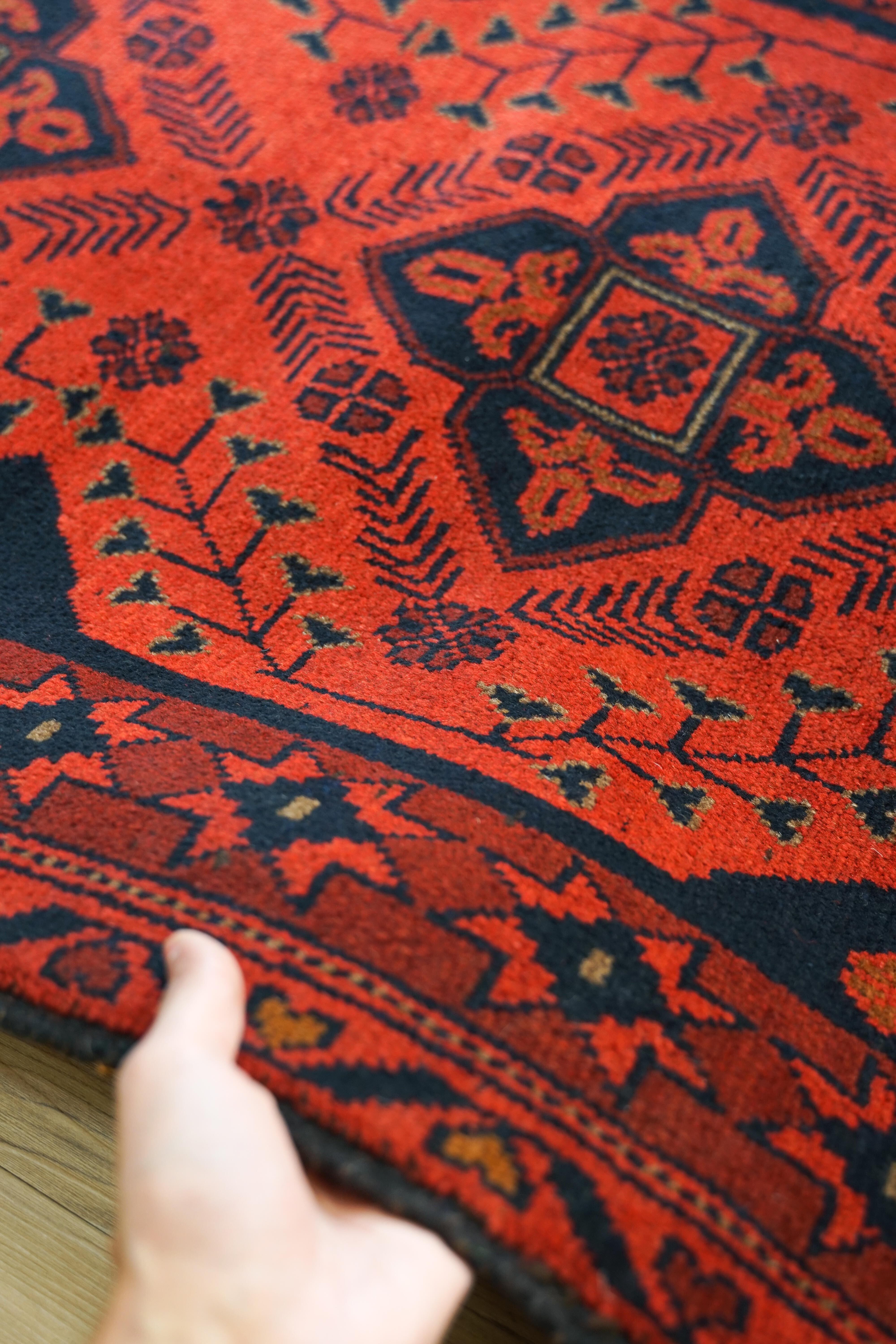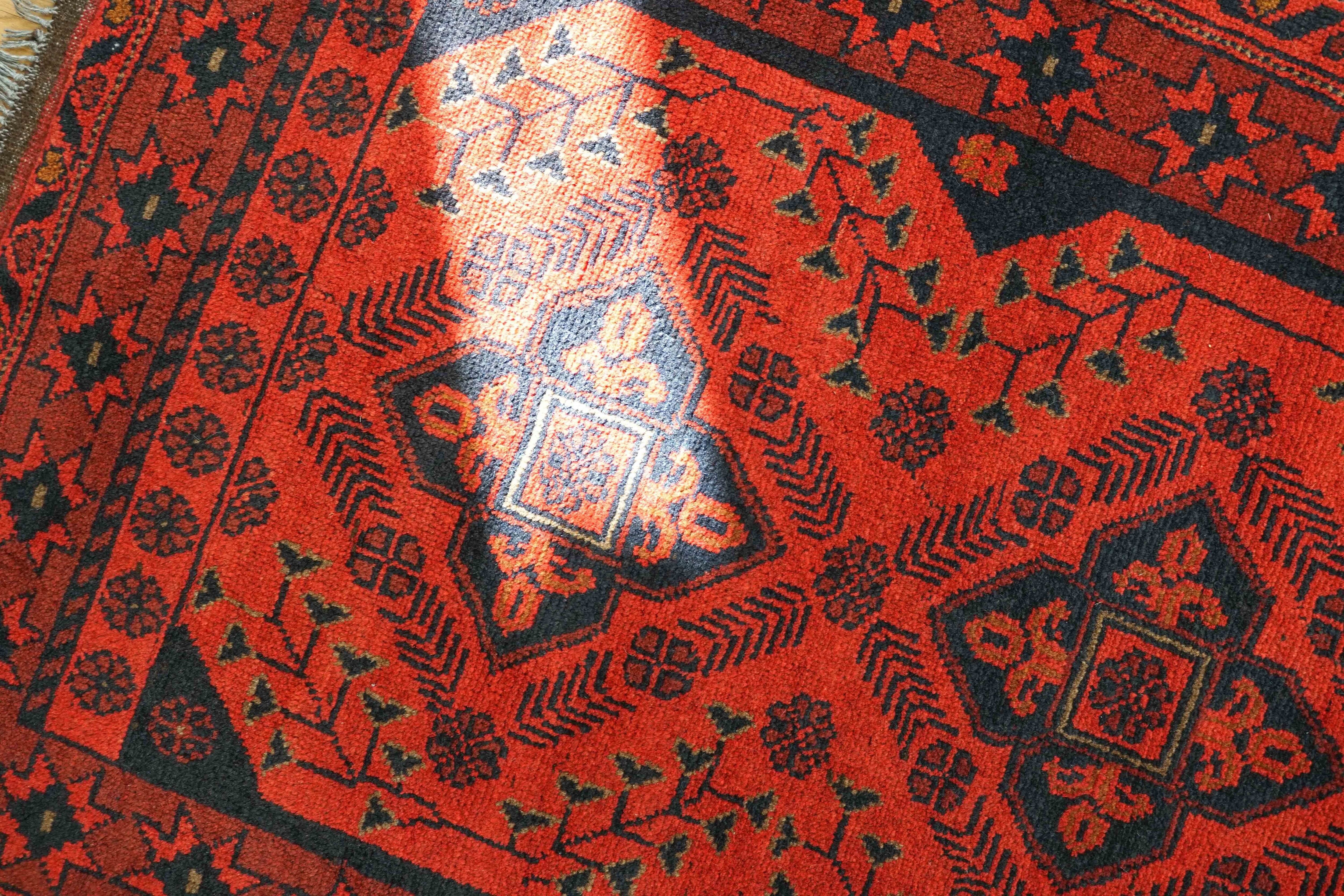 アフガン絨毯の中でも人気の高い『Khal Mohammadi(カールモハメディ)』は、耐久性に優れ、アフガニスタン産の中では最良品質といわれています。深みのある赤色とブラックの落ち着いた色合いが特徴で、シンプルな色数にすることで高級感が高まり洗練された雰囲気を宿します。あえて艶を抑えることで色の深みをより楽しめる仕上がり。