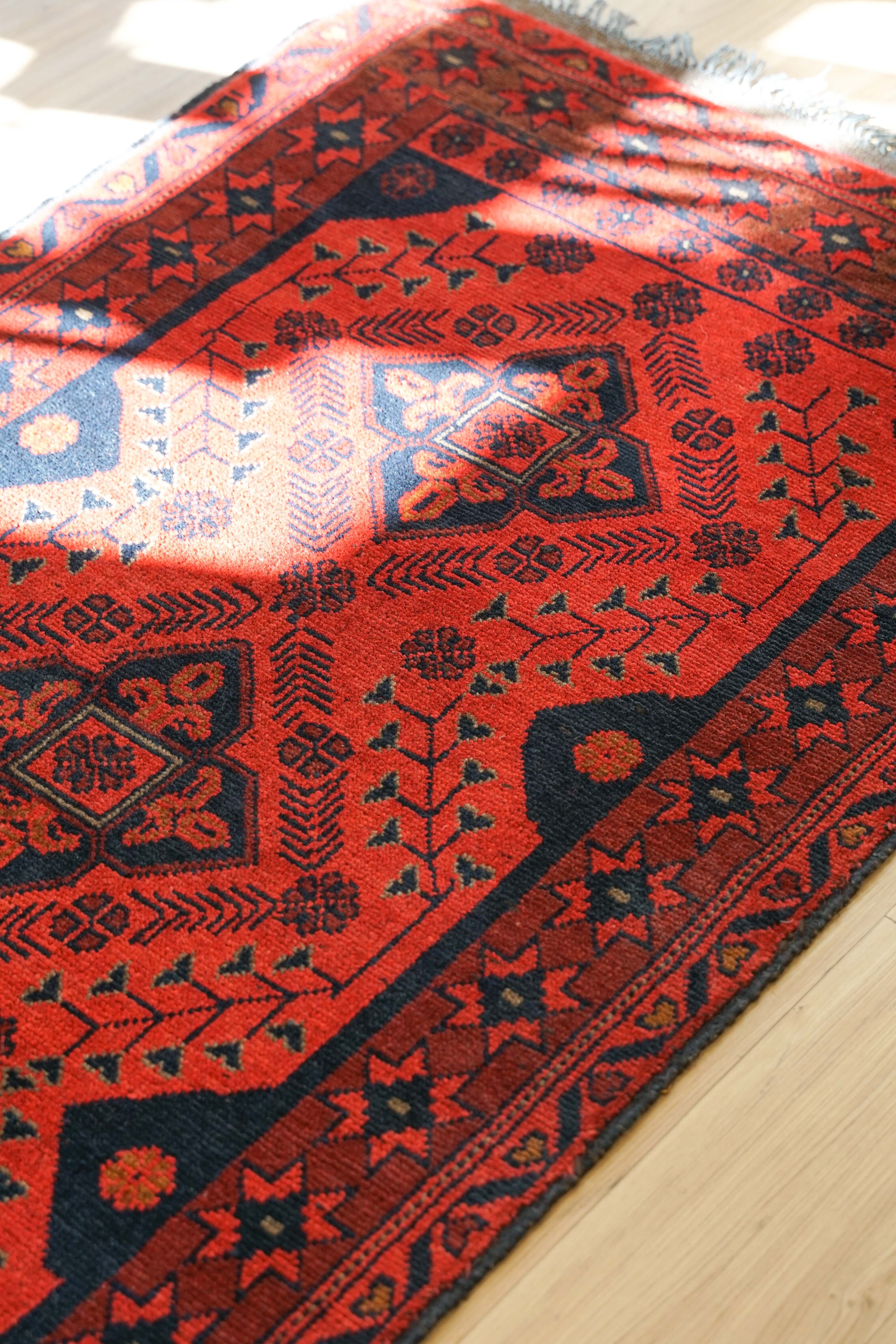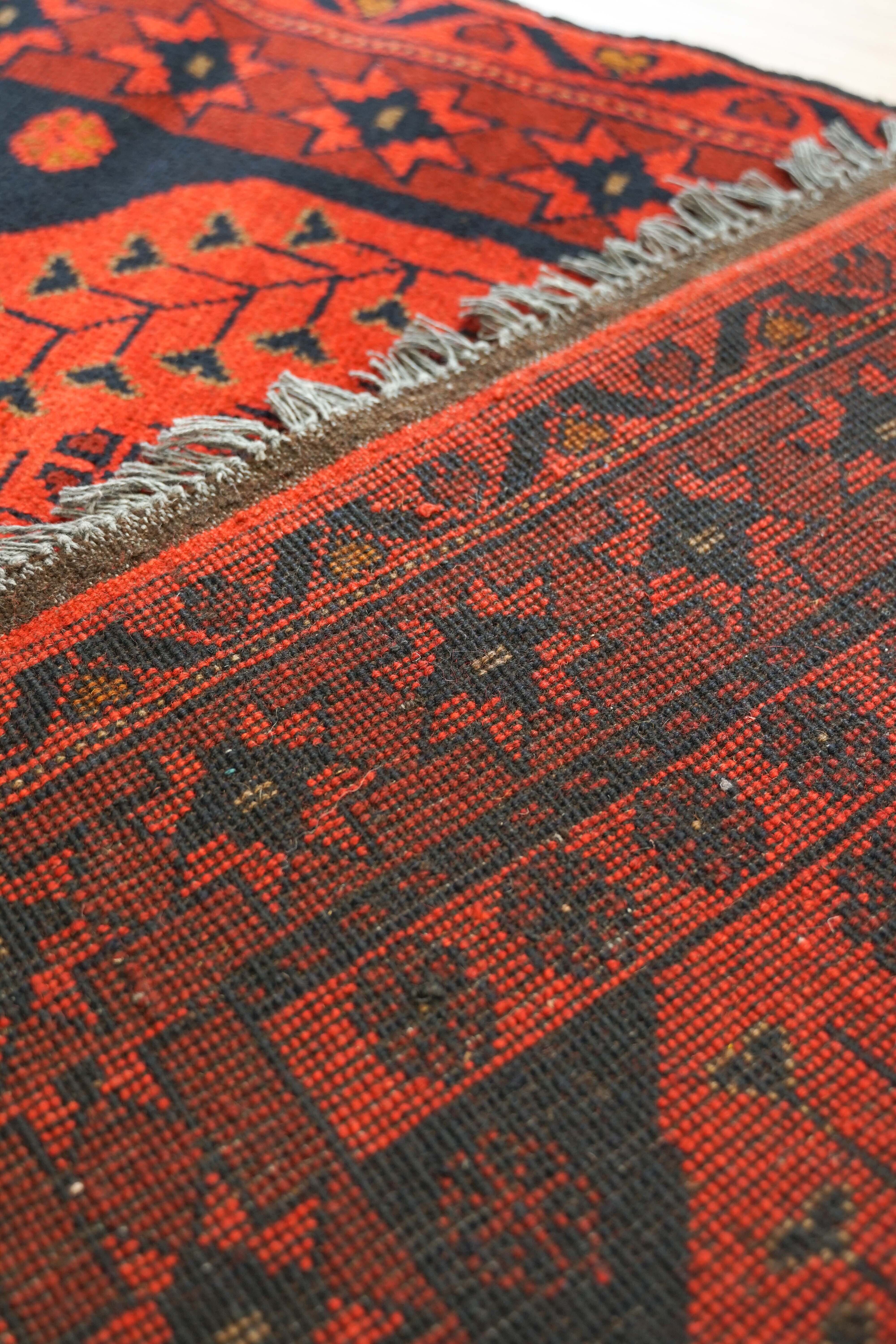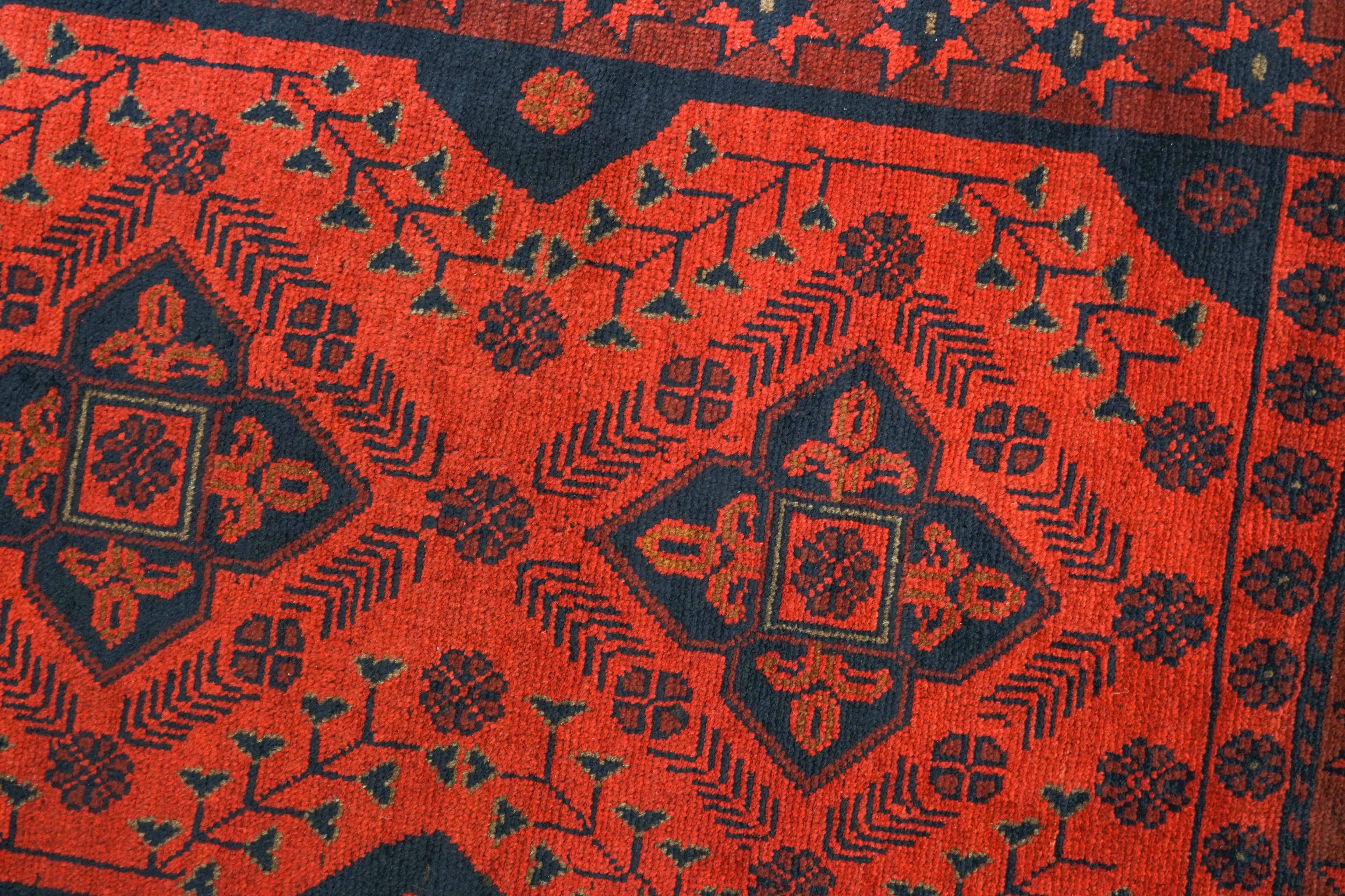 アフガン絨毯の中でも人気の高い『Khal Mohammadi(カールモハメディ)』は、耐久性に優れ、アフガニスタン産の中では最良品質といわれています。深みのある赤色とブラックの落ち着いた色合いが特徴で、シンプルな色数にすることで高級感が高まり洗練された雰囲気を宿します。あえて艶を抑えることで色の深みをより楽しめる仕上がり。