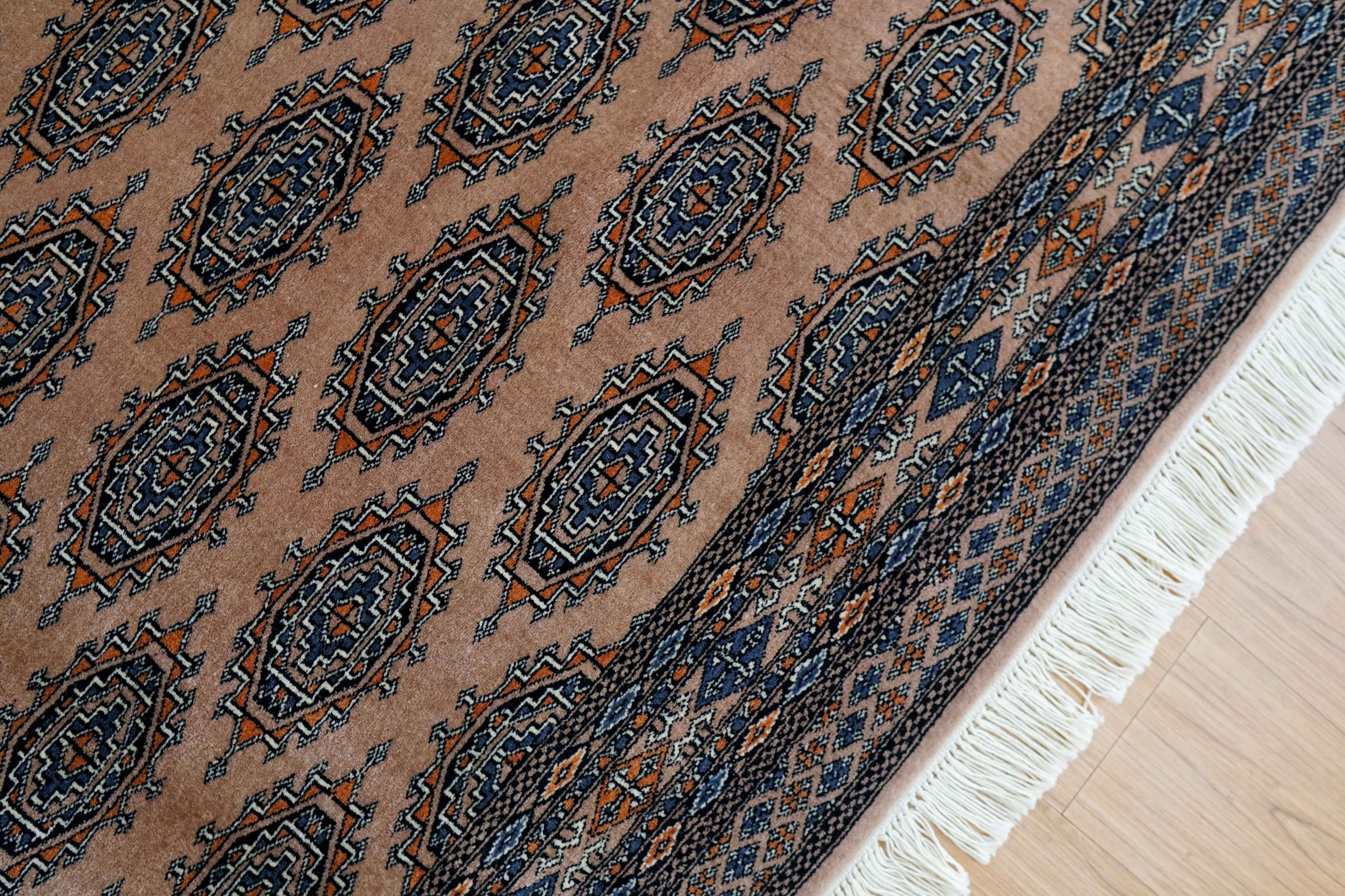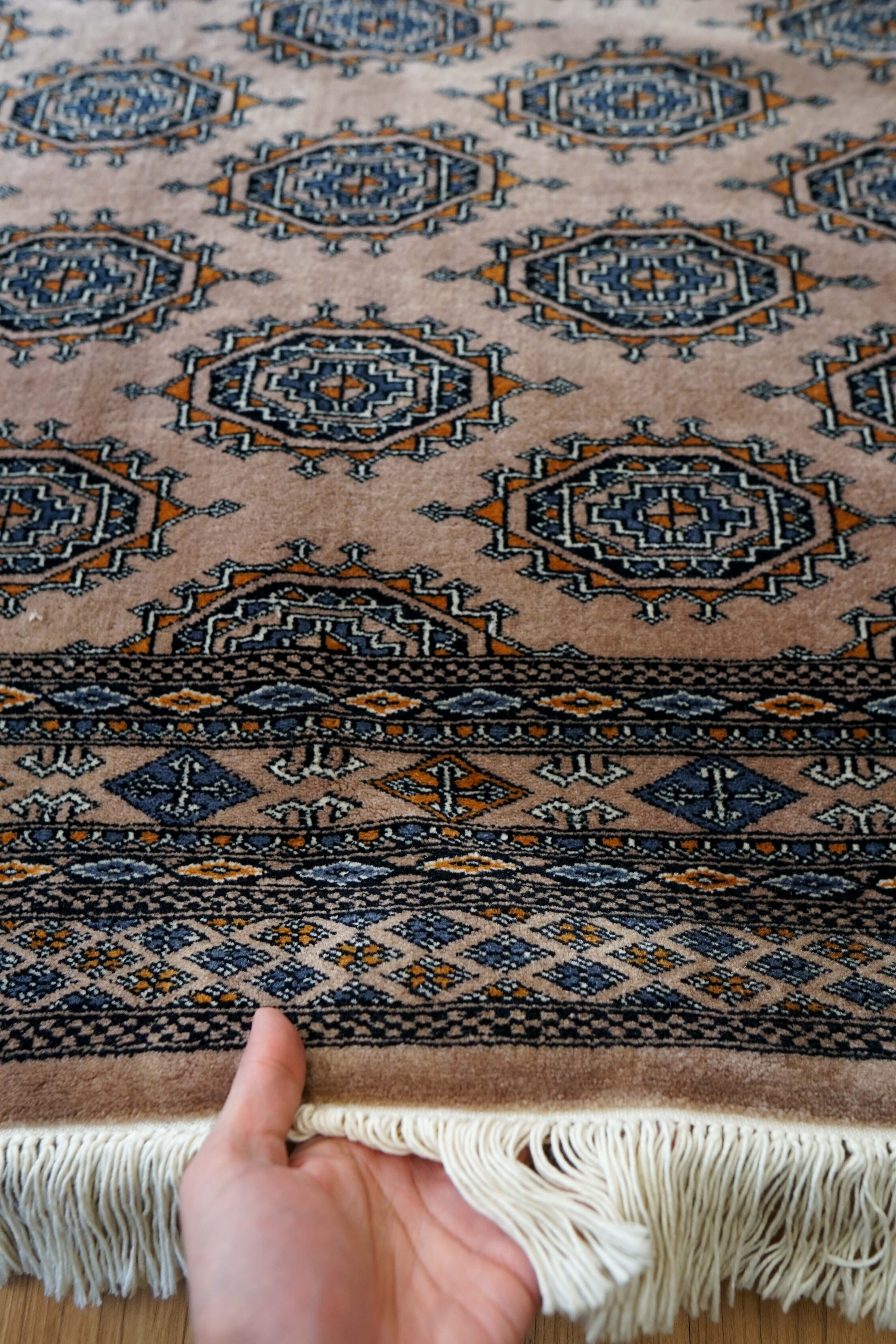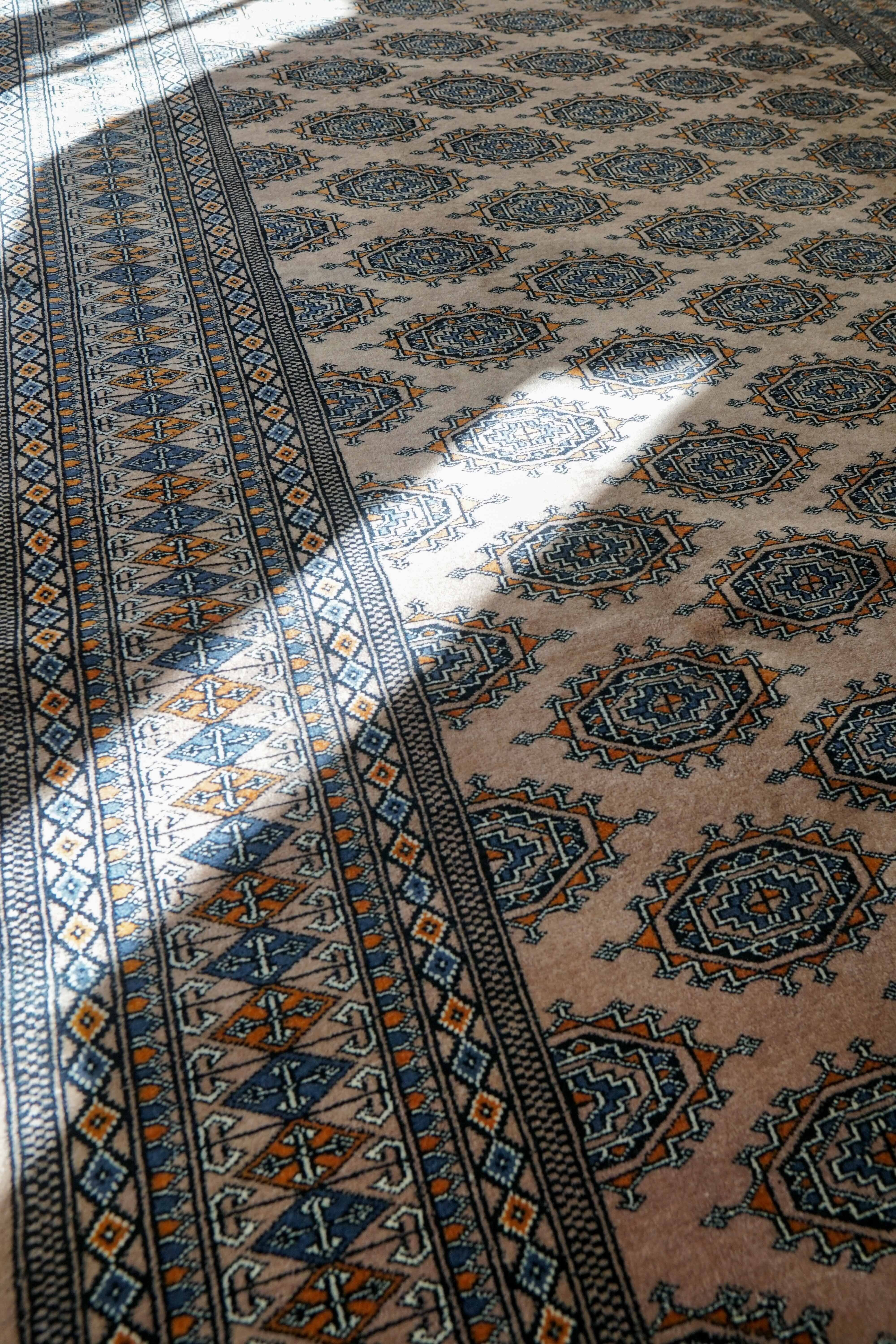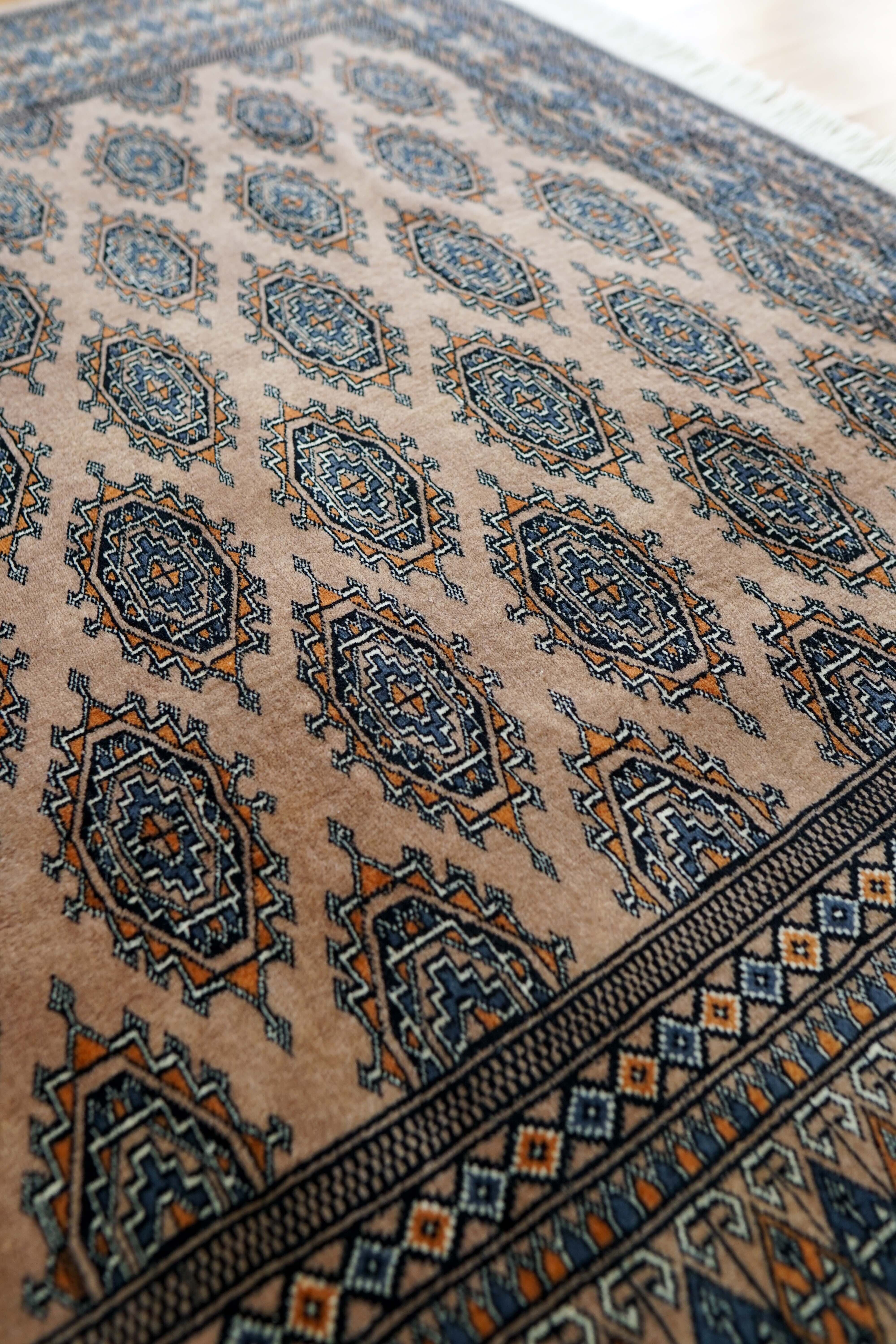 こちらはパキスタンで丁寧に手織りされた、大判サイズの手織り絨毯です。落ち着いたベージュ〜ブラウン系の地色に、規則正しく並ぶ伝統文様が全体に施され、上品で安定感のある佇まいが魅力です。存在感はありながらも主張しすぎず、リビングやダイニングなど広い空間にも自然に溶け込みます。