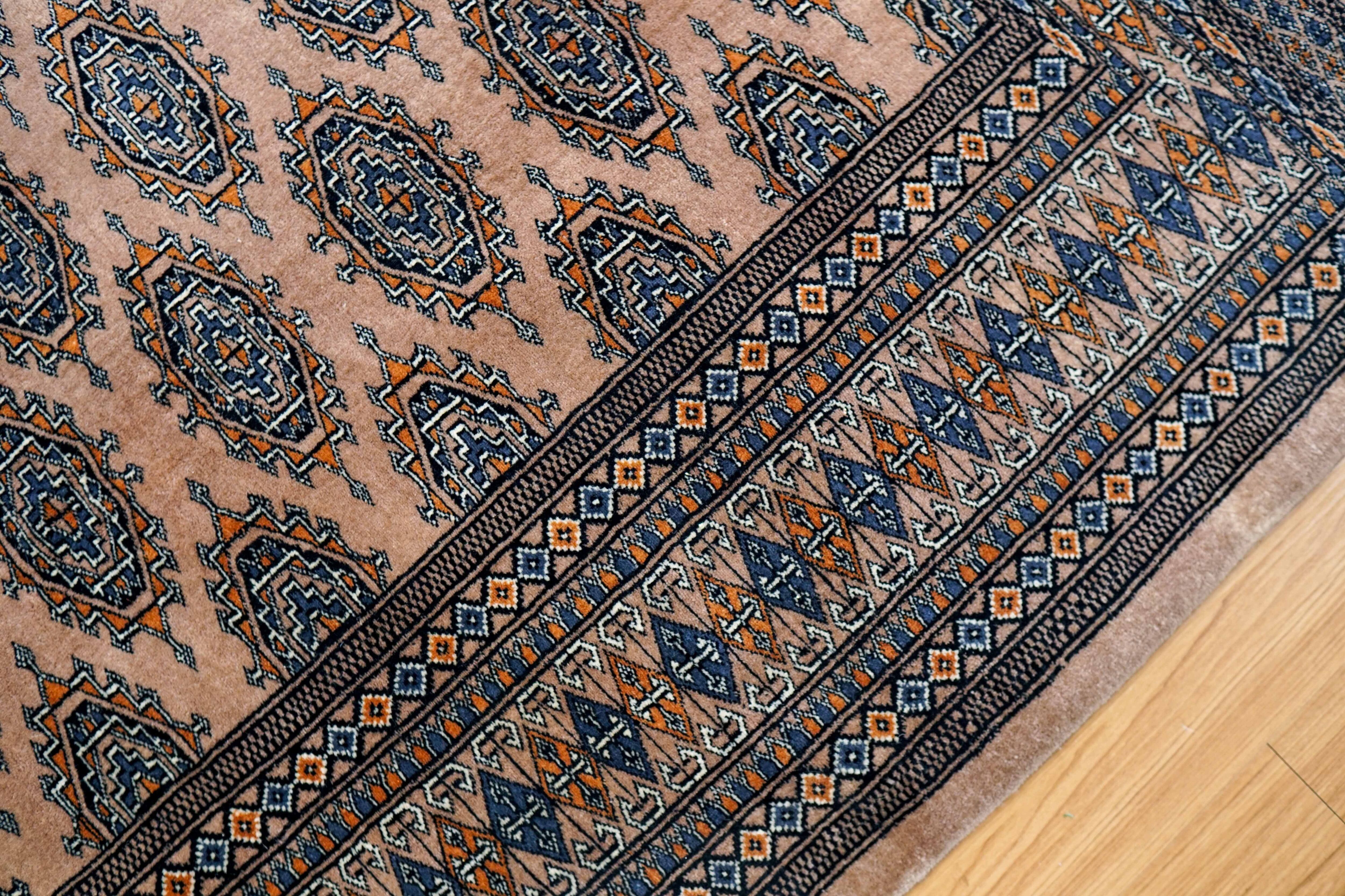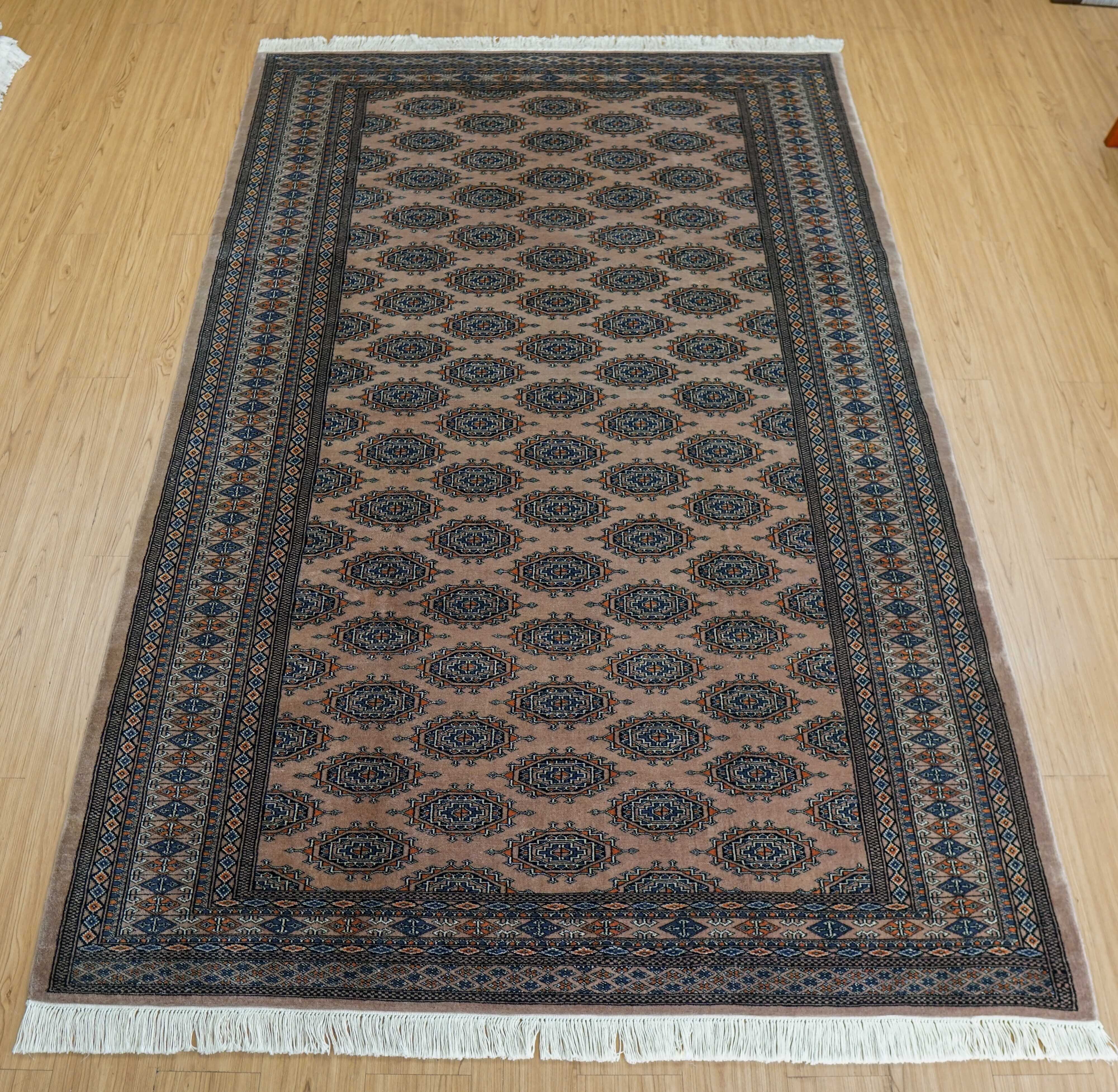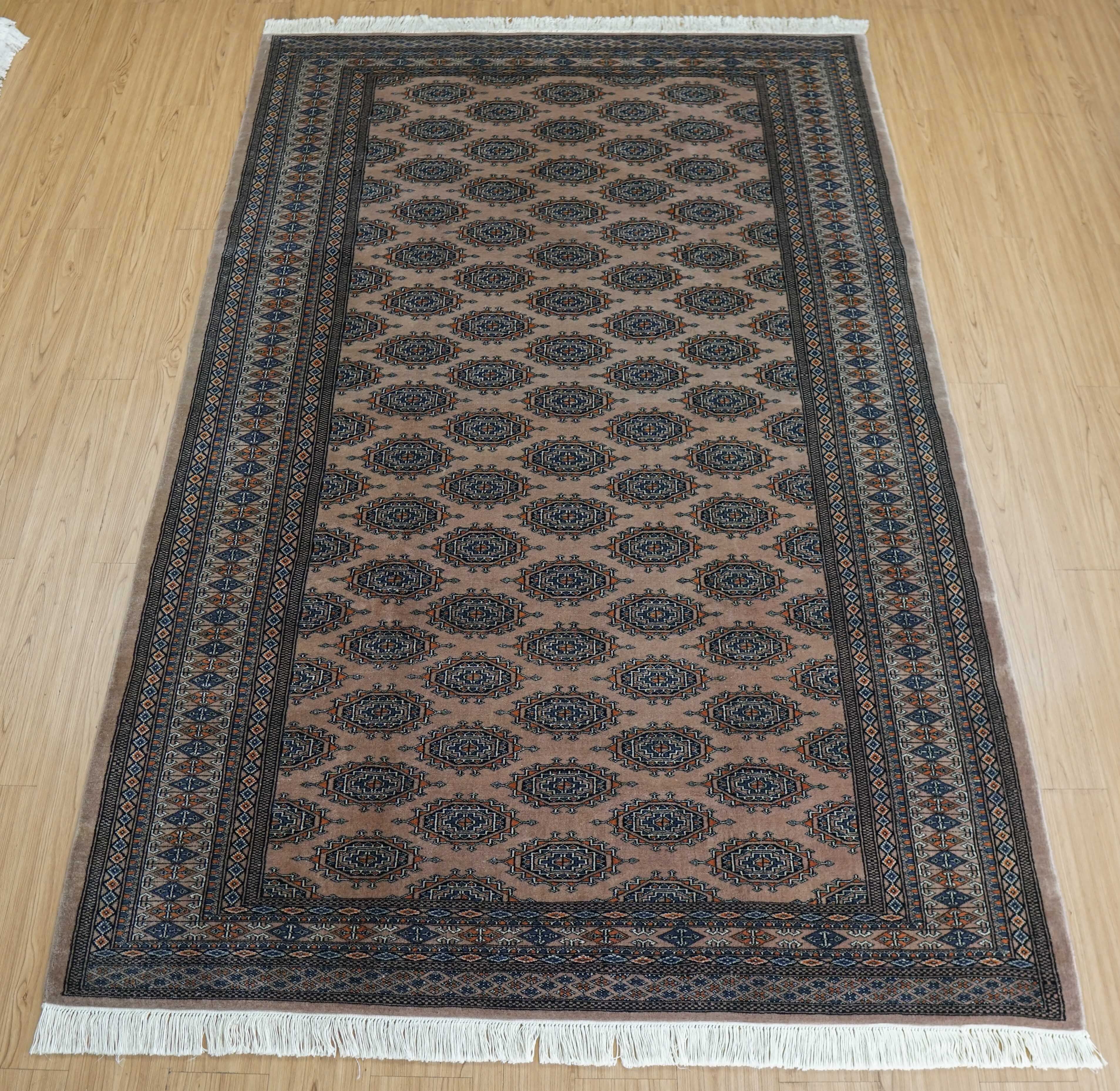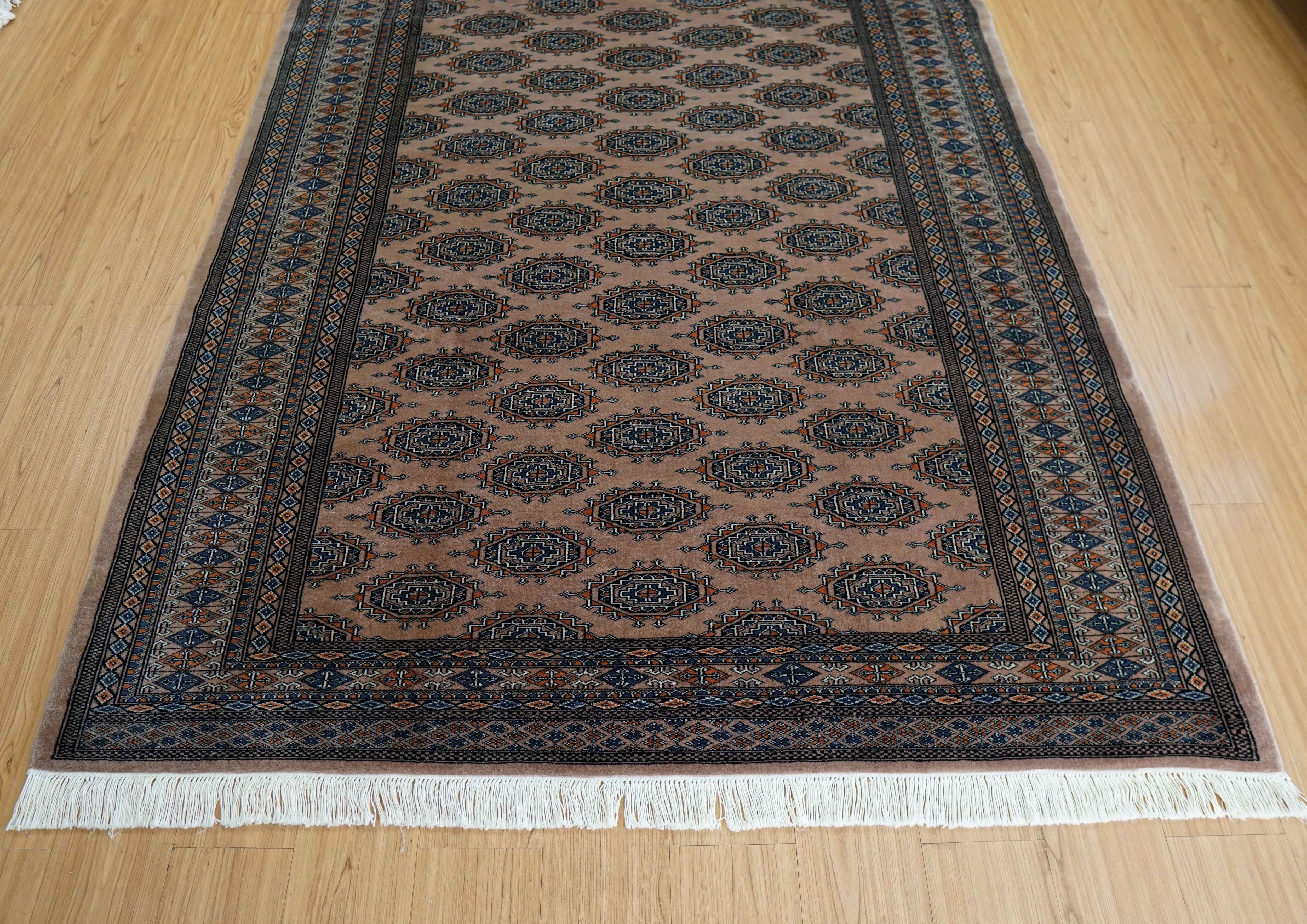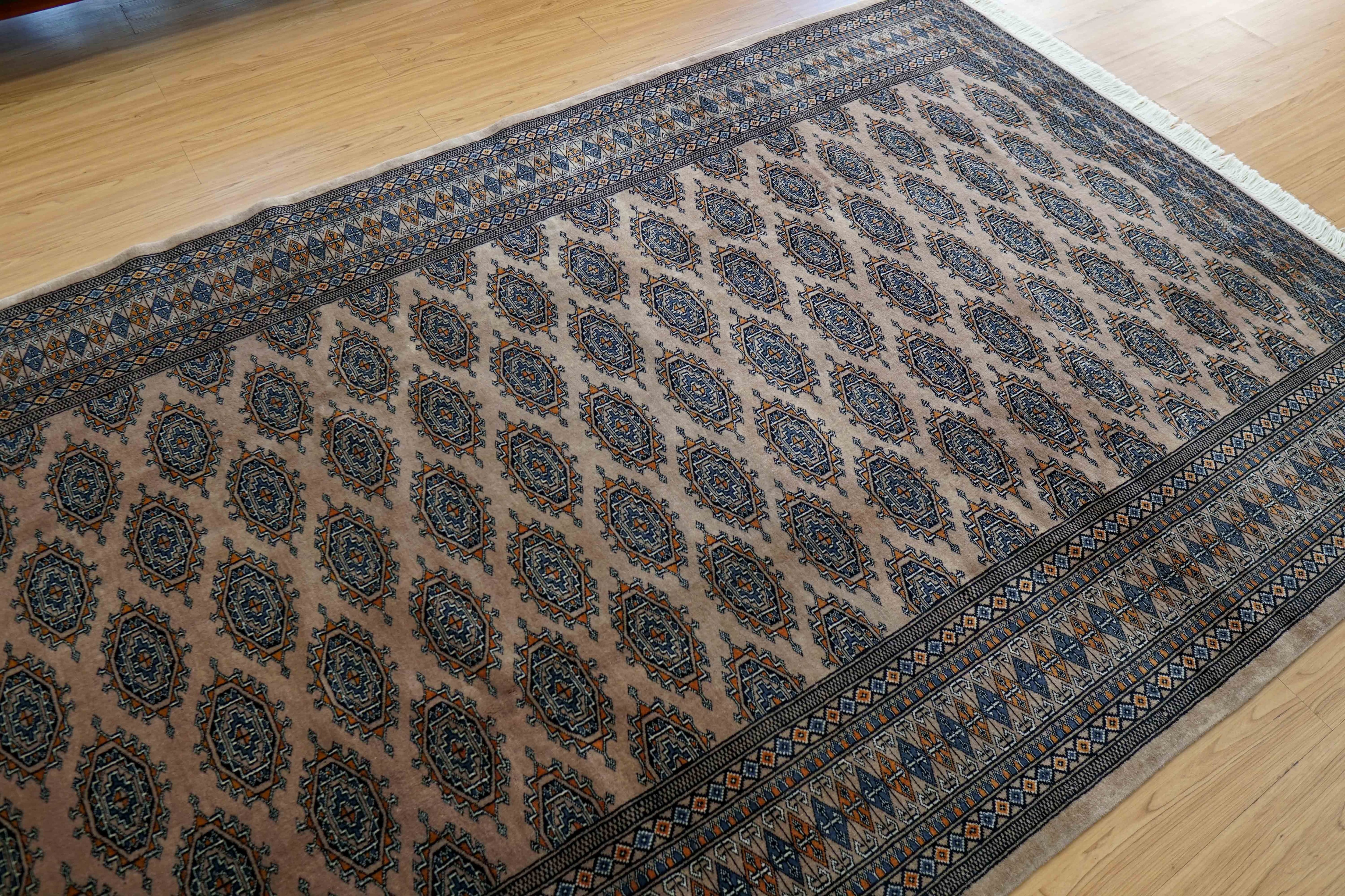 こちらはパキスタンで丁寧に手織りされた、大判サイズの手織り絨毯です。落ち着いたベージュ〜ブラウン系の地色に、規則正しく並ぶ伝統文様が全体に施され、上品で安定感のある佇まいが魅力です。存在感はありながらも主張しすぎず、リビングやダイニングなど広い空間にも自然に溶け込みます。
