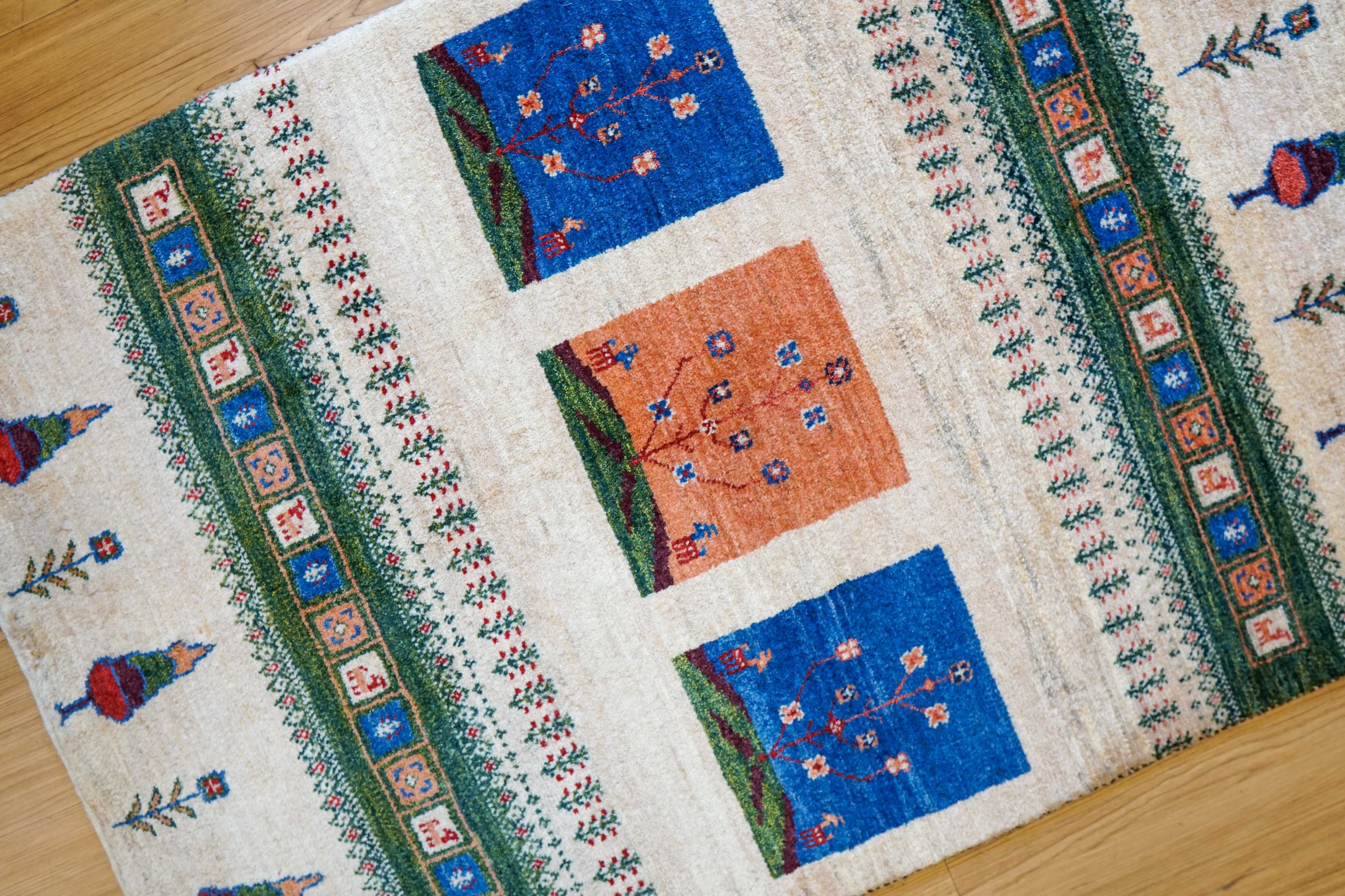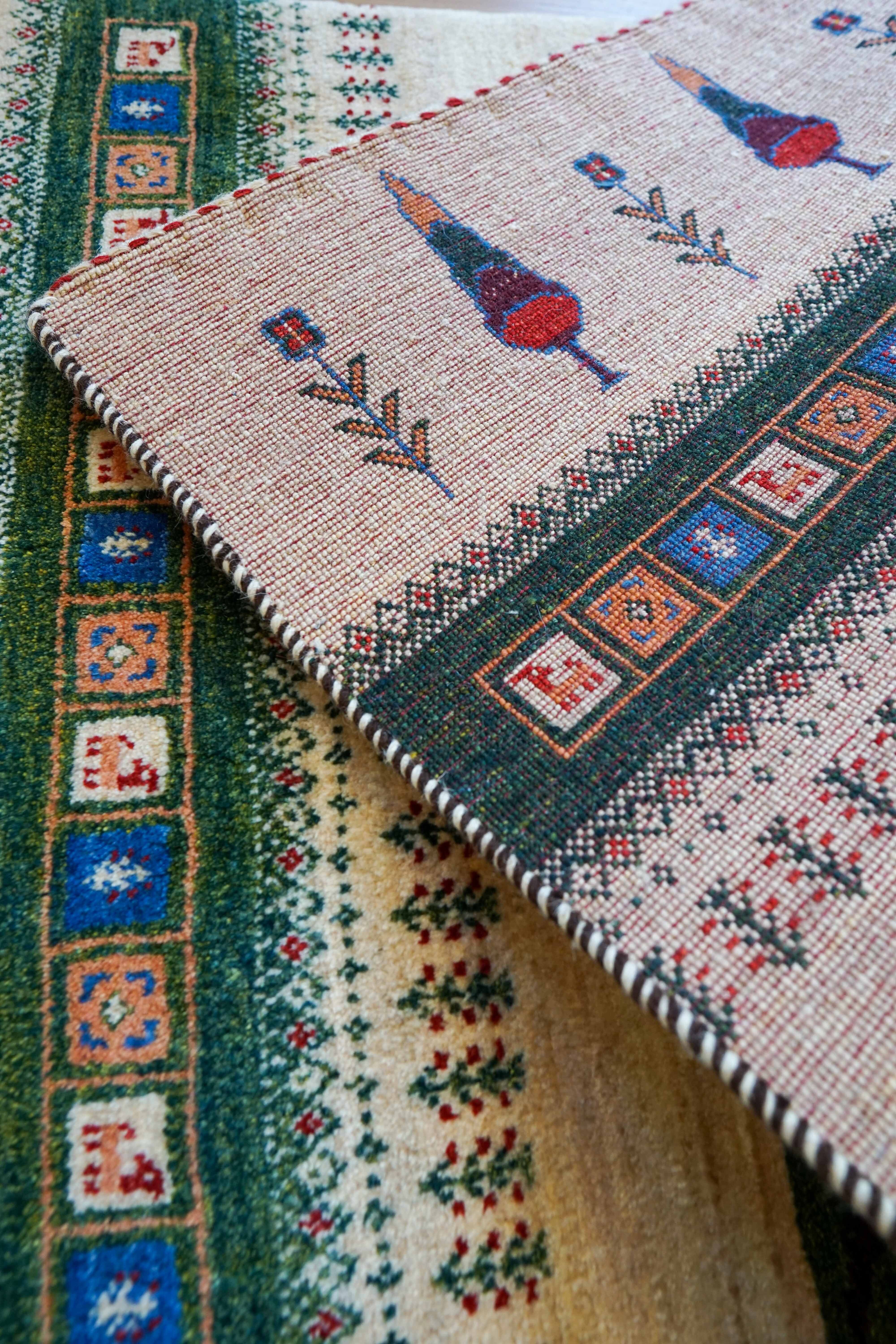 イラン シラーズ地方で遊牧民族によって手織りされたギャッベ。ギャッベの中でも織りが細かい『カシュクリ』と呼ばれるグレードの高いものです。結び目の密度が高いため織り上げるのに一般的なギャッベより時間を要しますが、柄は鮮明になり踏み心地も抜群です。
