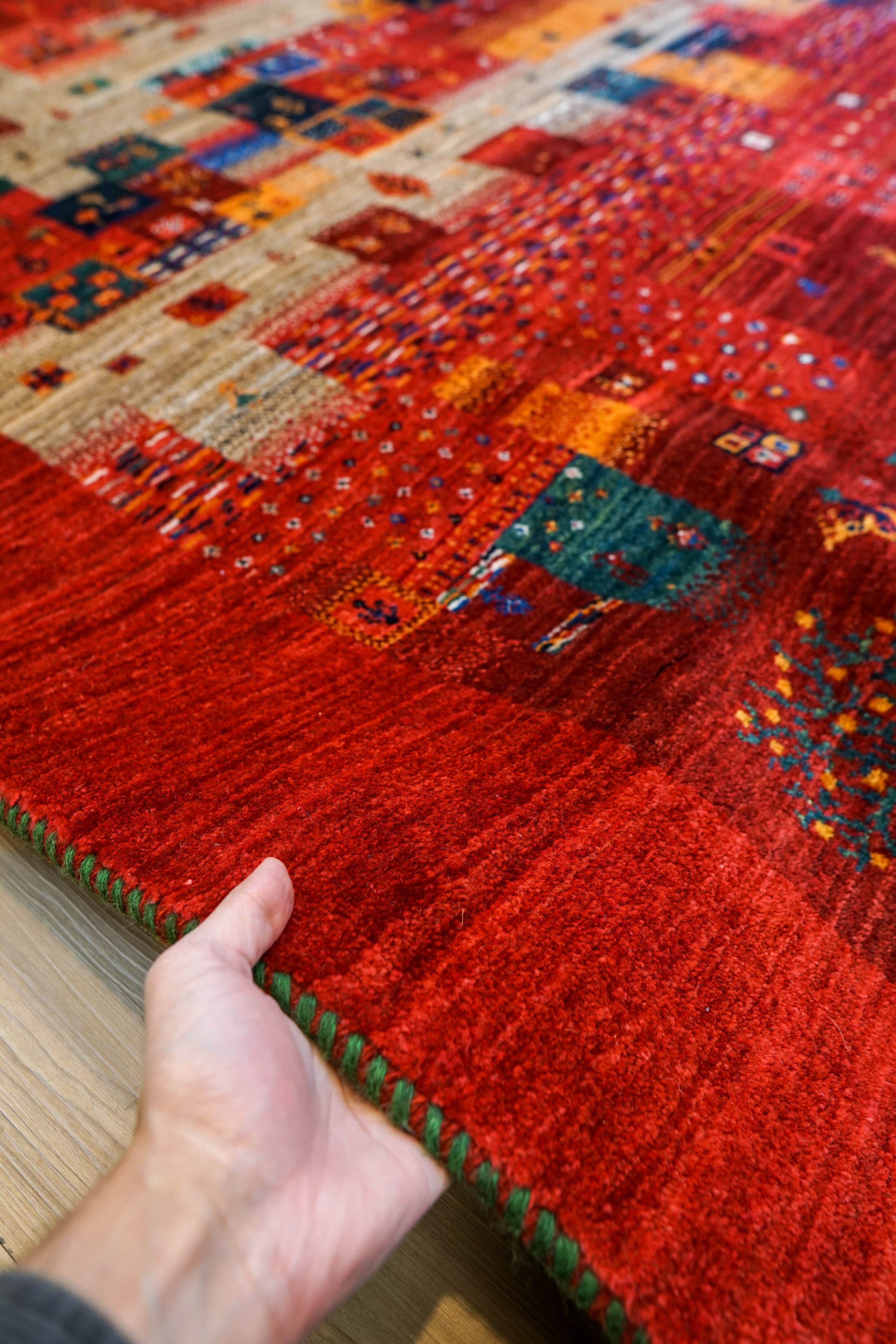イラン シラーズ地方で遊牧民族によって手織りされたギャッベ。ギャッベの中でも織りが細かい『カシュクリ』と呼ばれるグレードの高いものです。結び目の密度が高いため織り上げるのに一般的なギャッベより時間を要しますが、柄は鮮明になり踏み心地も抜群です。
