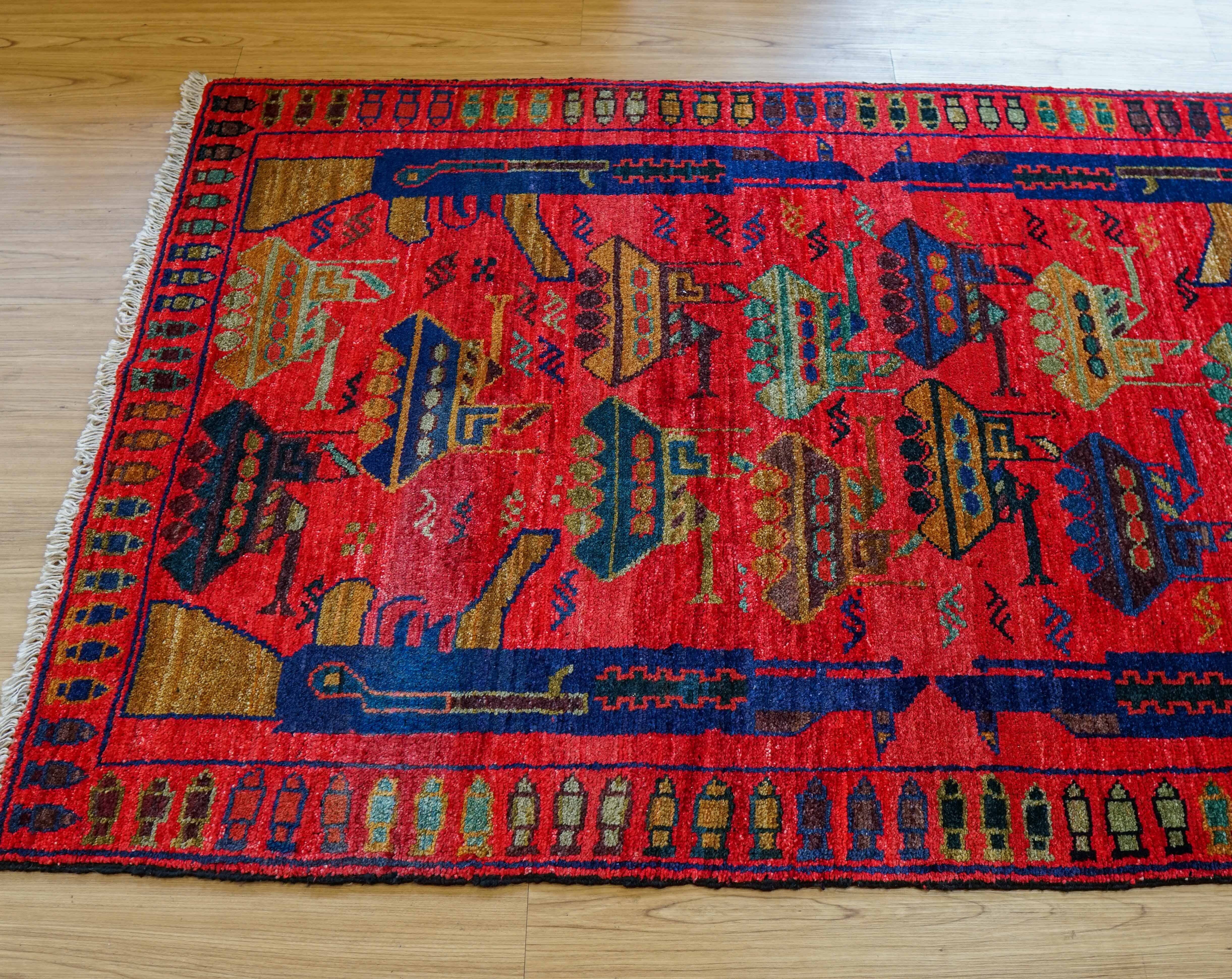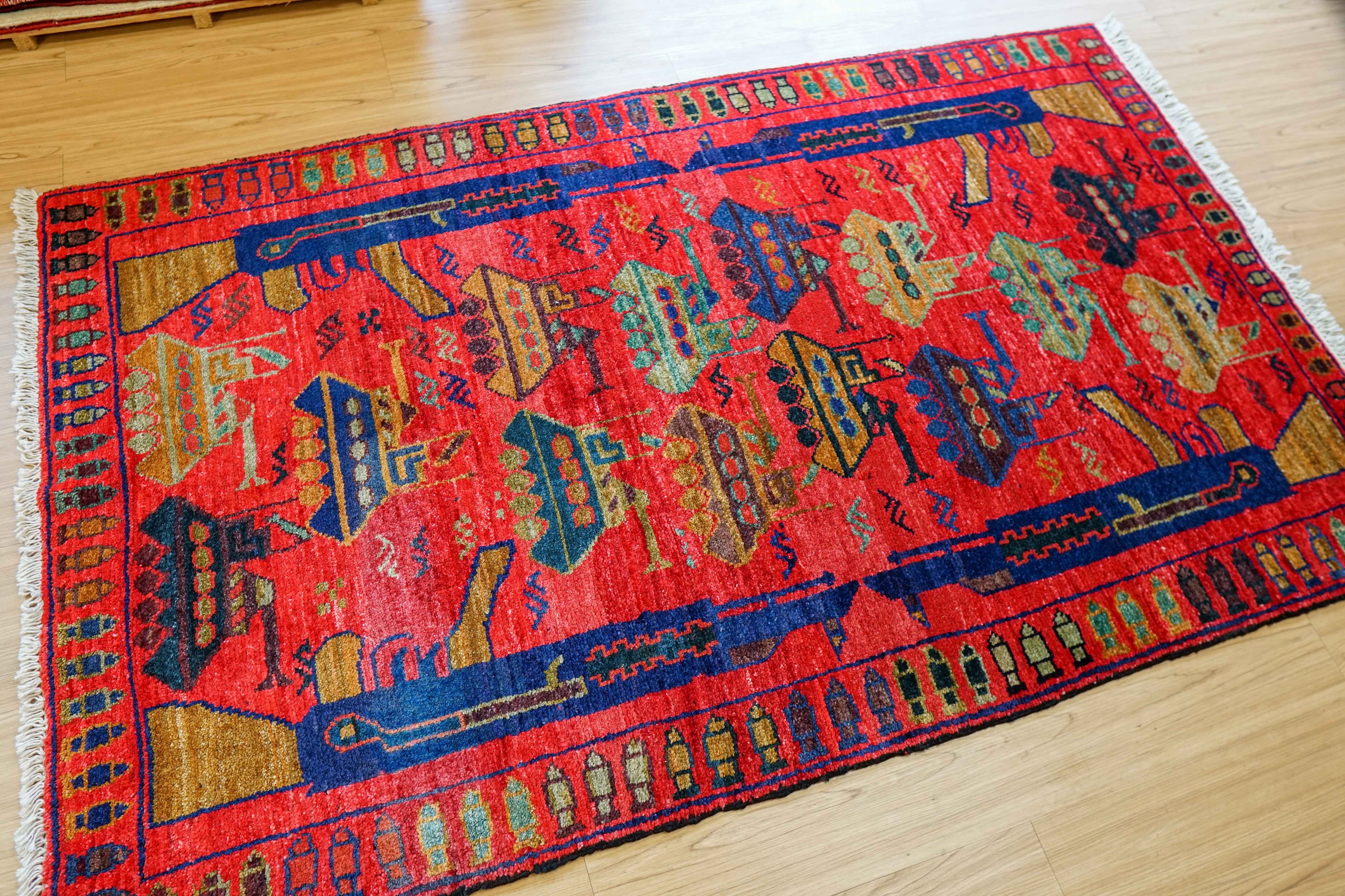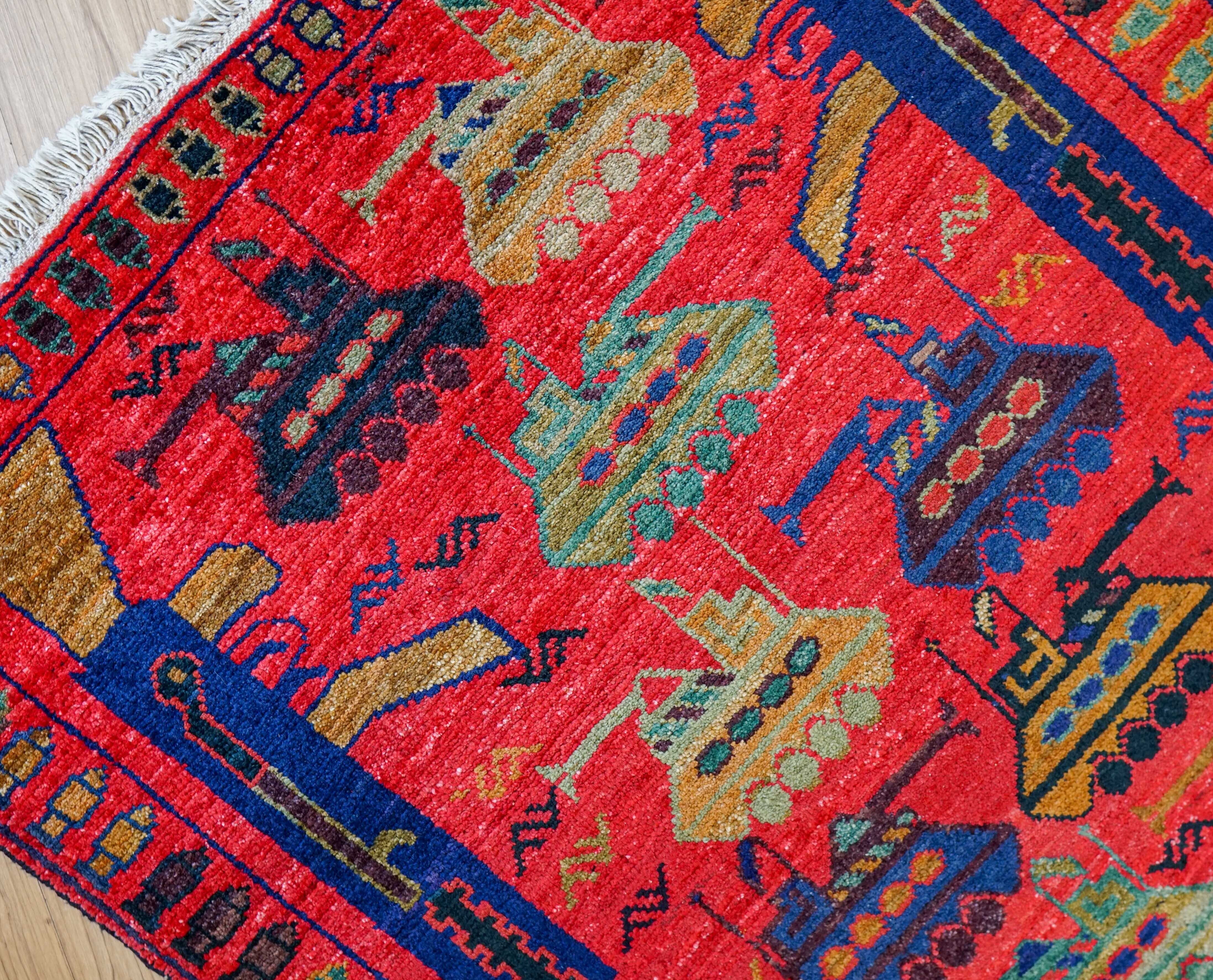 ソ連のアフガニスタン侵攻をきっかけに誕生した『ウォーラグ』と呼ばれる戦争をモチーフにしたデザインの手織り絨毯です。10年に及ぶアフガニスタンへのソ連の軍事介入が終わった直後の難民キャンプから生まれたといわれています。