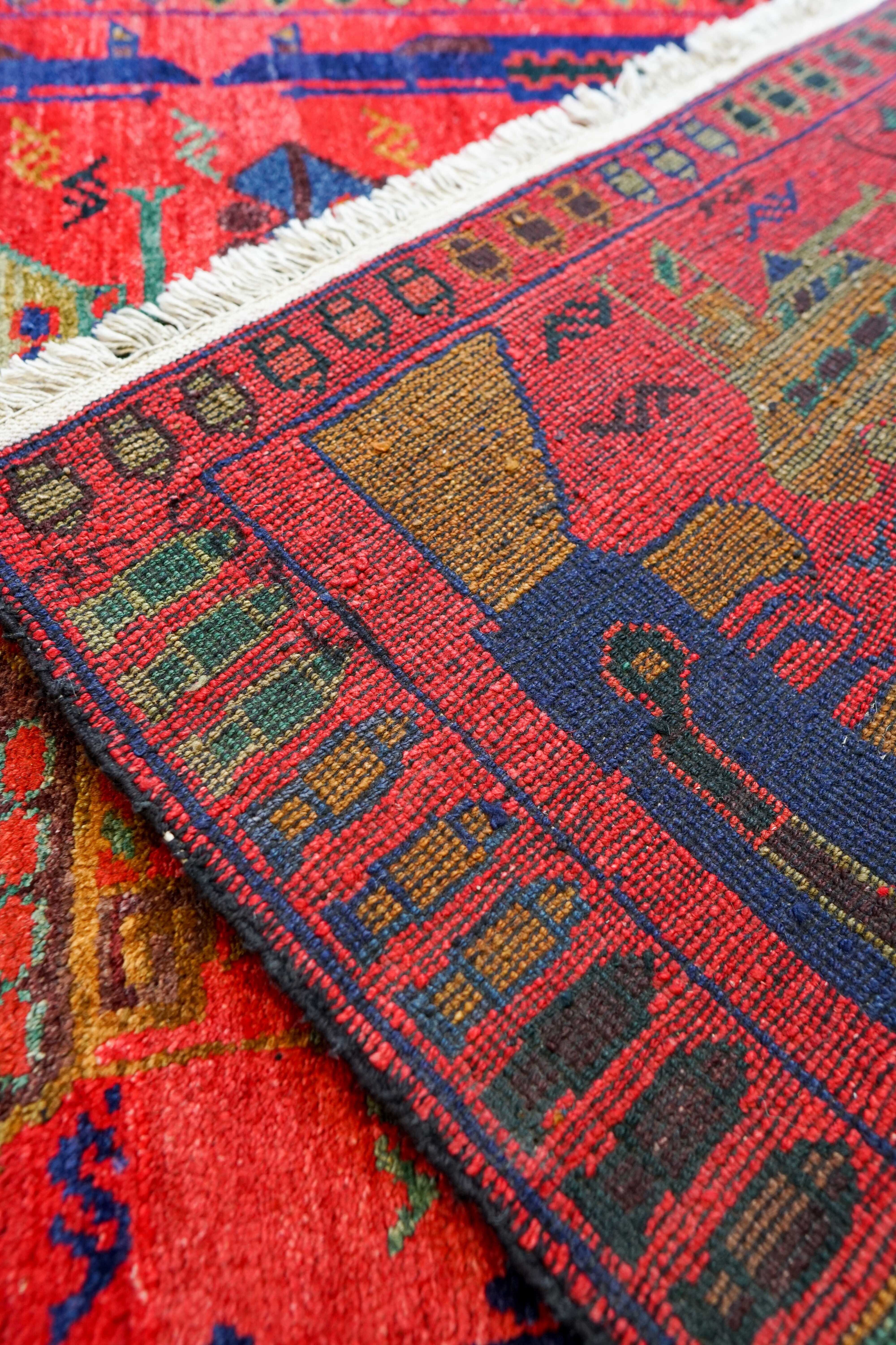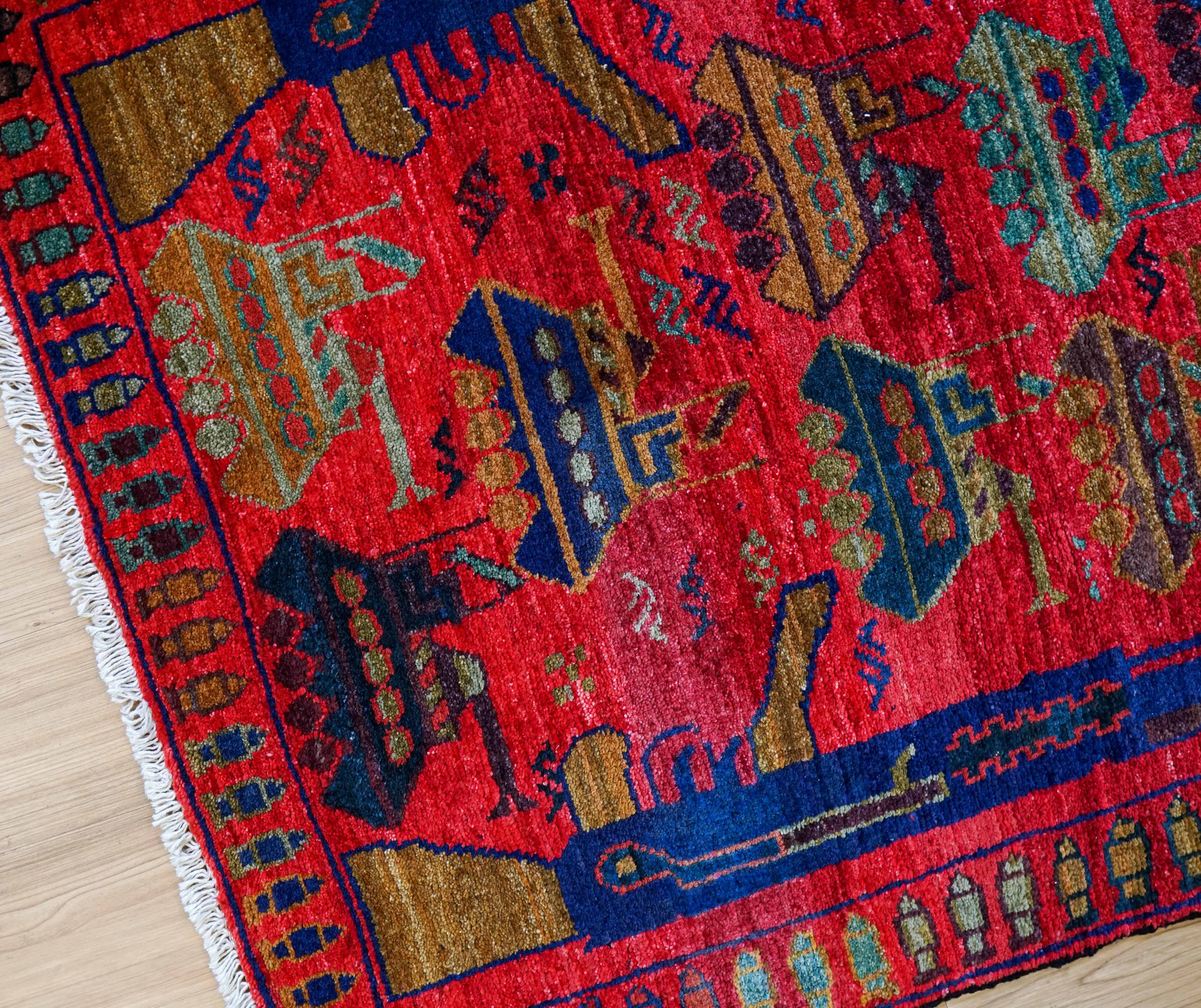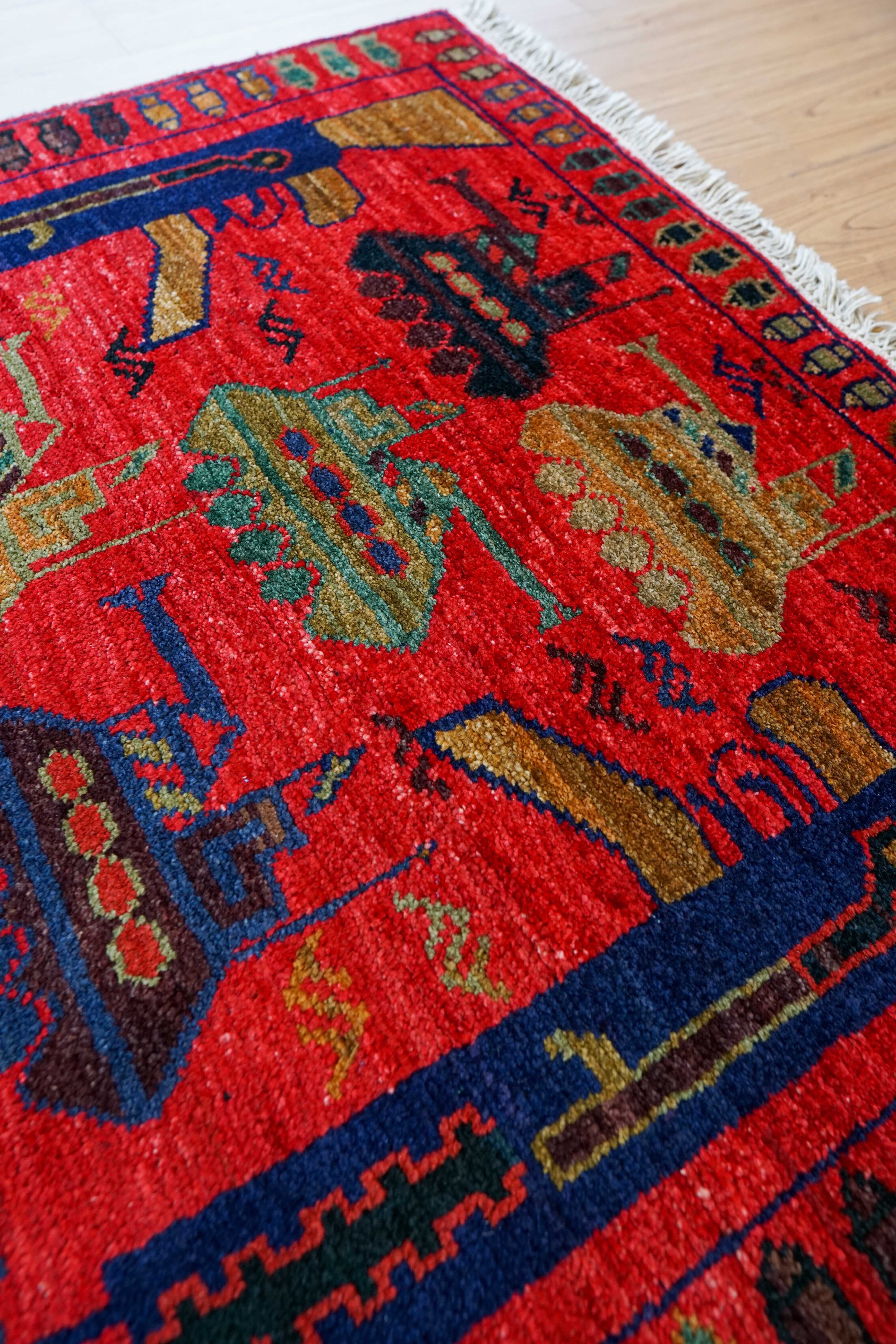 ソ連のアフガニスタン侵攻をきっかけに誕生した『ウォーラグ』と呼ばれる戦争をモチーフにしたデザインの手織り絨毯です。10年に及ぶアフガニスタンへのソ連の軍事介入が終わった直後の難民キャンプから生まれたといわれています。