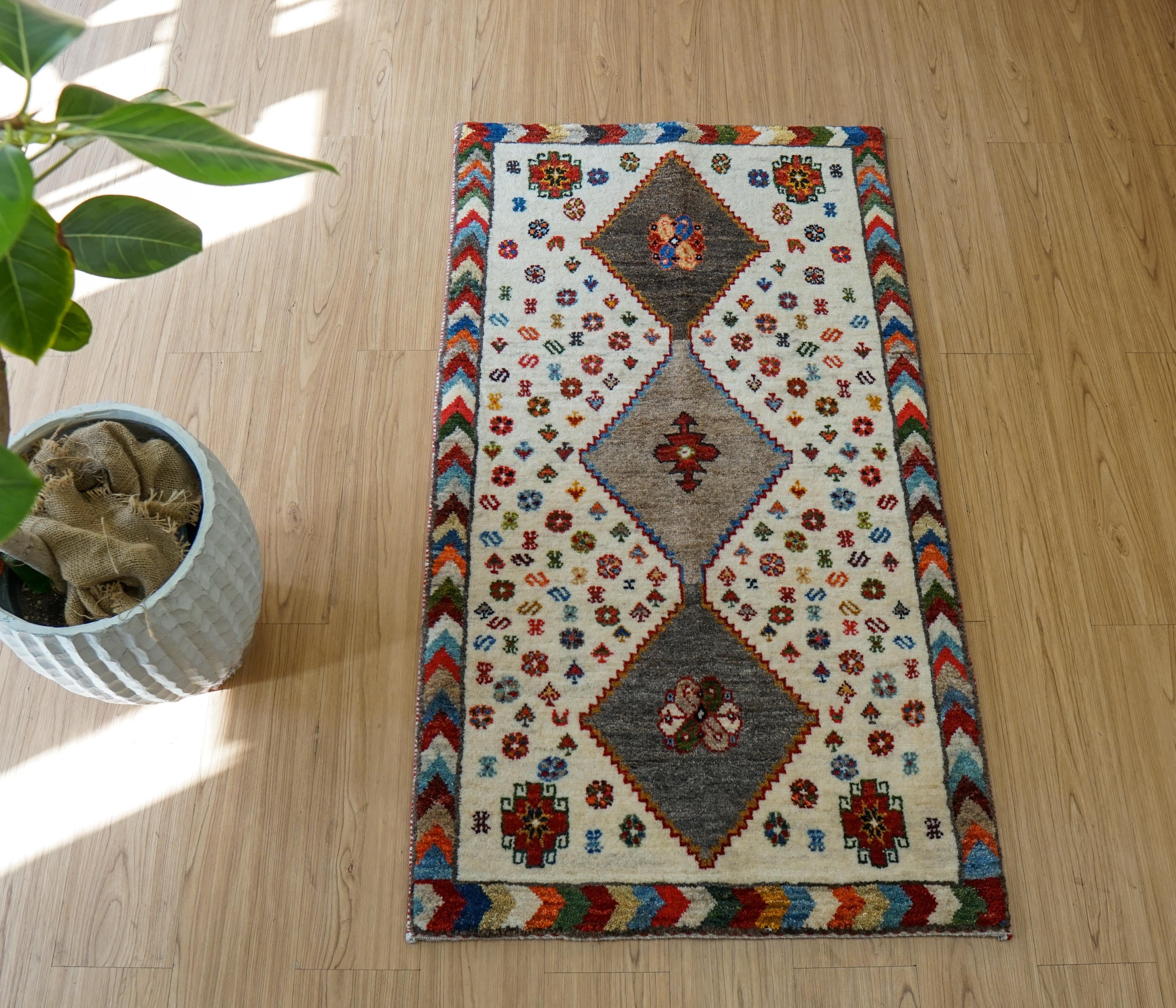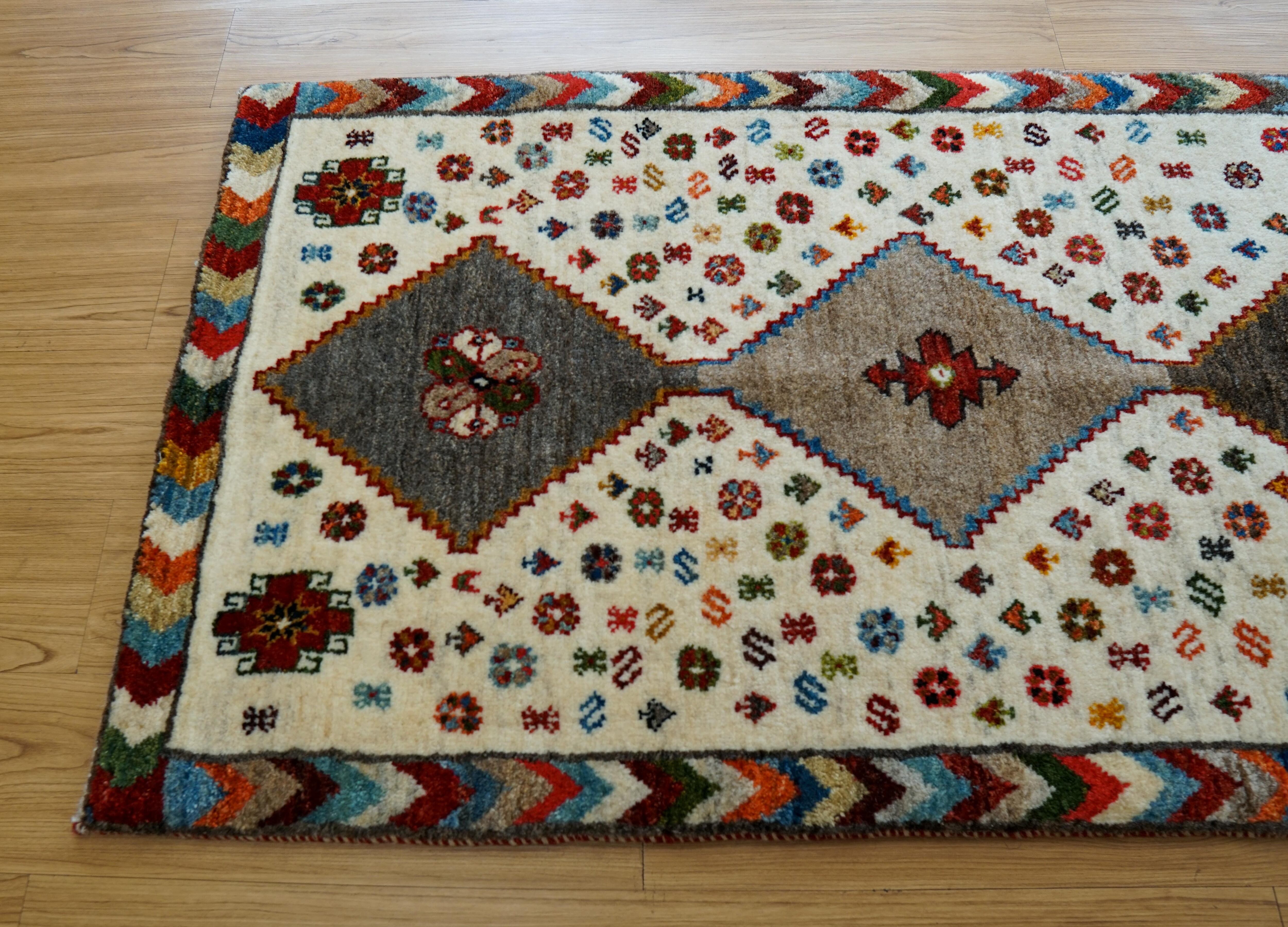 イラン シラーズ地方で遊牧民族によって手織りされたギャッベ。ギャッベの中でも織りが細かい『カシュクリ』と呼ばれるグレードの高いものです。結び目の密度が高いため織り上げるのに一般的なギャッベより時間を要しますが、柄は鮮明になり踏み心地も抜群です。