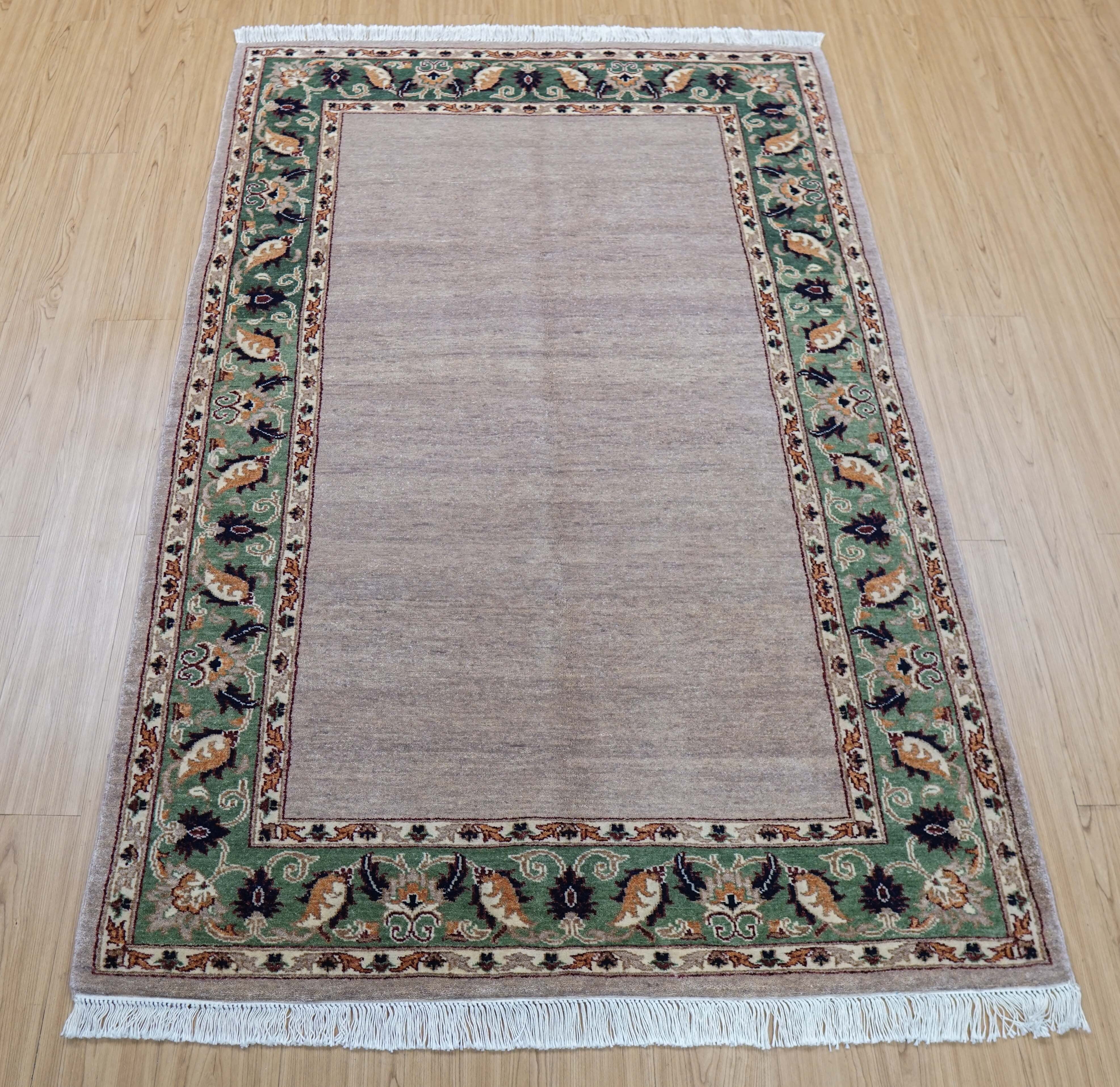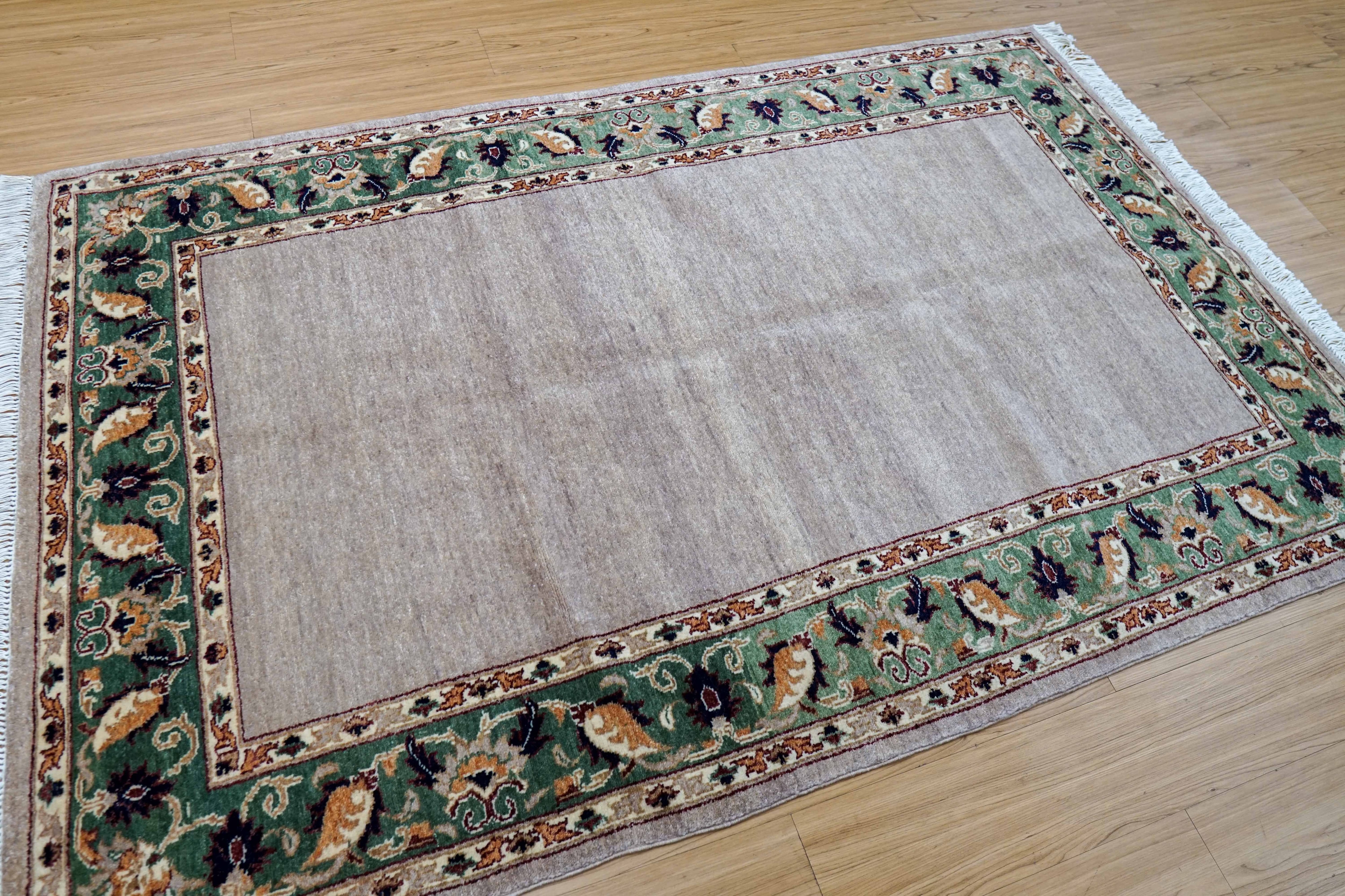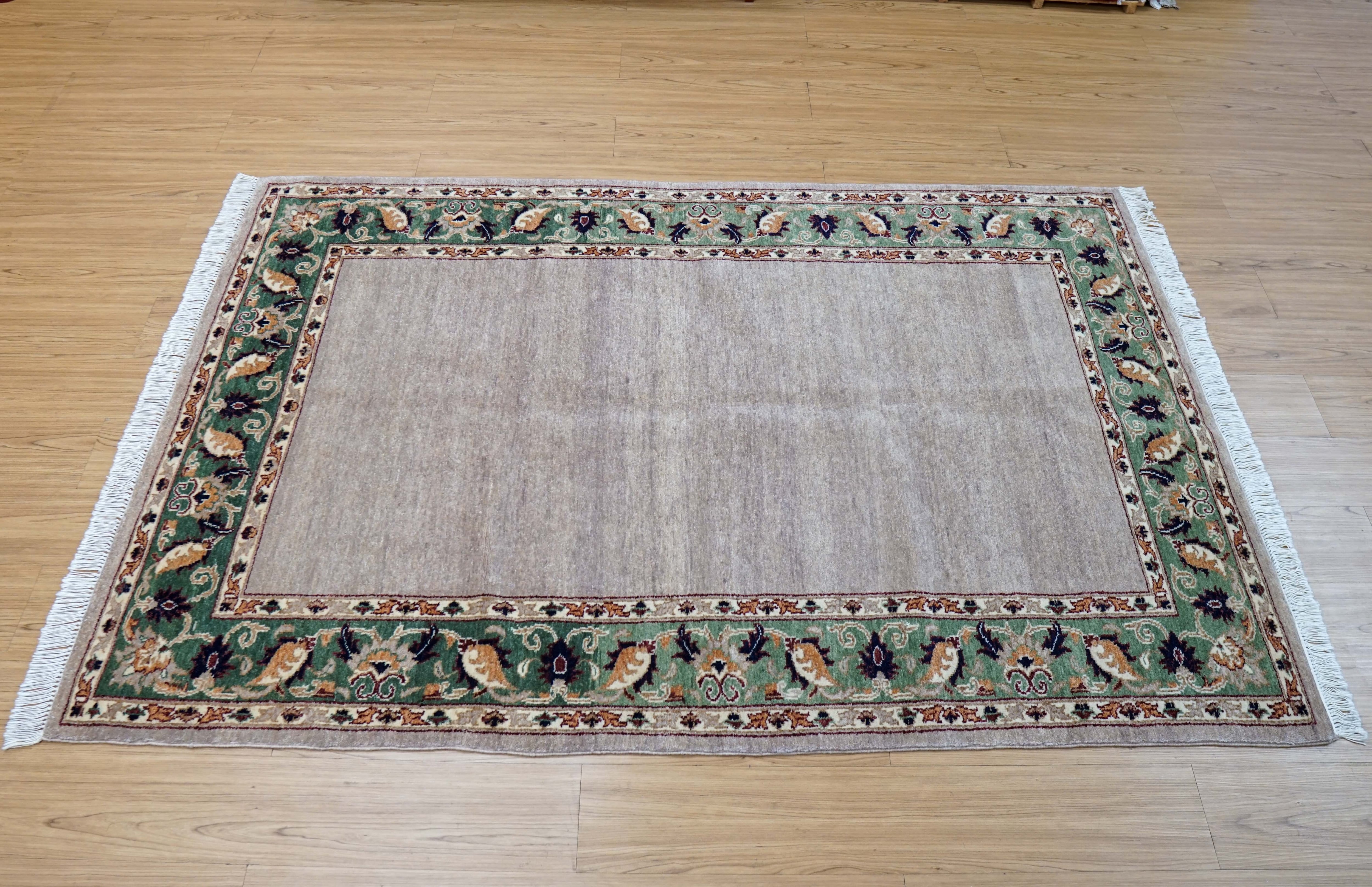 羊毛はすべて天然の植物染料で染められており、落ち着いた色合いとやさしい表情が空間に自然に馴染みます。無地に近いシンプルなフィールドに、縁取りのデザインがほどよいアクセントとなり、和洋どちらのインテリアにも合わせやすい一枚です。