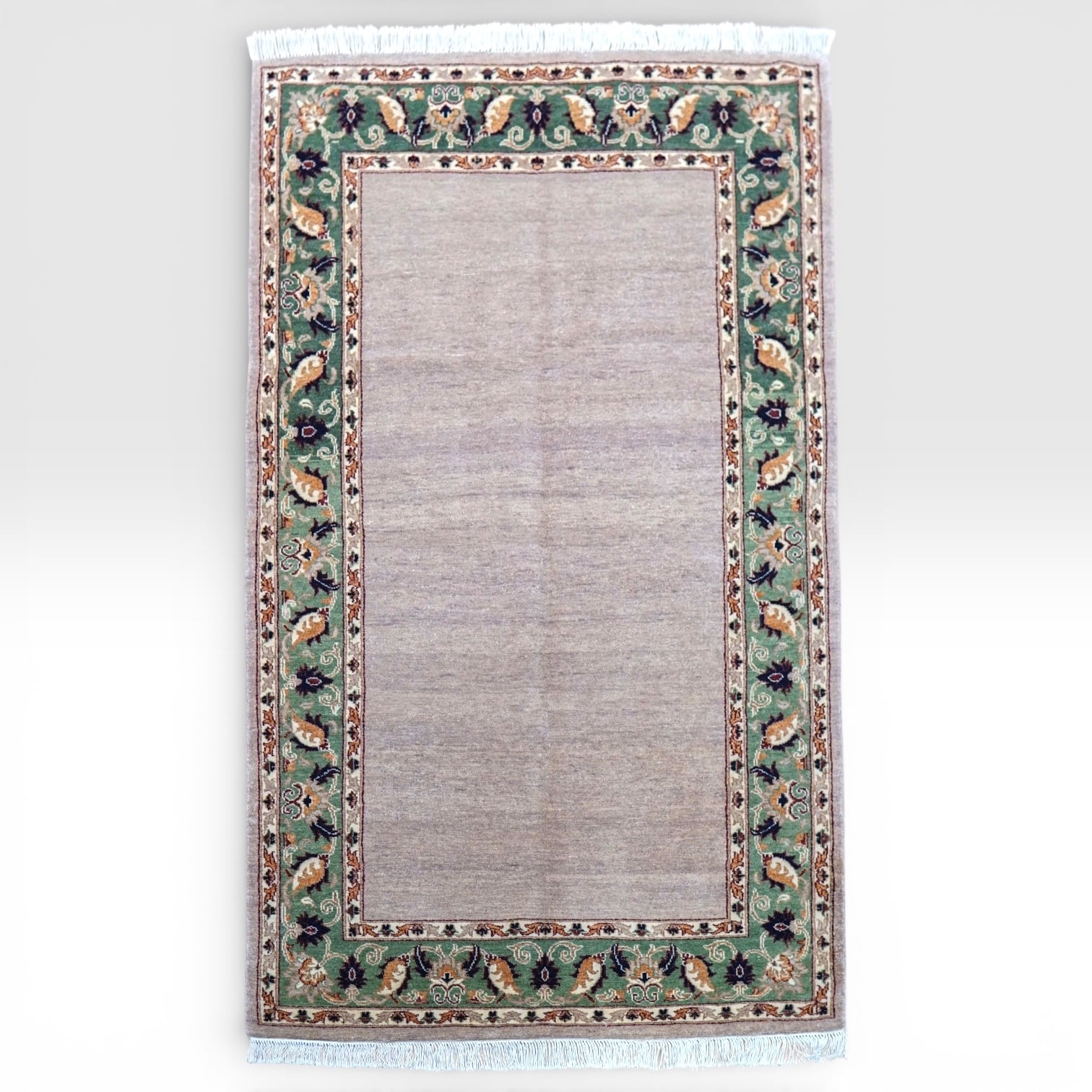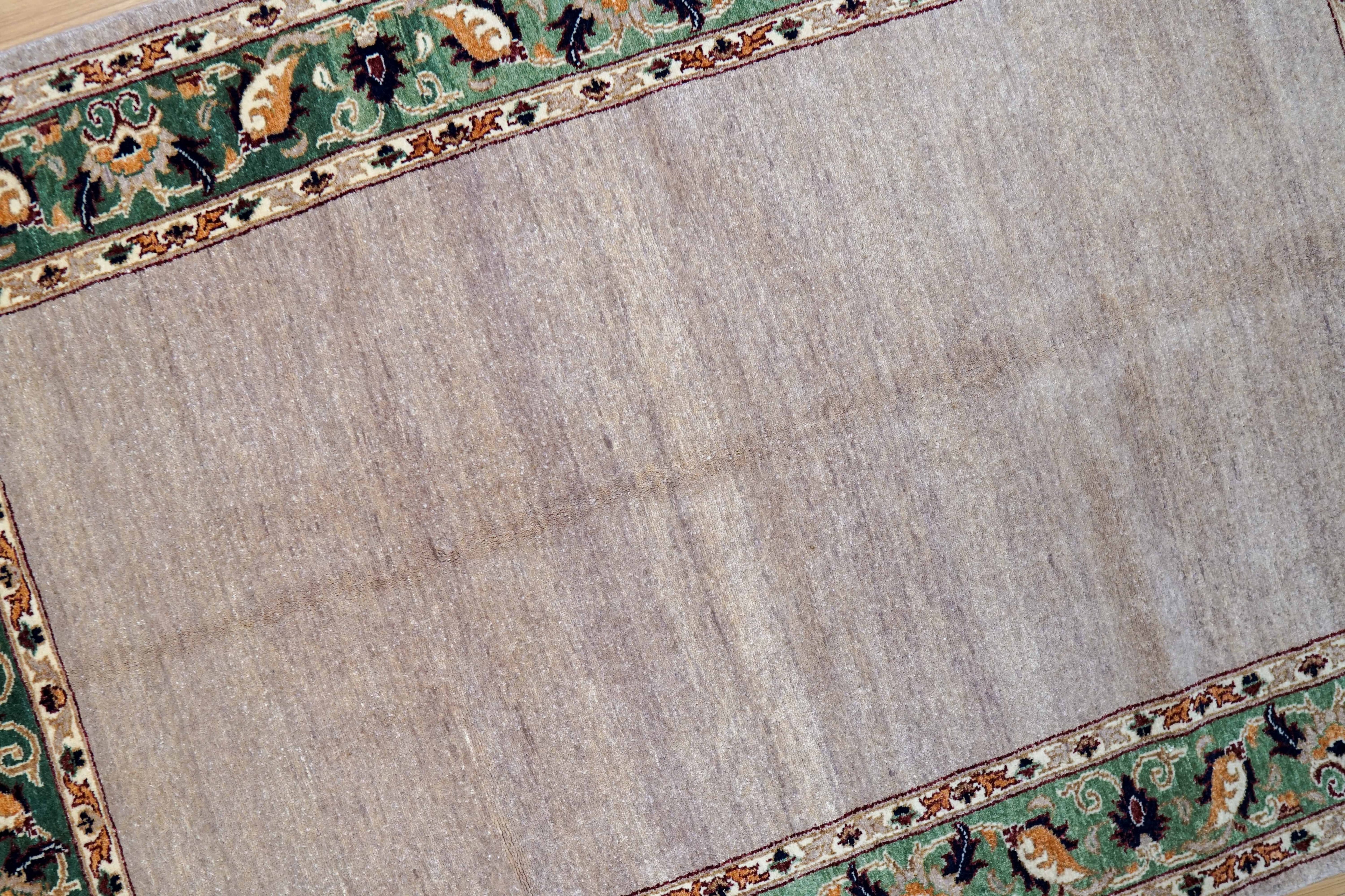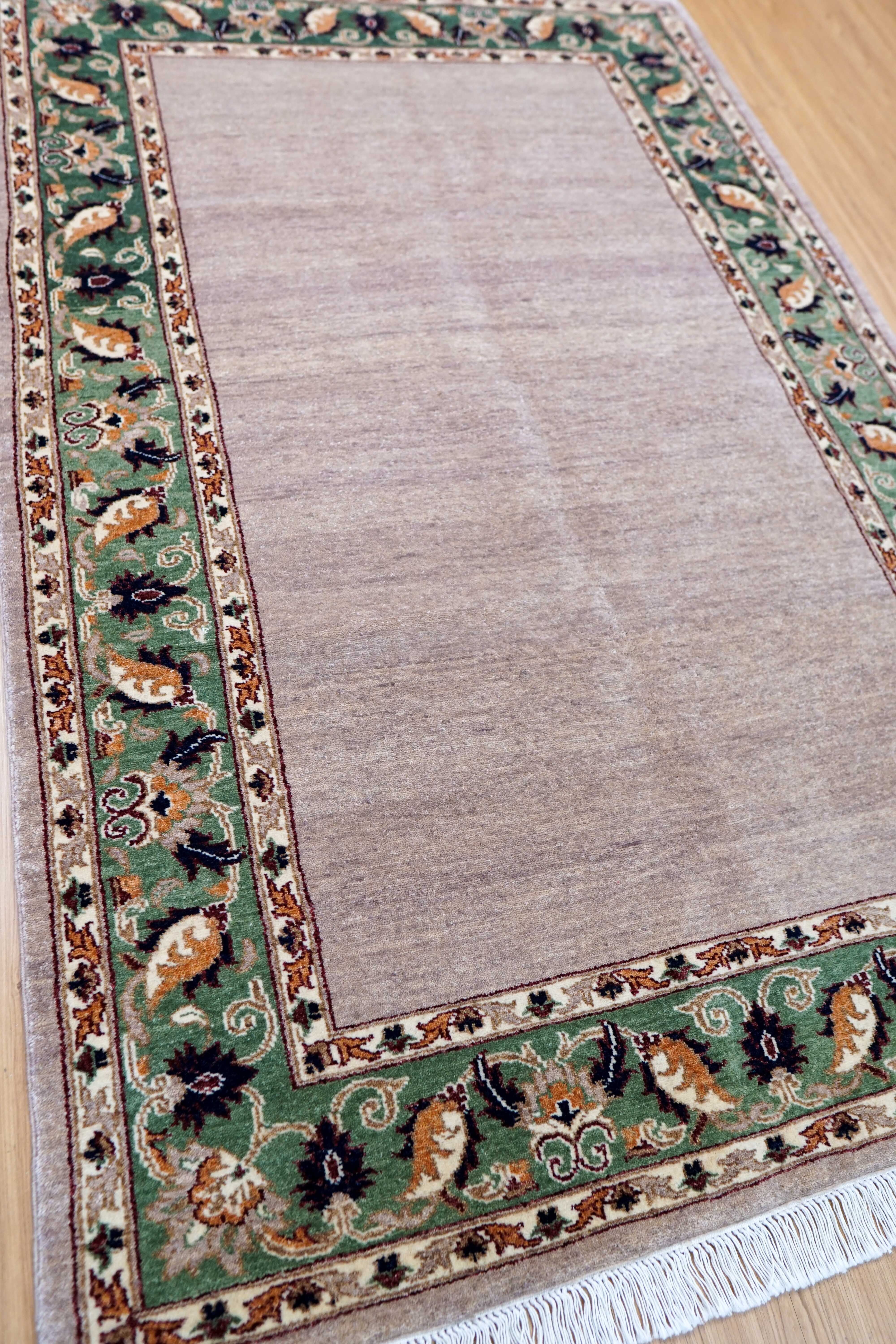 羊毛はすべて天然の植物染料で染められており、落ち着いた色合いとやさしい表情が空間に自然に馴染みます。無地に近いシンプルなフィールドに、縁取りのデザインがほどよいアクセントとなり、和洋どちらのインテリアにも合わせやすい一枚です。