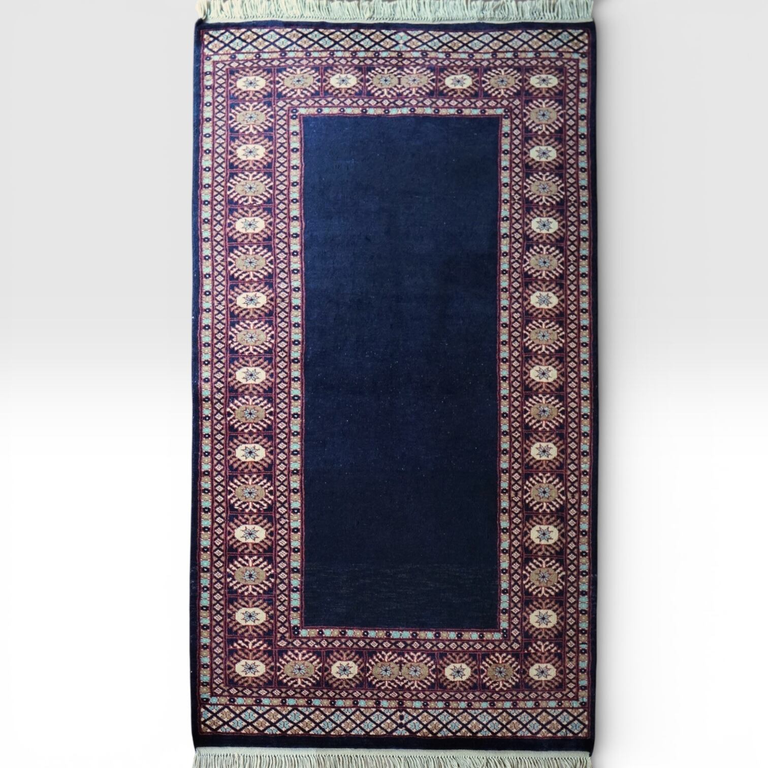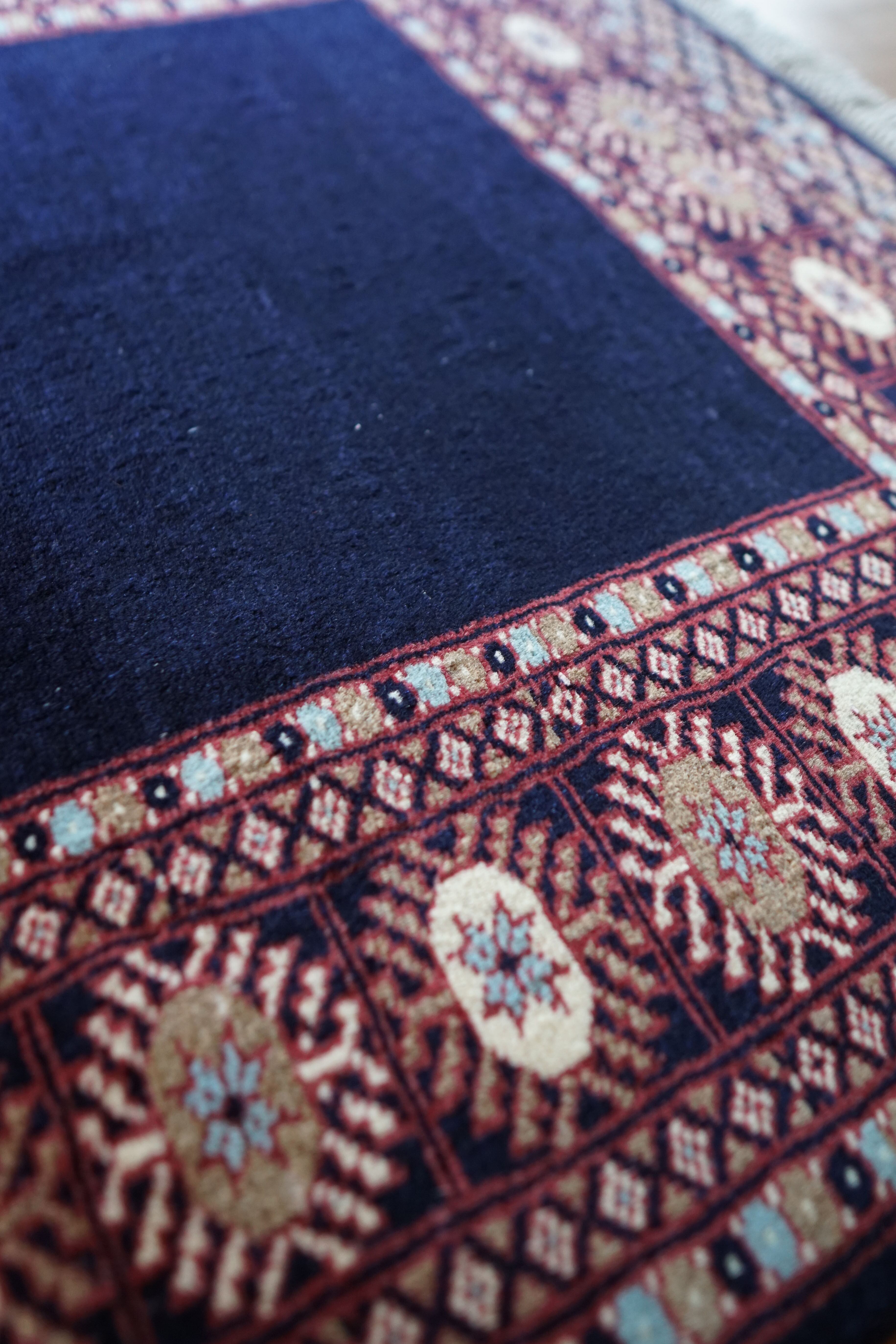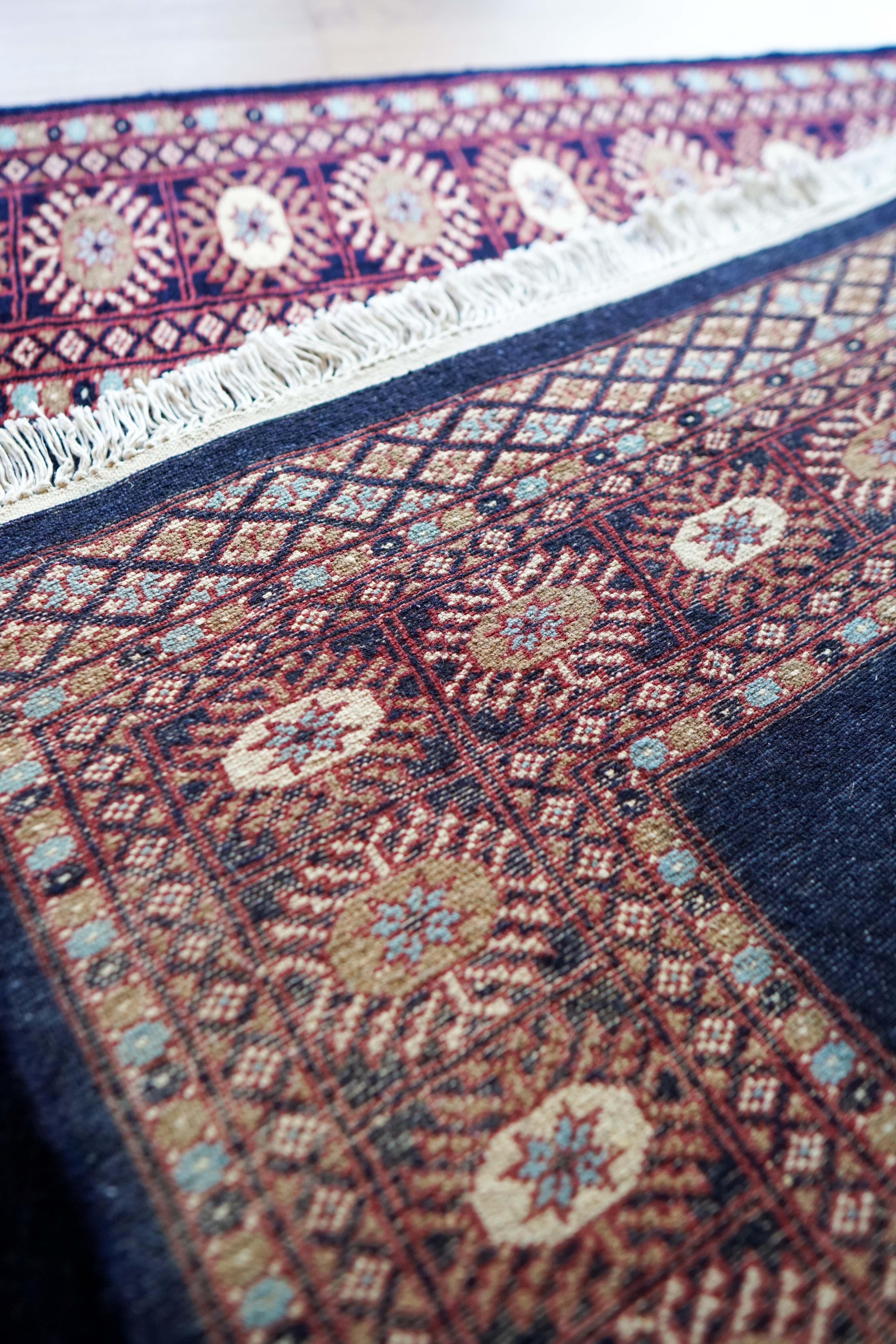 ニュージーランド産の上質なウールを使用し、信頼できる熟練した職人が手織りしたパキスタン絨毯です。ニュージーランド産のウールはタンパク質をたくさん含んでいるためハリ、艶に富むのが特徴です。肌触りはなめらかで柔らかく、弾力のあるパイル地が底冷えを防ぎ足元を快適にします。