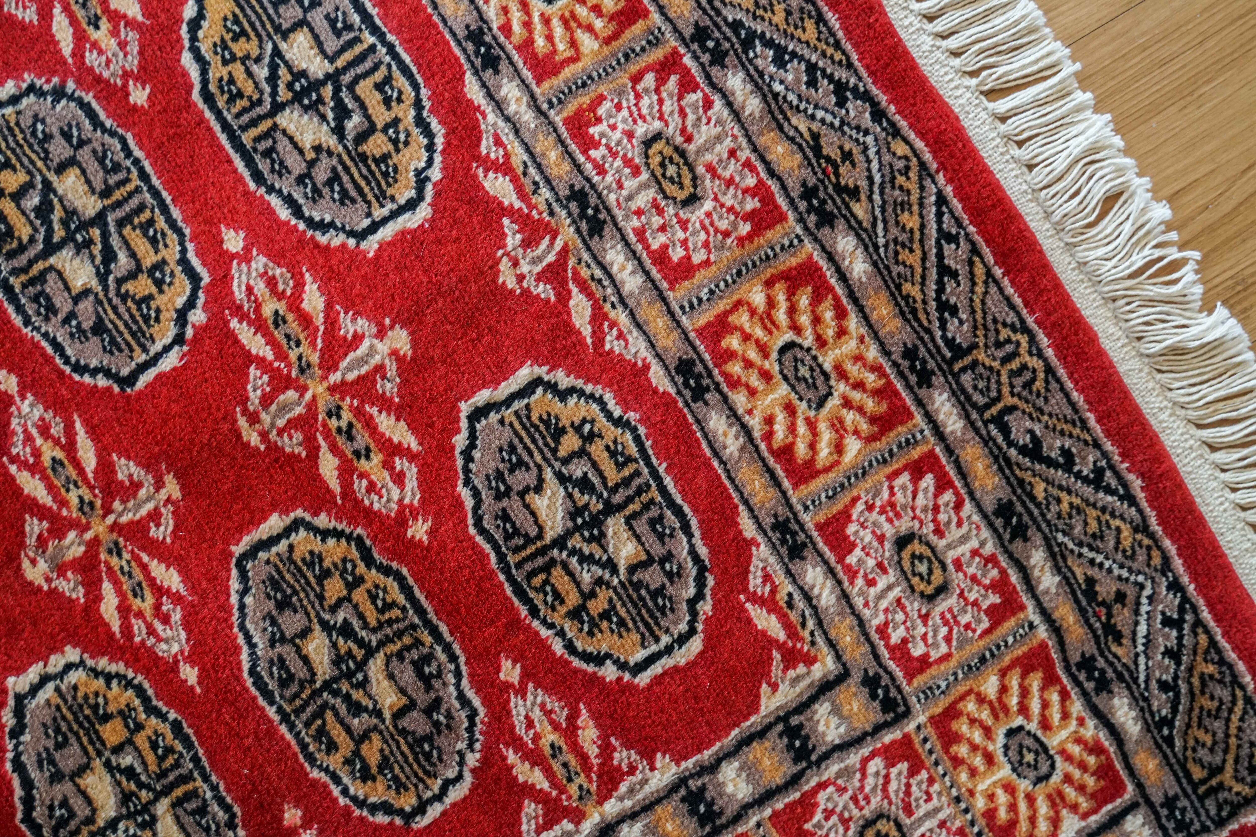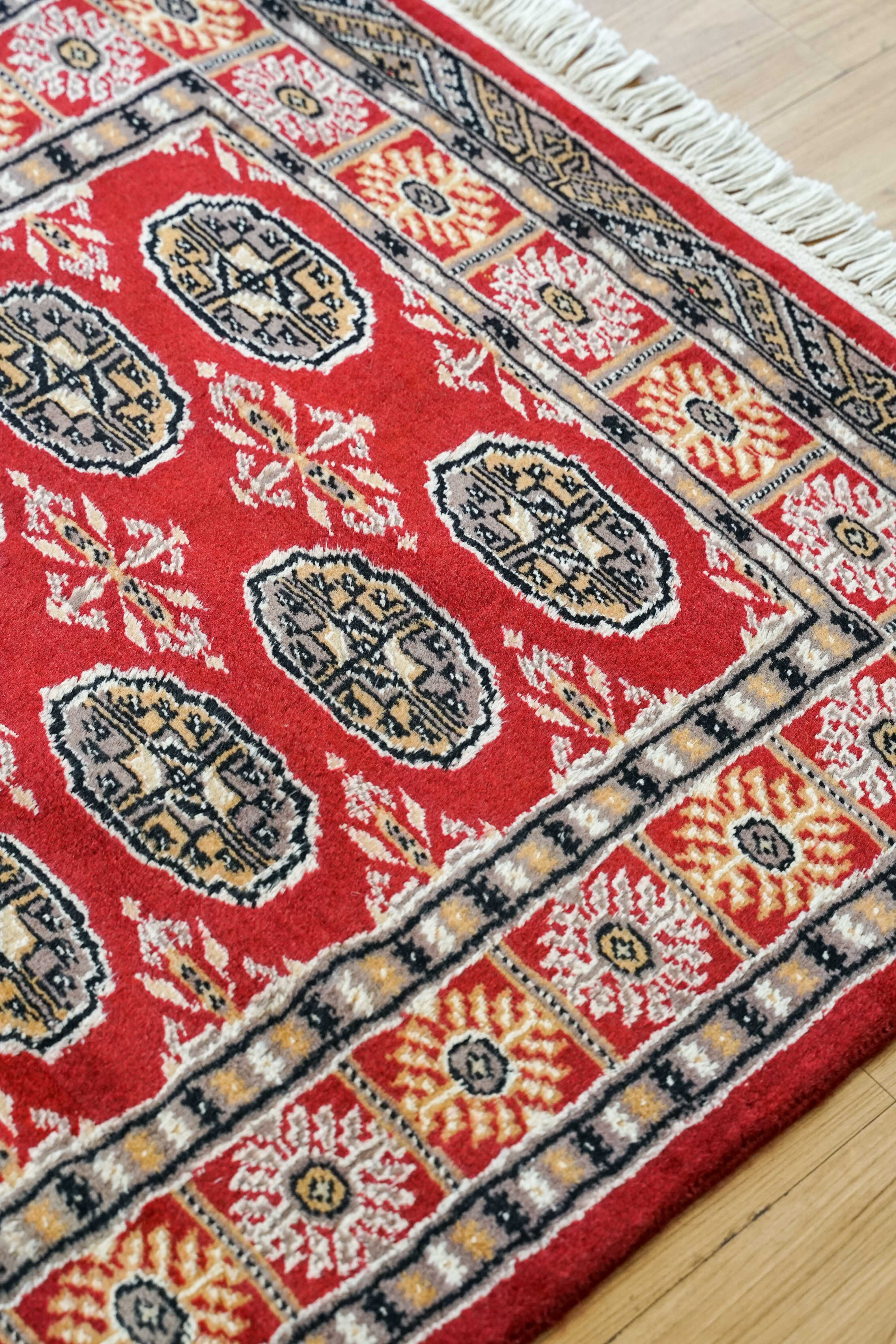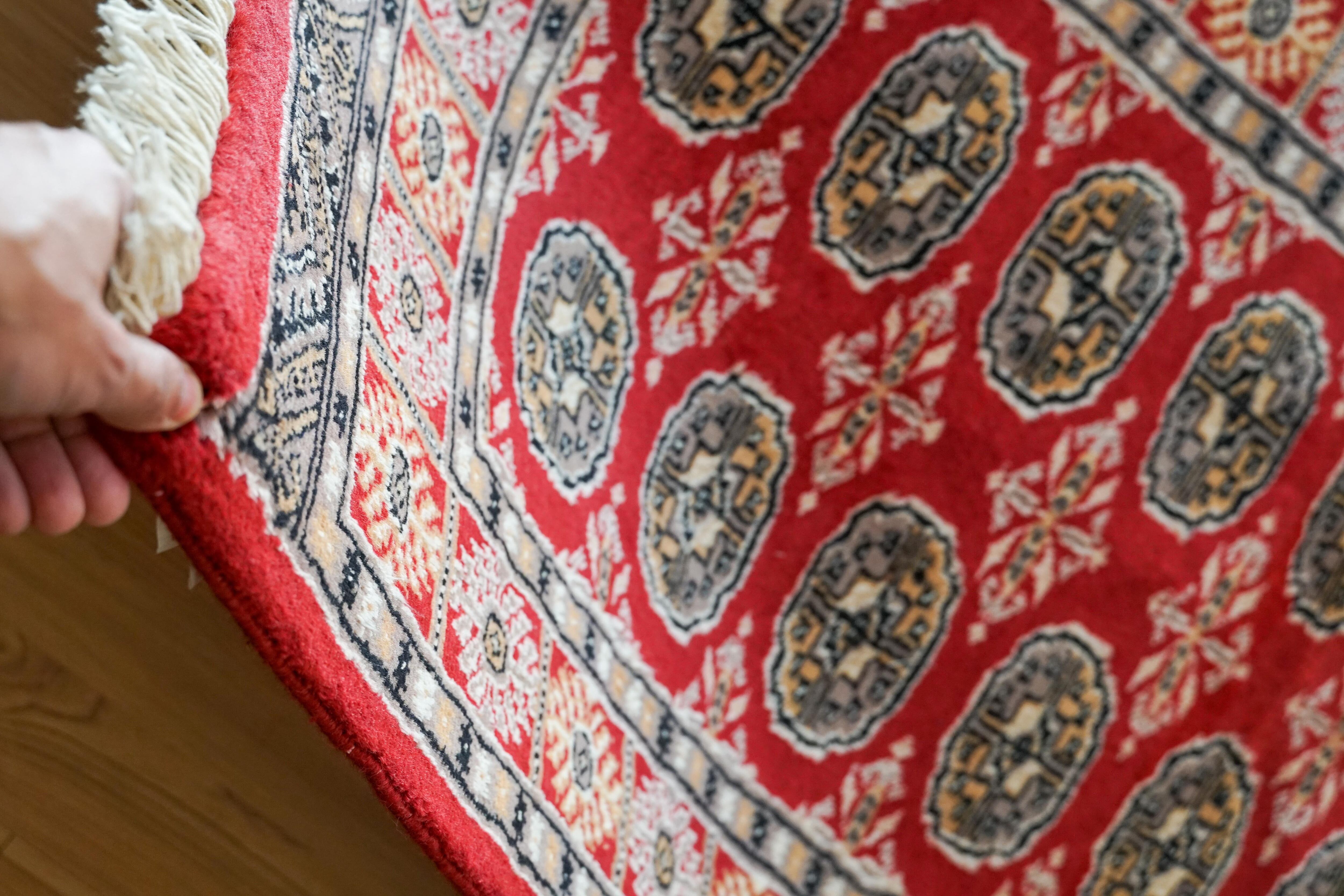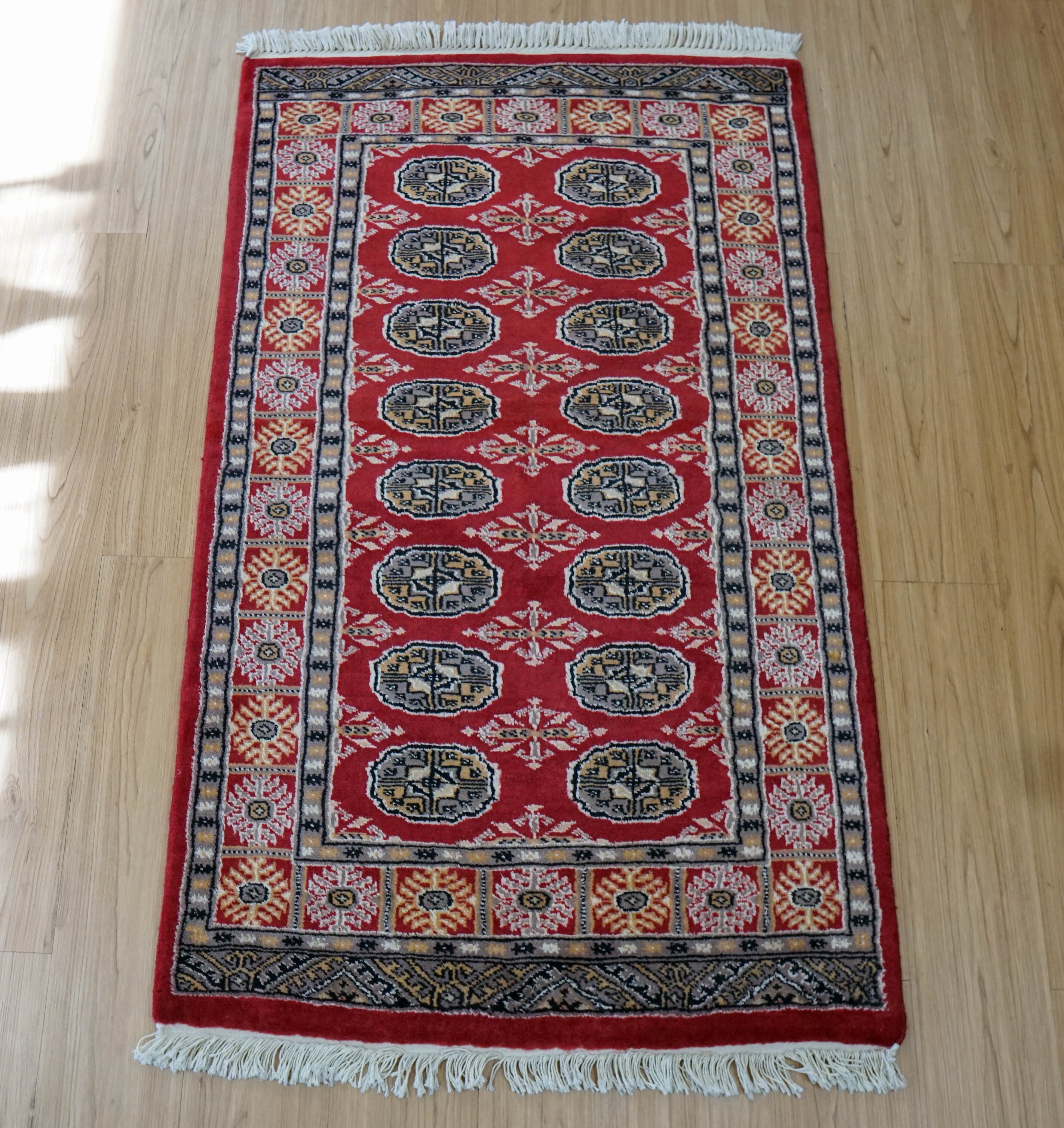パキスタンで丁寧に手織りされた、伝統的なボハラ(トルクメン)デザインのウール絨毯です。深みのある赤をベースに、繰り返し並ぶ丸紋模様が印象的で、空間に温かさと存在感をもたらします。縁取りの細かな装飾も美しく、全体にバランスの取れたデザインとなっています。