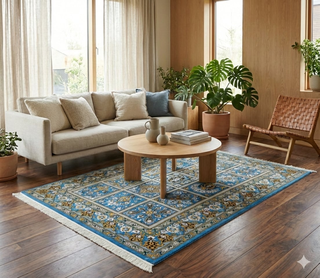 こちらは一点ものの絨毯です。リビングや寝室、書斎など、さまざまな場所で長く楽しんでいただける一枚です.