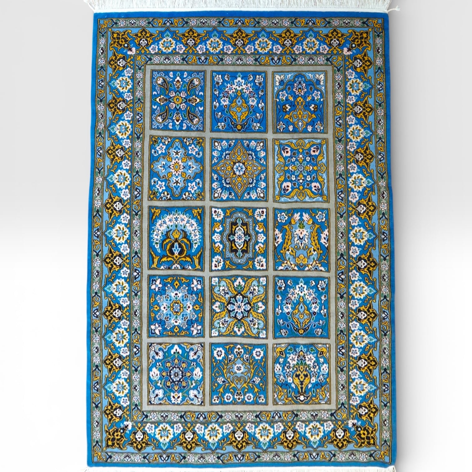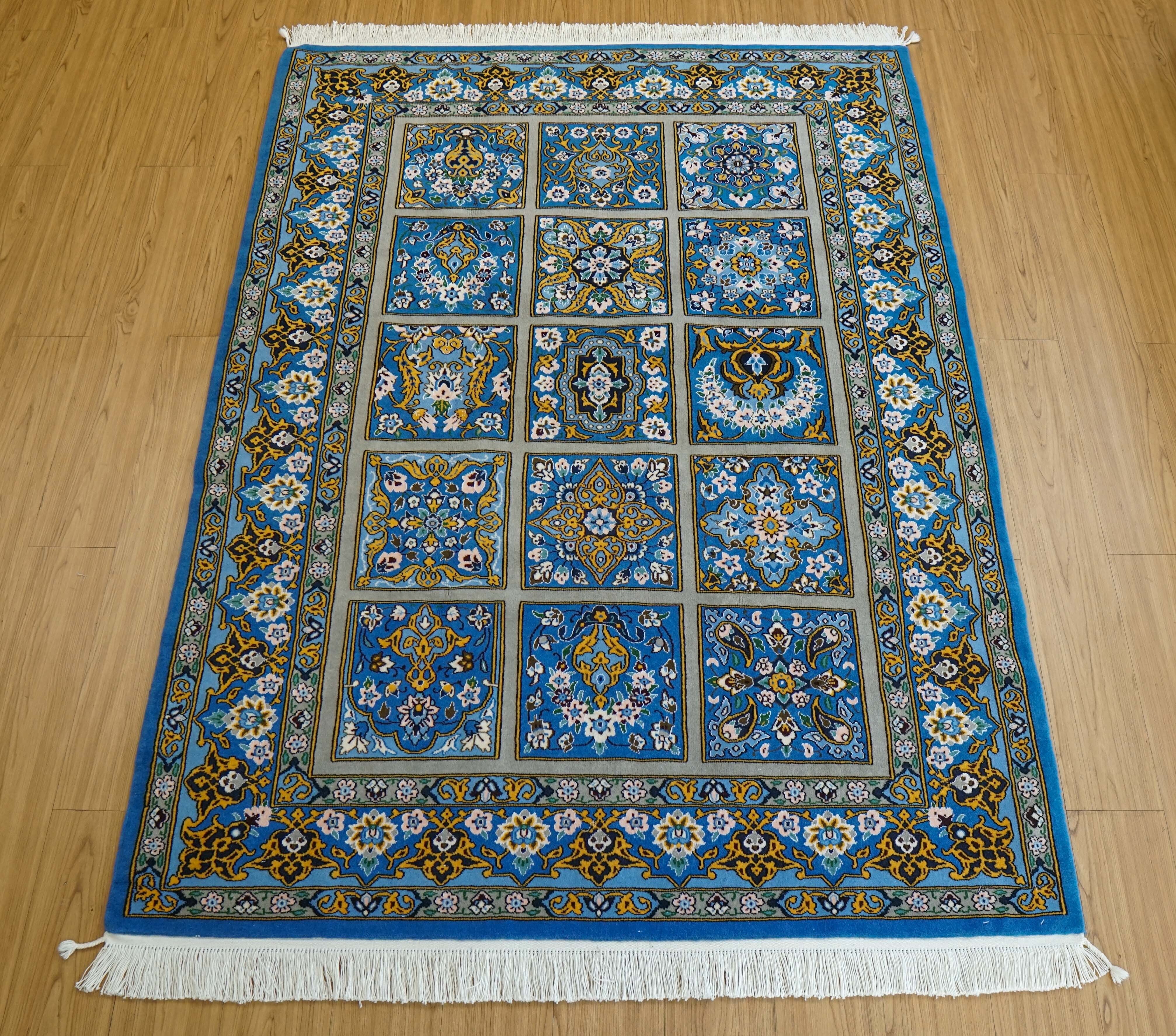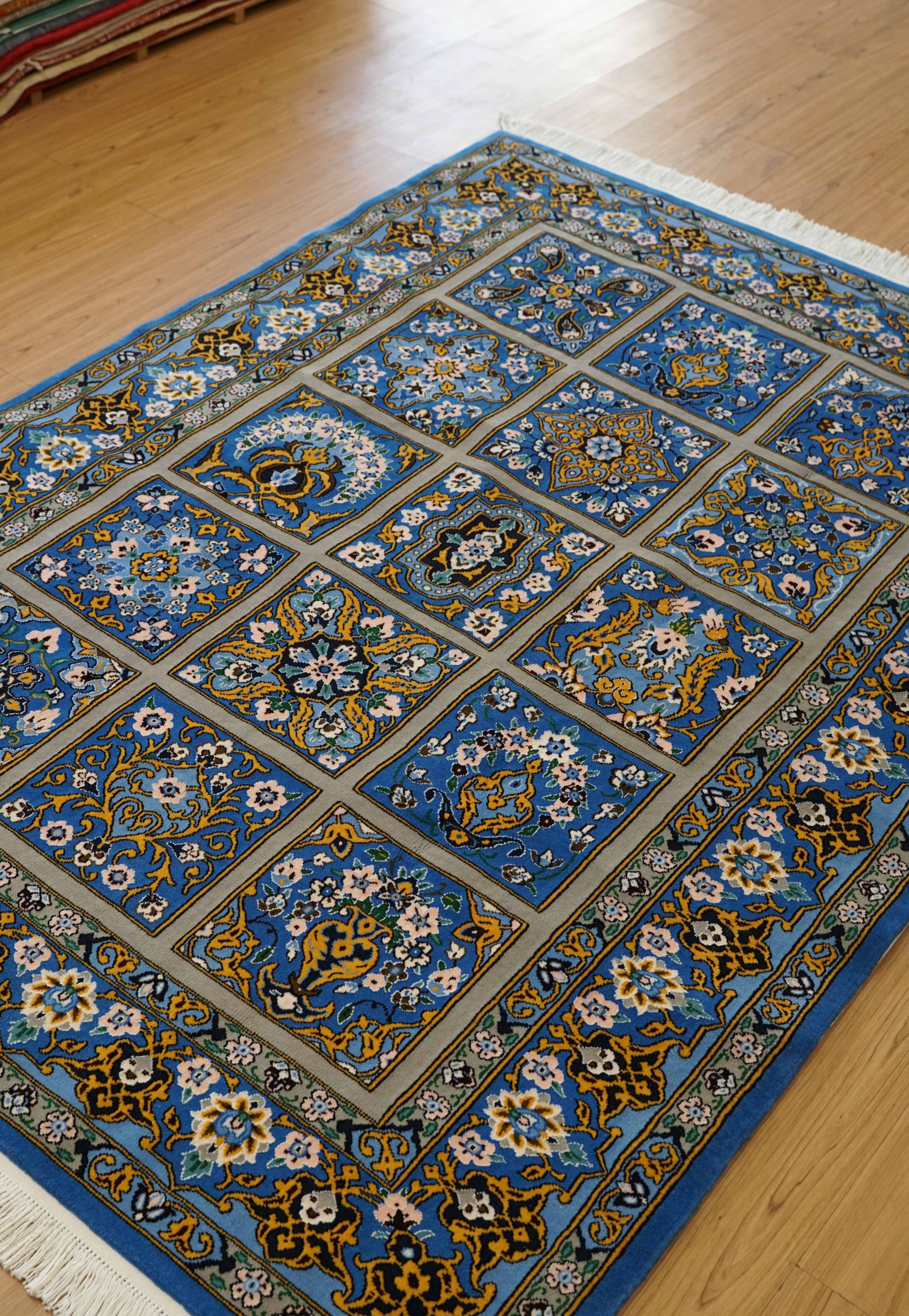 イラン・ナイン地方で手織りされたペルシャ絨毯です。イスファハン絨毯の伝統的なデザインを取り入れ、花瓶(フラワーベース)から広がる花々をモチーフにした優雅な構図が特徴です。区画ごとに描かれた繊細な花文様が、全体に落ち着きと華やかさを与えています。