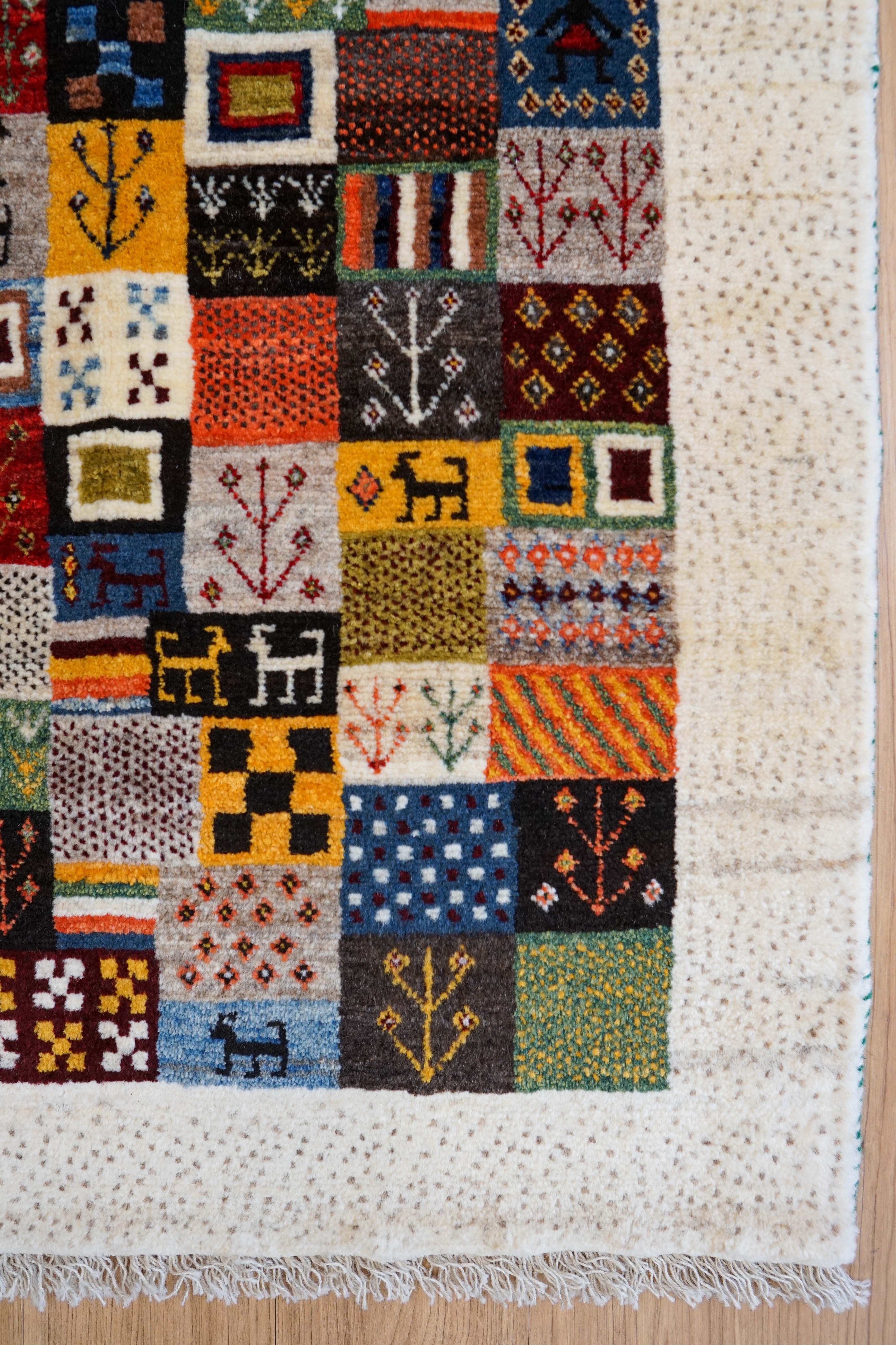 イラン シラーズ地方で遊牧民族によって手織りされたギャッベ。ギャッベの中でも織りが細かい『カシュクリ』と呼ばれるグレードの高いものです。結び目の密度が高いため織り上げるのに一般的なギャッベより時間を要しますが、柄は鮮明になり踏み心地も抜群です。