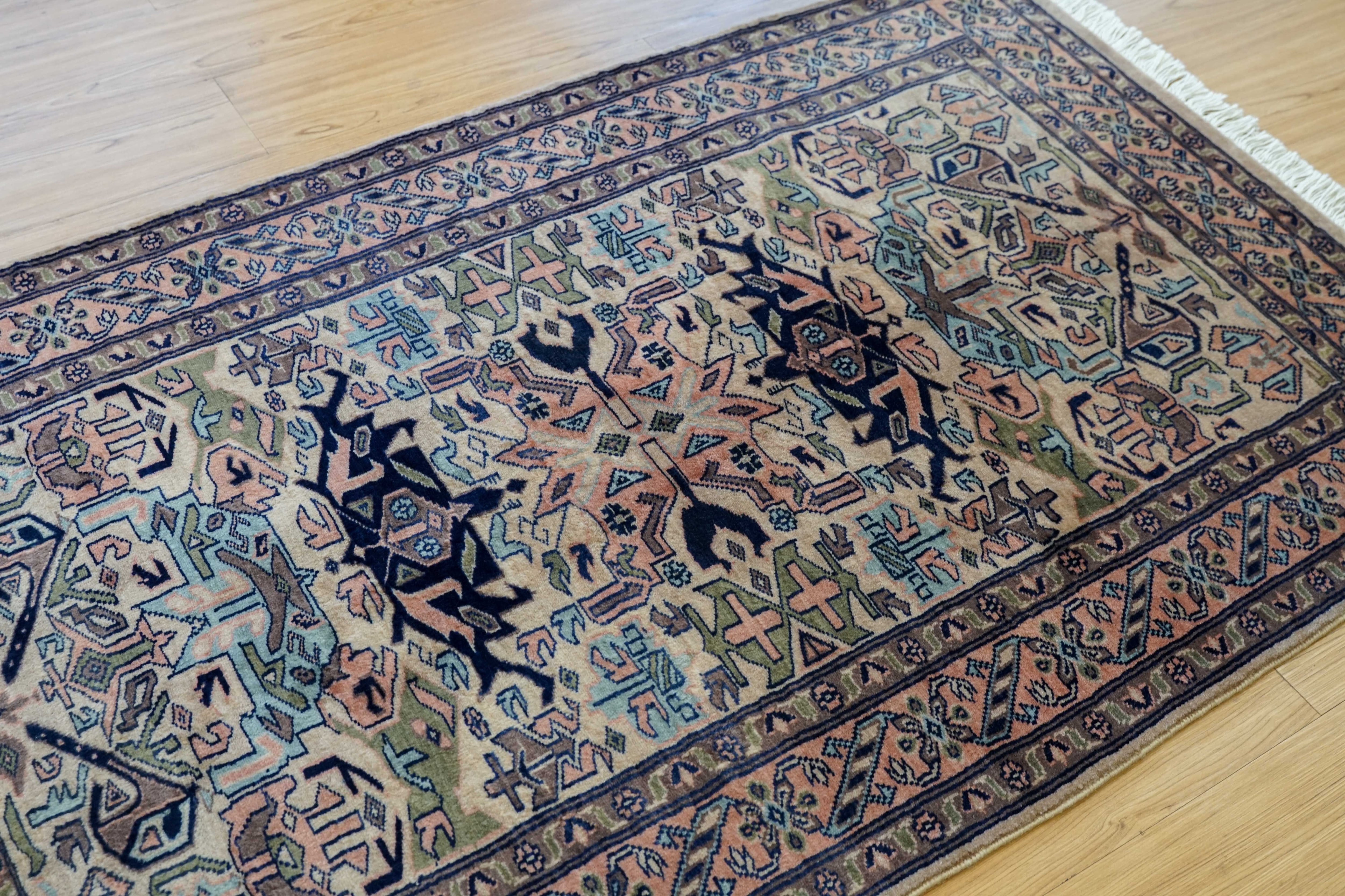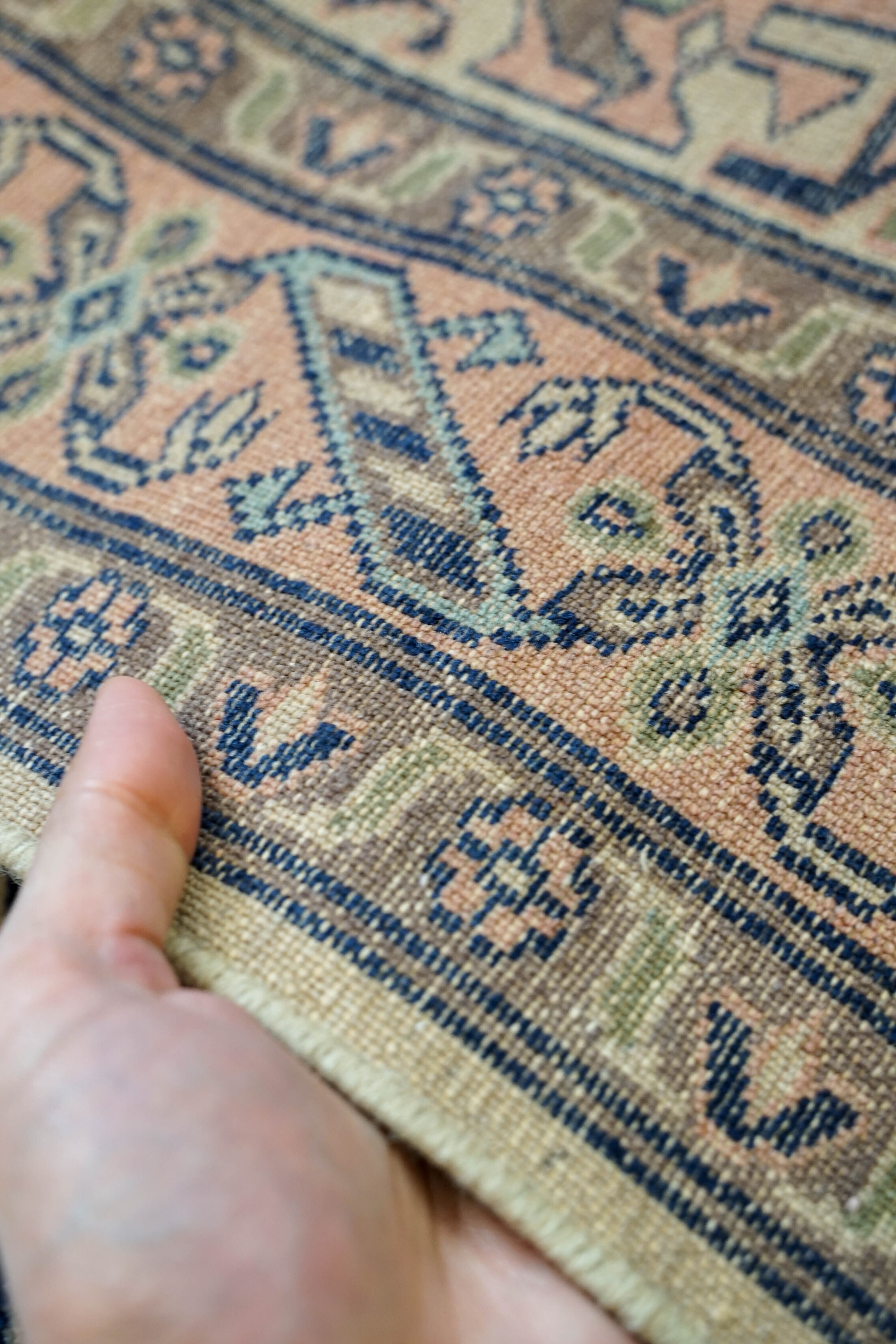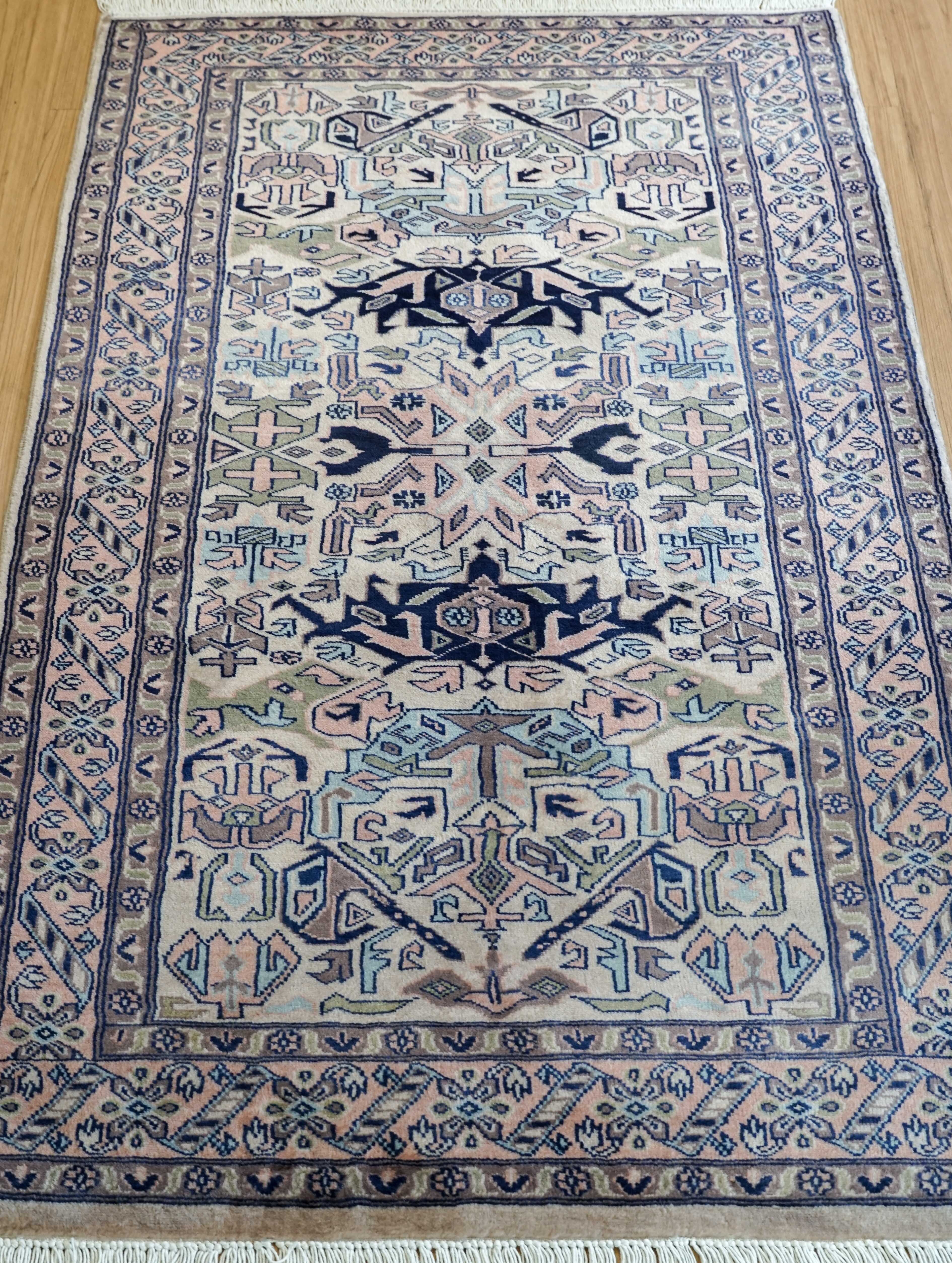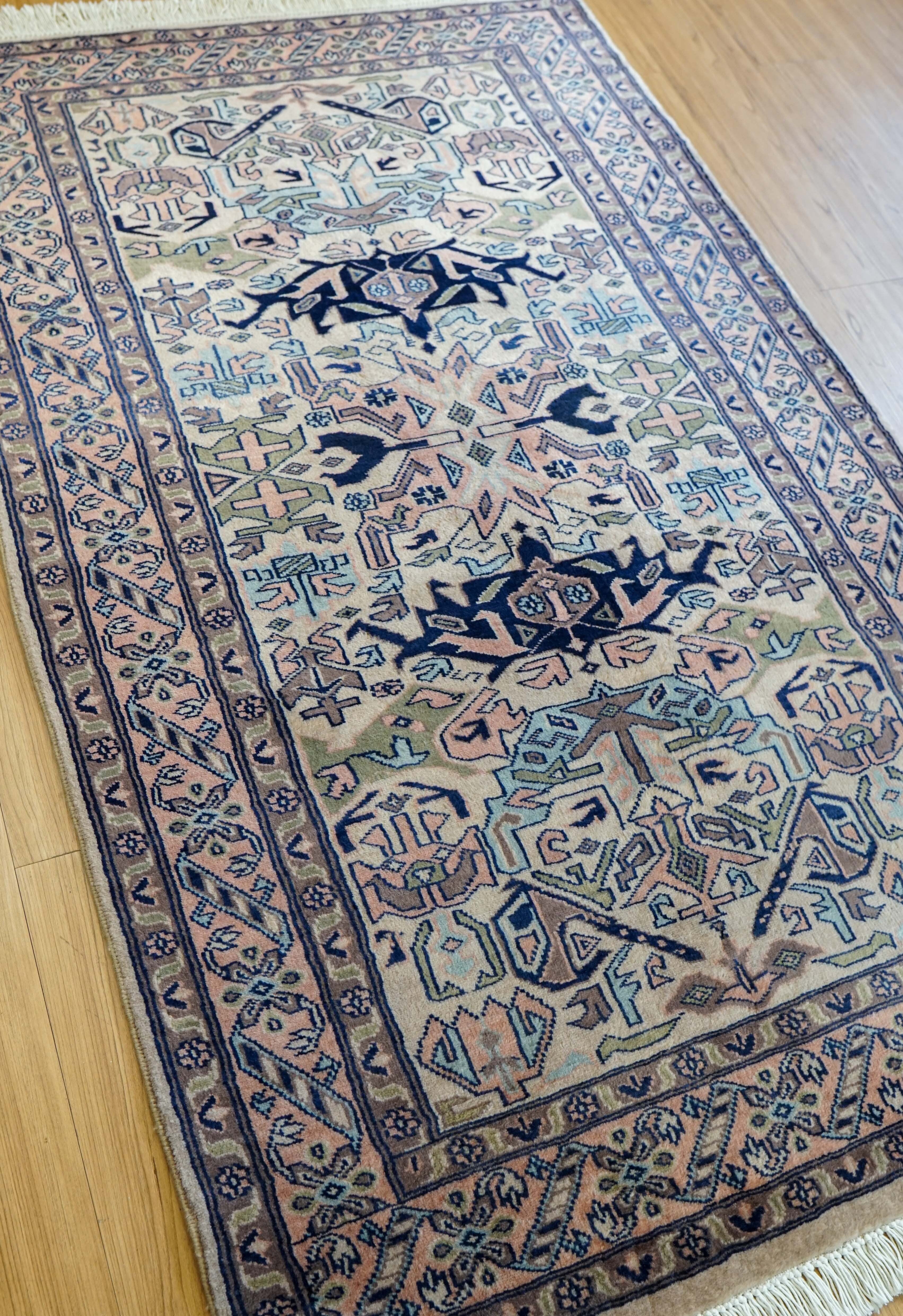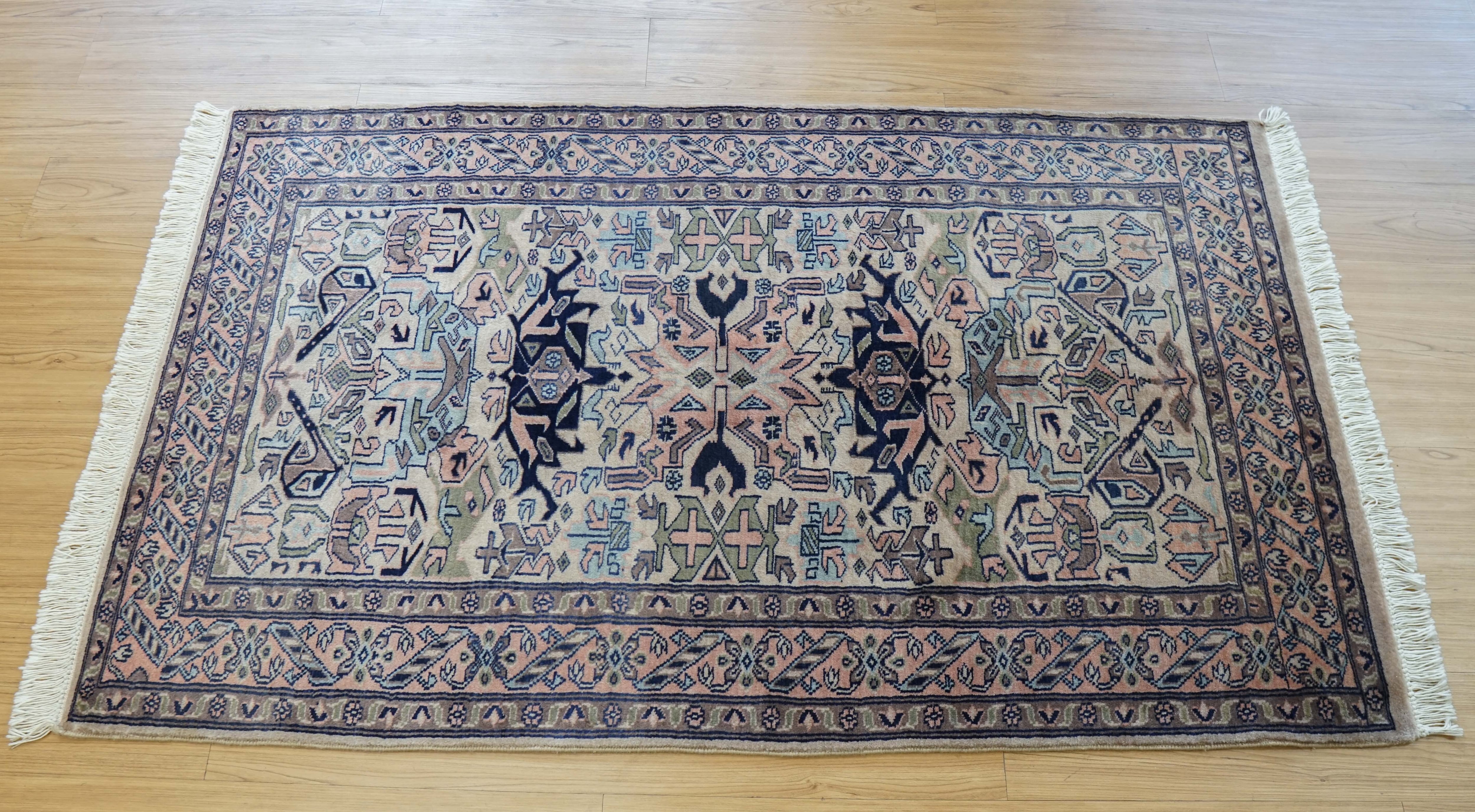 パキスタン絨毯は実用性を重視して作られてきた歴史があり、耐久性に優れている点が魅力です。本品も長く使うことを前提とした作りで、使い込むほどにウールの表情が落ち着いていきます。