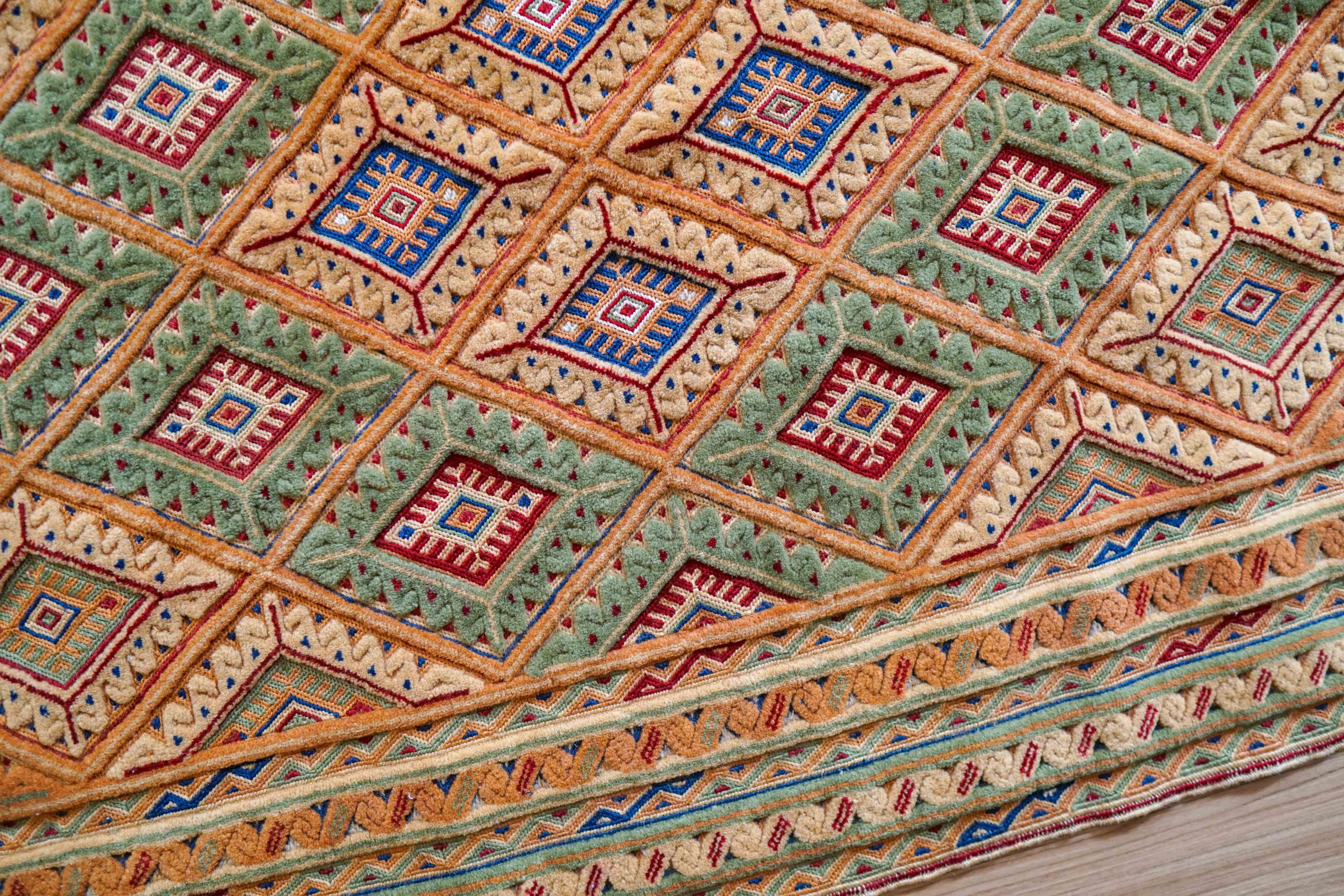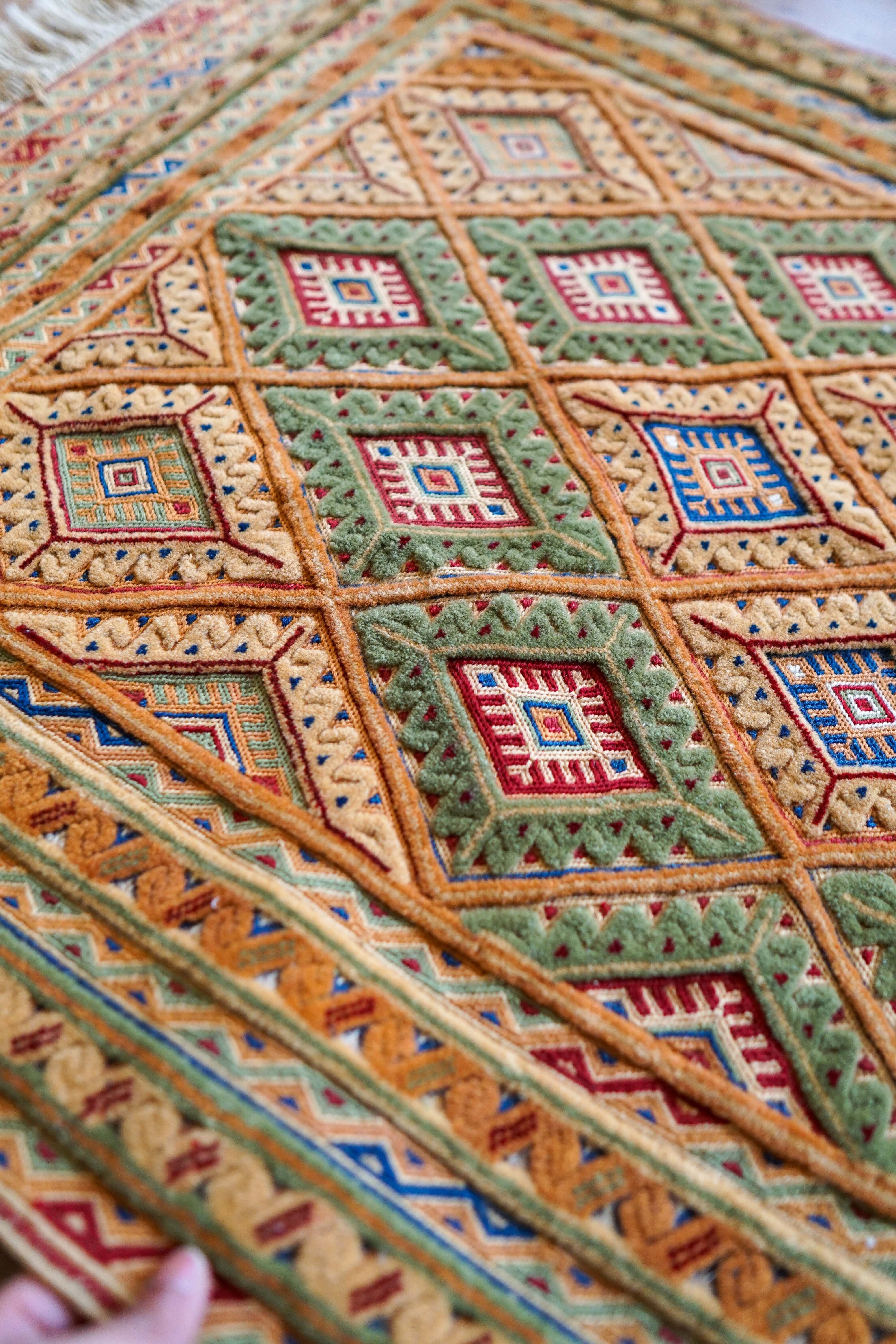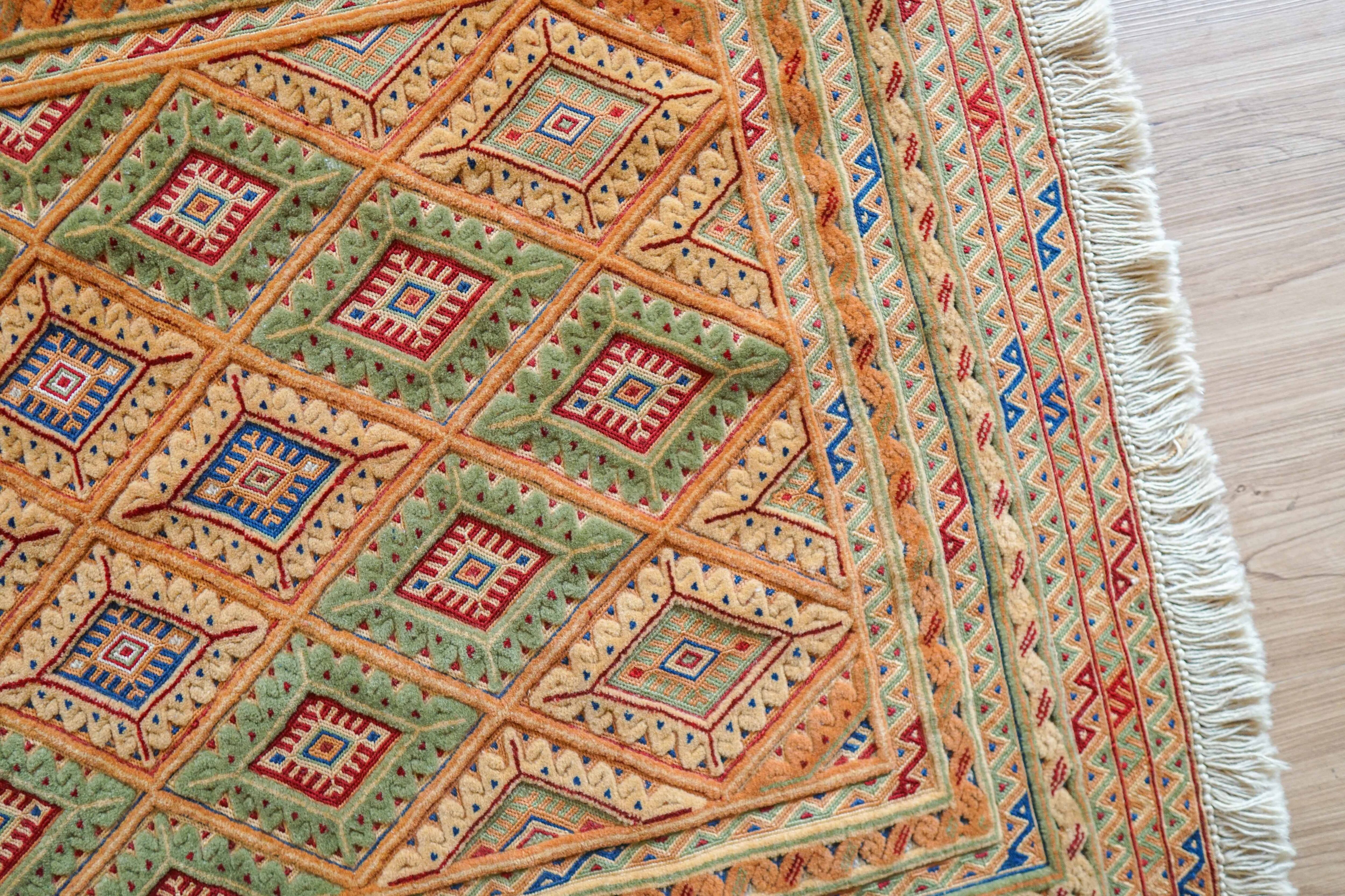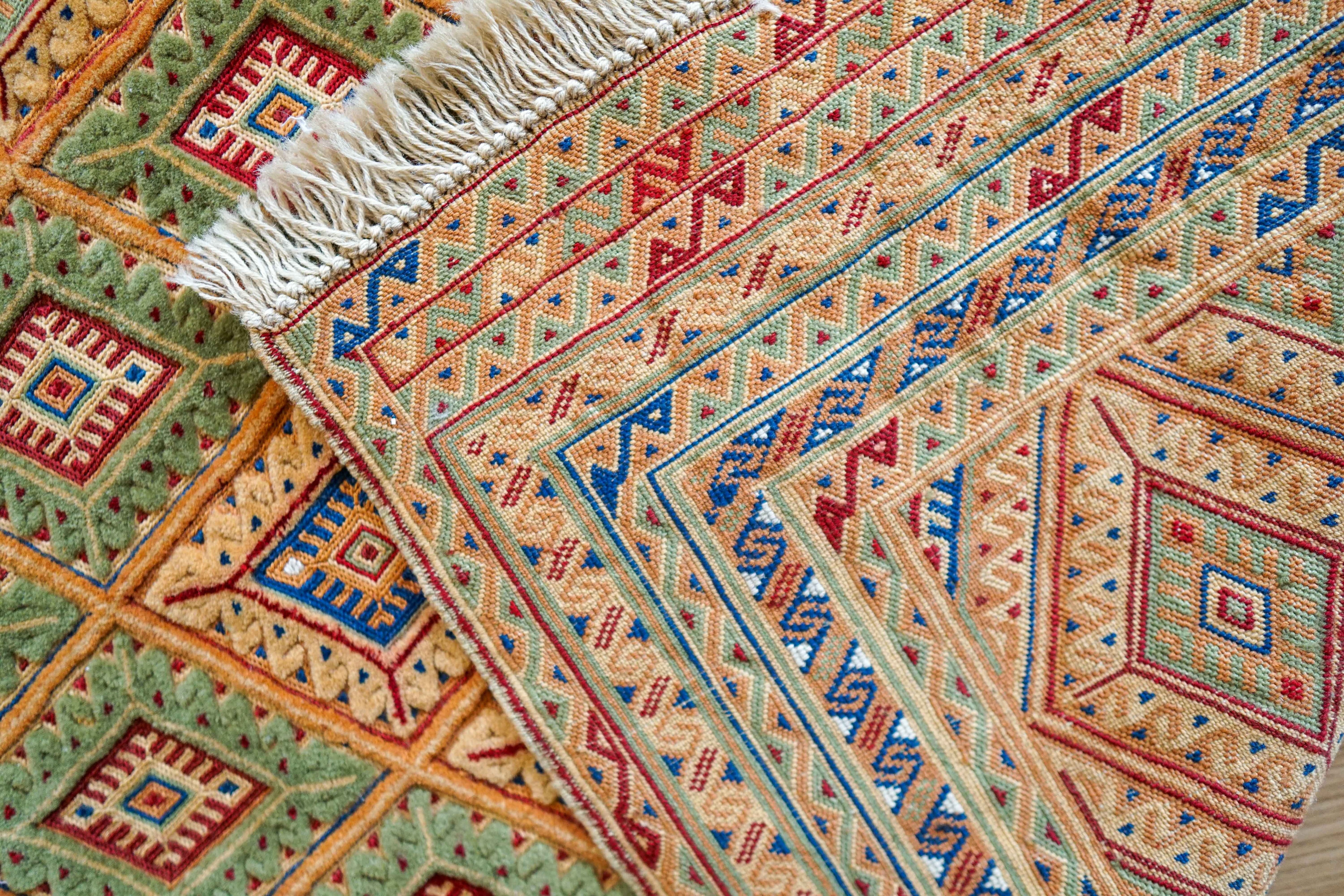 毛足のない麻のような肌触りのキリムと、パイル地の絨毯部分を合わせもった凸凹のある絨毯で、幾何学的なデザインが美しく、踏み心地も大変良いです。