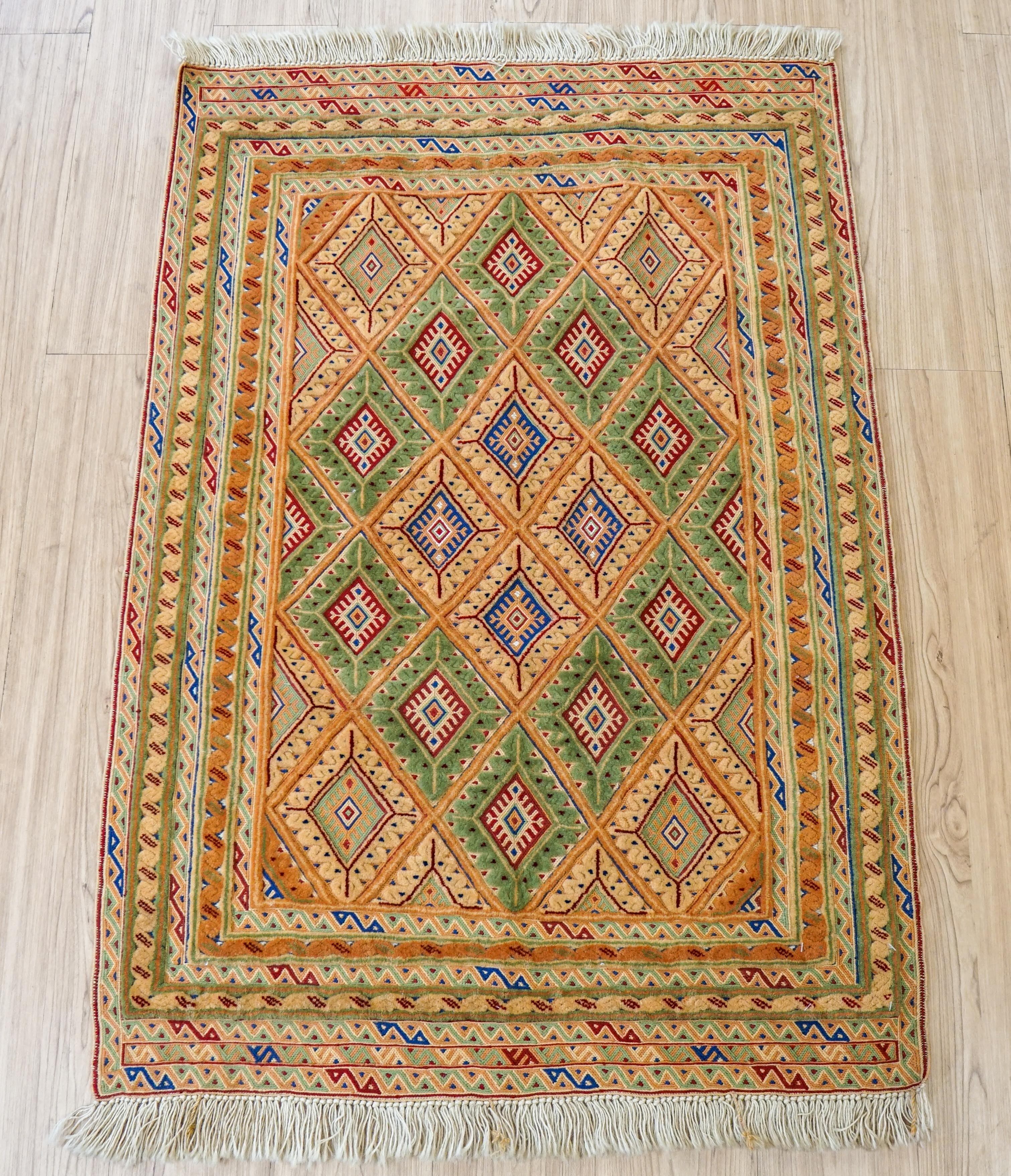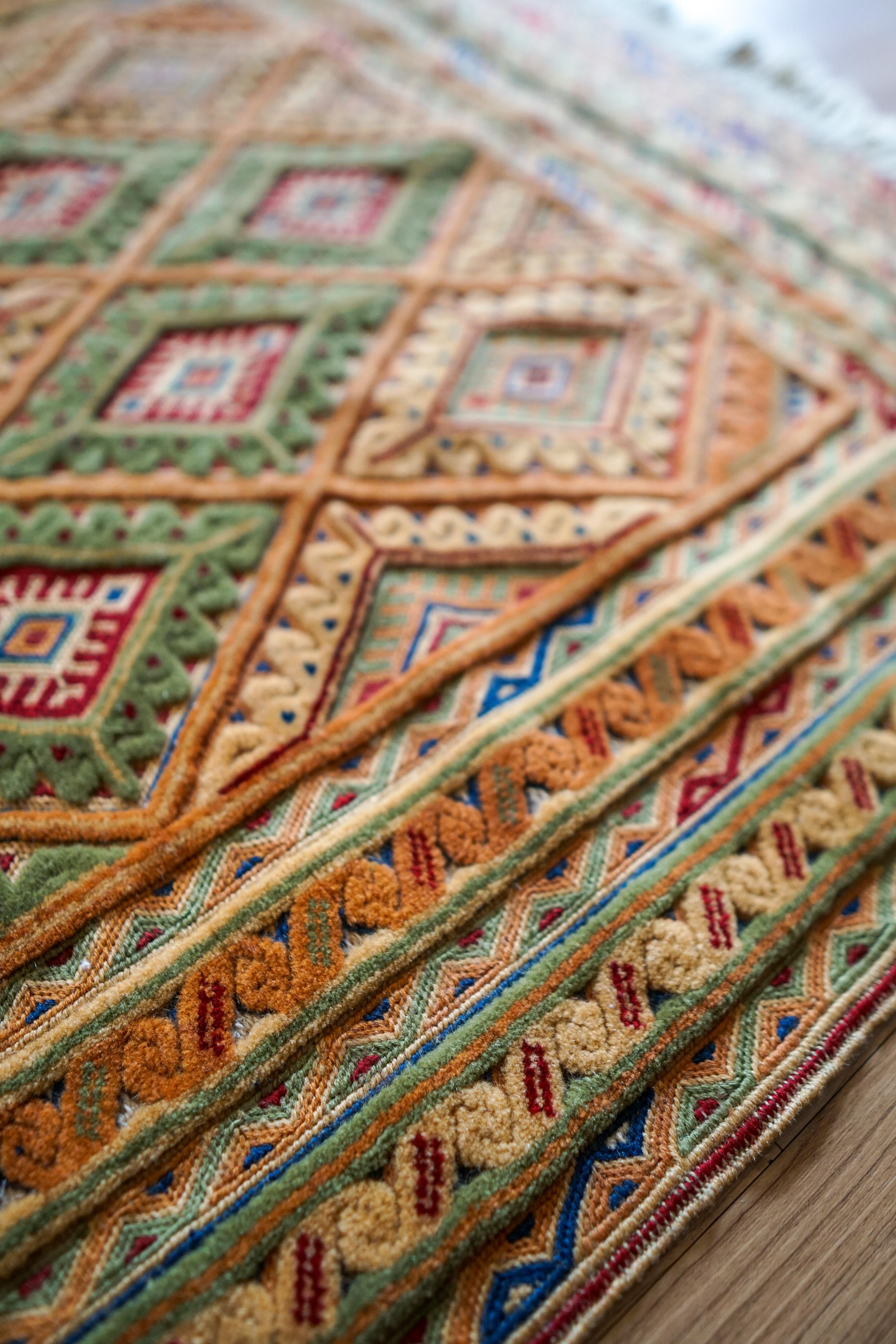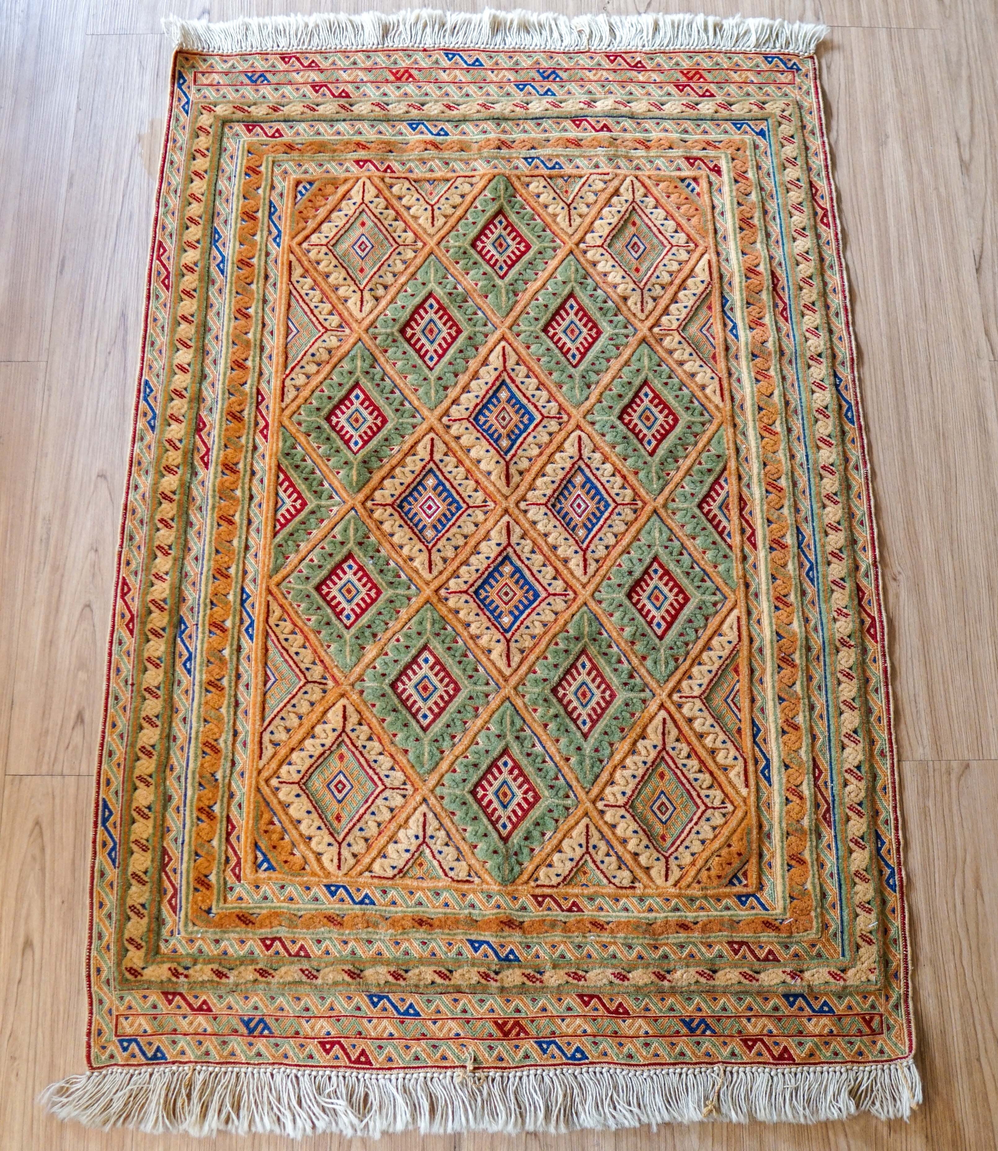 毛足のない麻のような肌触りのキリムと、パイル地の絨毯部分を合わせもった凸凹のある絨毯で、幾何学的なデザインが美しく、踏み心地も大変良いです。